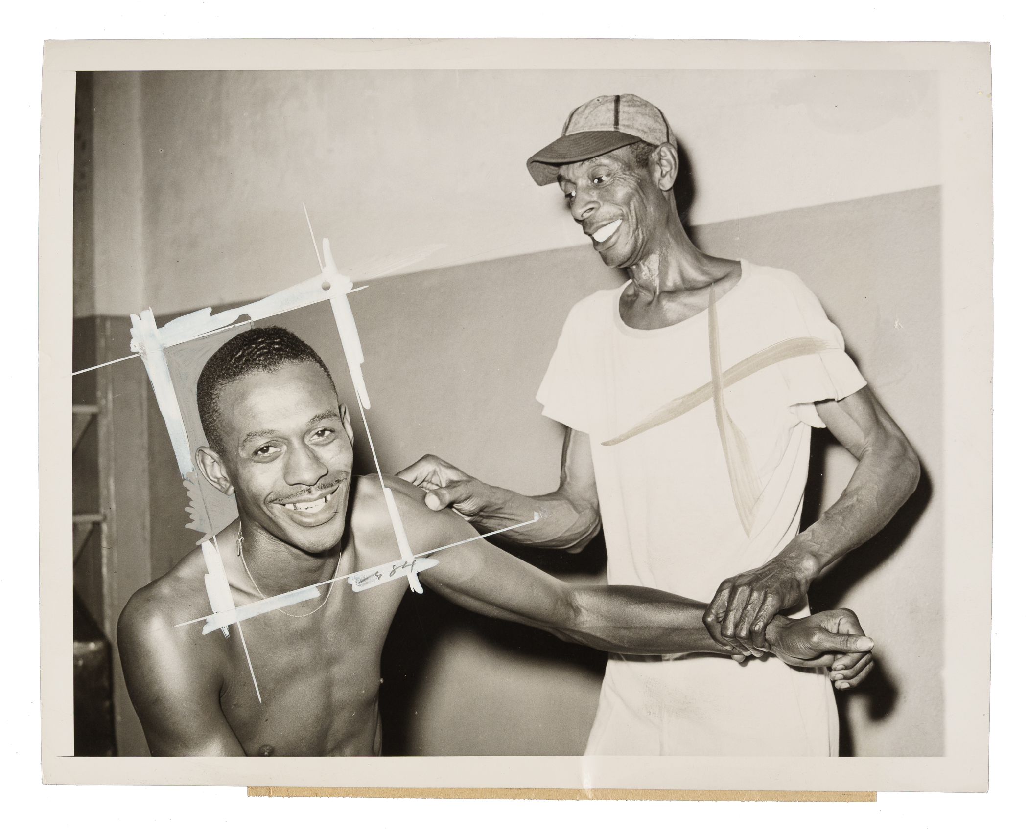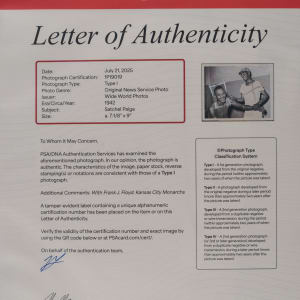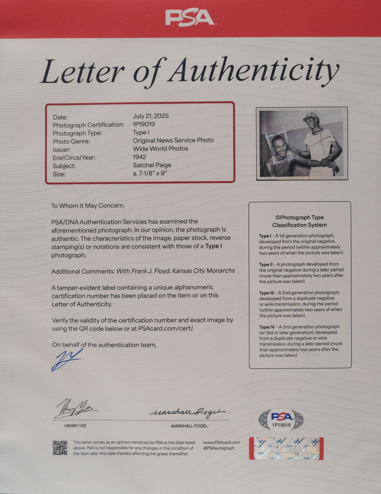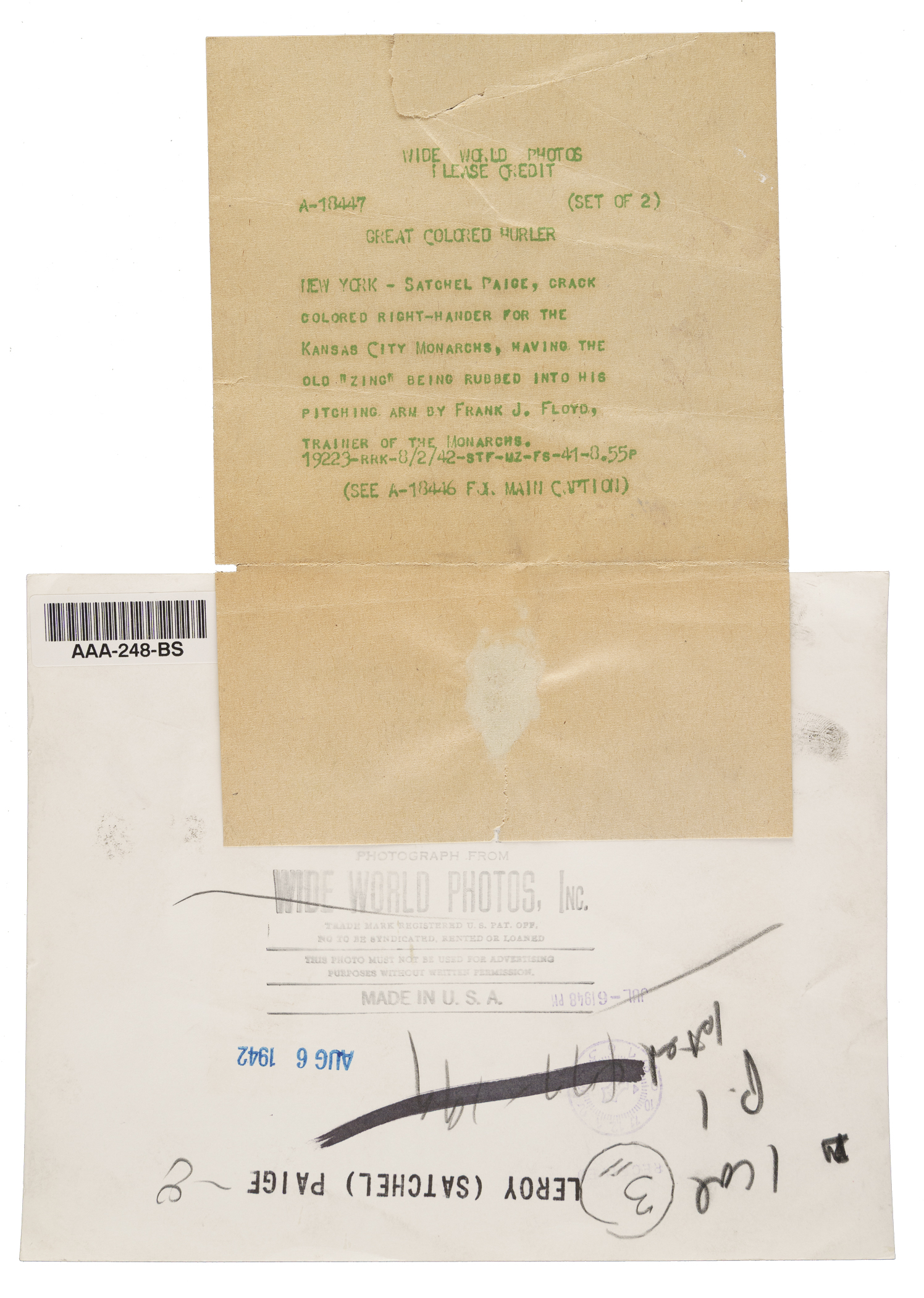 Original news photo of Hall of Fame pitcher Satchel Paige. Certified as an original Type 1 photograph by PSA/DNA. The photo captures Paige during the 1942 season as a member of the Kansas City Monarchs, having his arm worked on by team trainer Frank Floyd. The original paper news caption dated "8/2/42" appears on the reverse, as does Paige's name and a few editorial notations. The photo (7-1/8 x 9 inches) displays scattered light creasing and is in Very Good condition overall. Full LOA from PSA/DNA.
