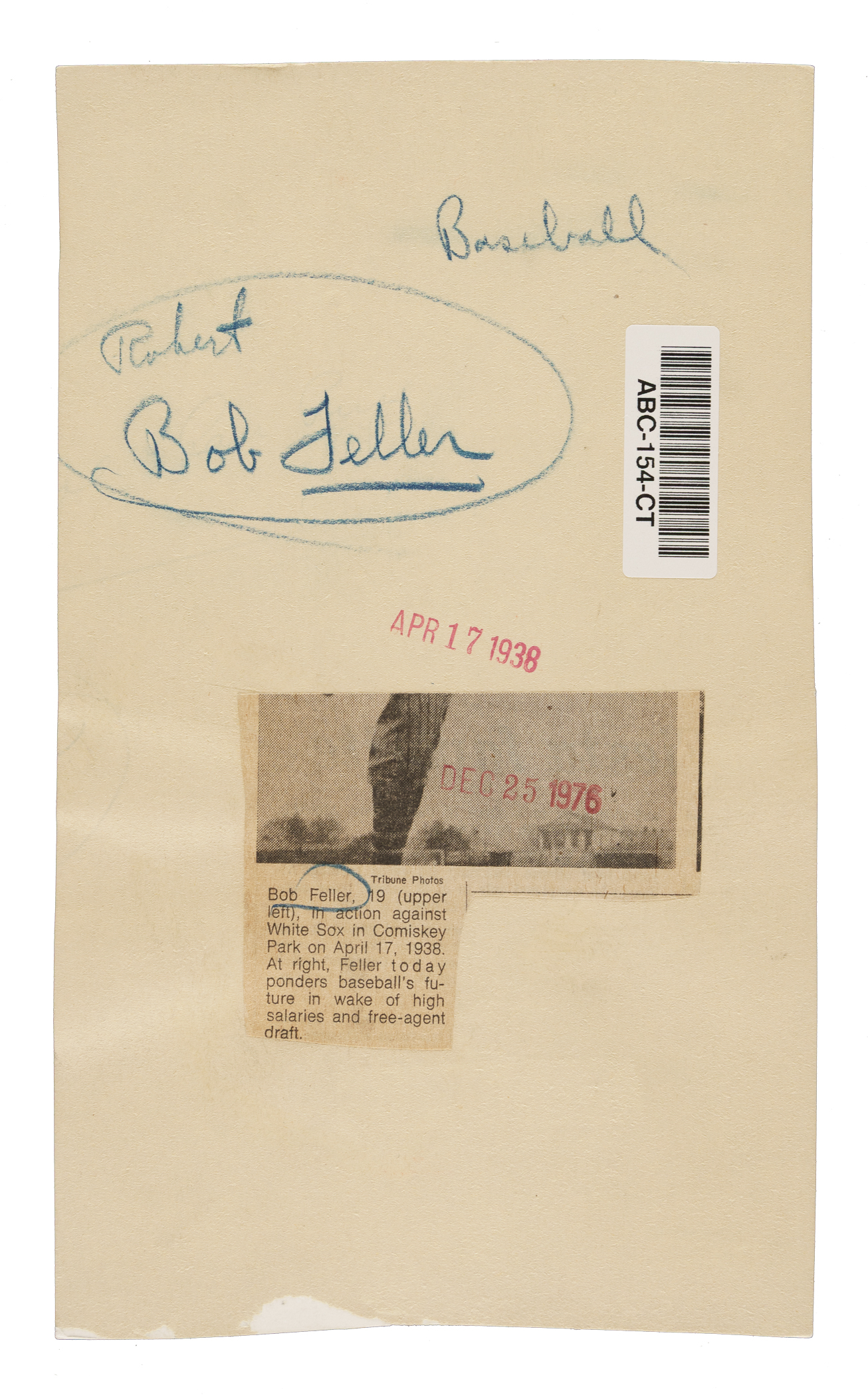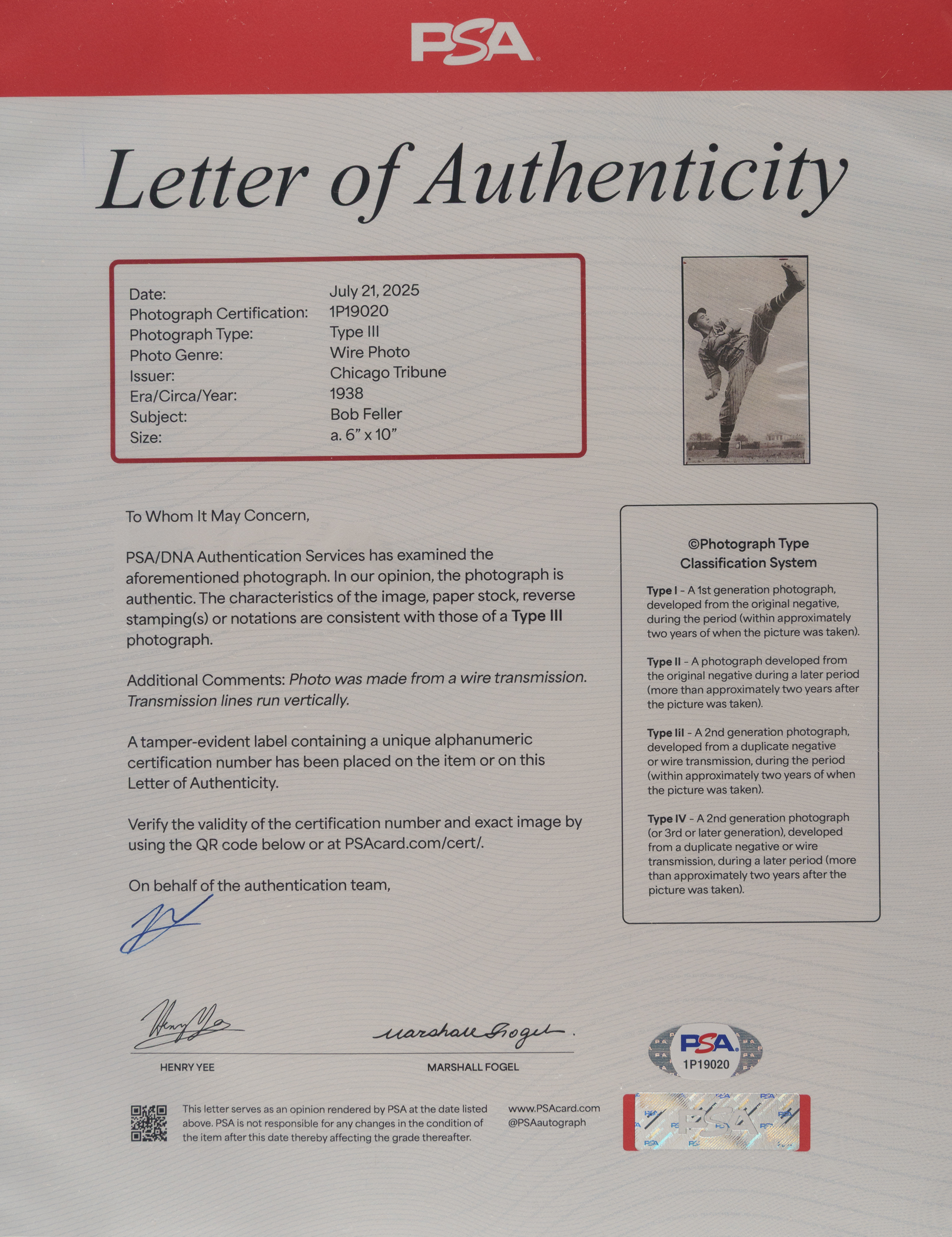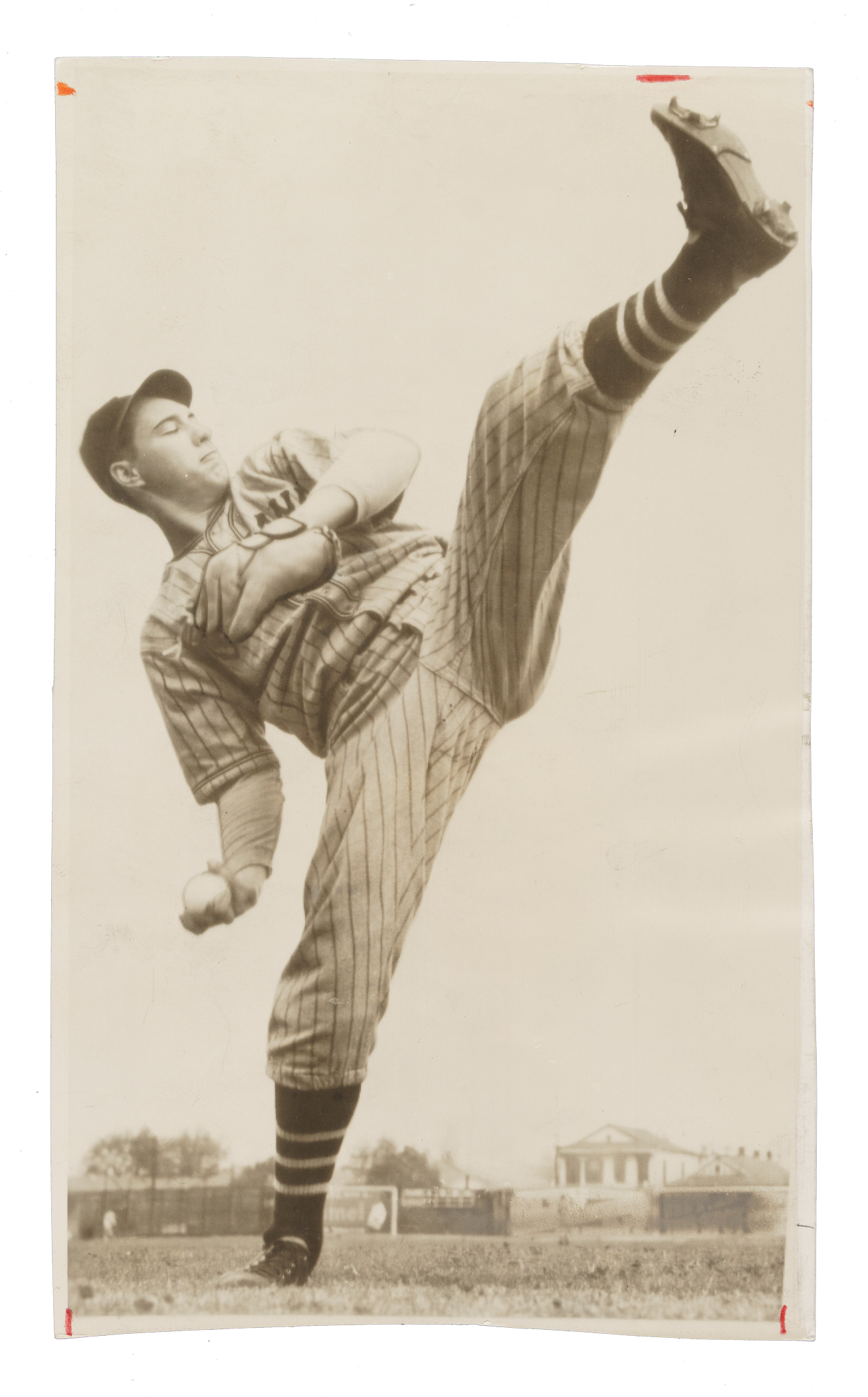 Vintage news photo picturing Cleveland Indians pitcher Bob Feller in 1938. Certified as an original Type III photograph by PSA/DNA. The photo captures Feller in a pitching pose, showing off his trademark high leg kick. Per PSA/DNA, the "photo was made from a wire transmission." A pair of date stamps (April 17, 1938, and Dec 25, 1976) appear on the reverse, as does Feller's name. The photo (6 x 10 inches) has been trimmed and displays editorial markings on the front. Very Good condition overall. Full LOA from PSA/DNA.