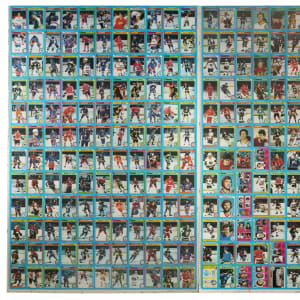 Complete set of 1979-1980 Topps hockey on one 264-card uncut final production double sheet. The 1979-1980 Topps hockey set includes the rookie card of Hall of Famer Wayne Gretzky and many other Hall of Famers including Mike Bossy, Guy Lafleur, and the final regular-issue cards of Ken Dryden, Gordie Howe, and Bobby Hull. This 264-card "Jumbo" sheet measures approximately 43 x 57 inches. Because of the large size, it is susceptible to minor imperfections. The sheet has various condition flaws such as creases, edge tears, and separation along the lower portion of the fold line. There are black ink marks on the upper-right quadrant. This sheet is extremely impressive. It could easily be cut down into two standard 132-card sheets. Assigning an overall grade to uncut sheets, especially one of this impressive size, can be extremely difficult. Many of the interior cards on this sheet would grade Near Mint or better. The important Wayne Gretzky card is clean, both front and back, with no creasing. Despite the technical flaws, this sheet has tremendous visual appeal and would be an outstanding addition to any advanced hockey, Wayne Gretzky, or uncut-sheet collection. Please note: This sheet has been stored rolled and will be shipped as such. The size/weight of this item requires that there will be an additional shipping charge for this lot.