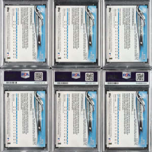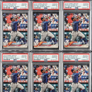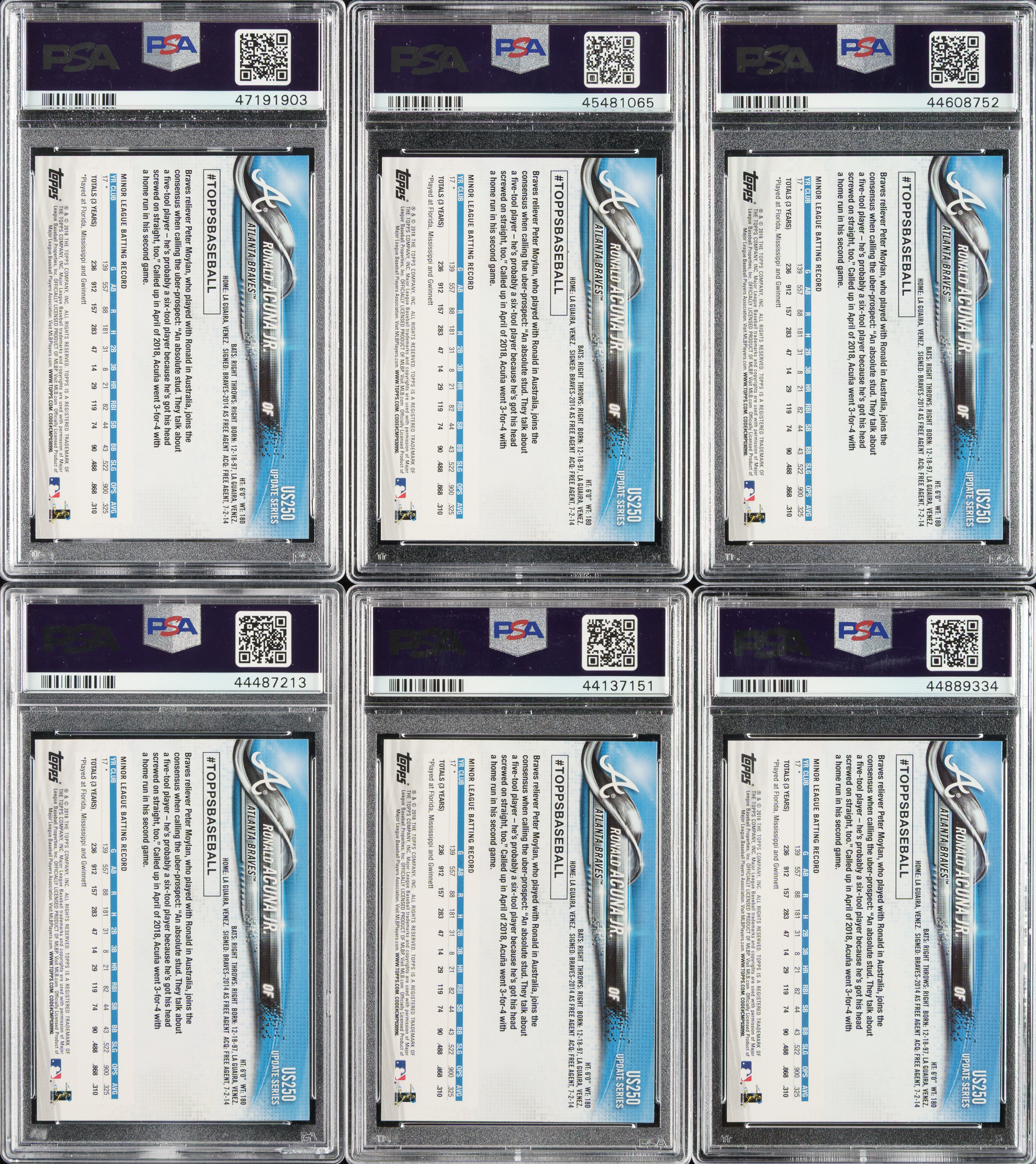 Collection of six 2018 Topps Update #US250 Ronald Acuna Jr. Rookie At-Bat in Blue Jersey cards, each graded and encapsulated GEM MINT 10 by PSA. Total: 6 cards.