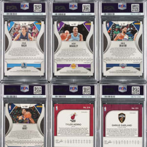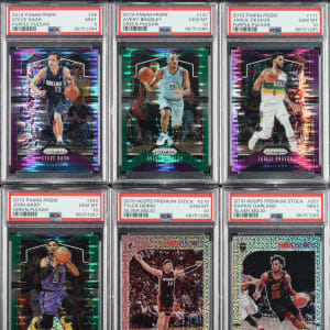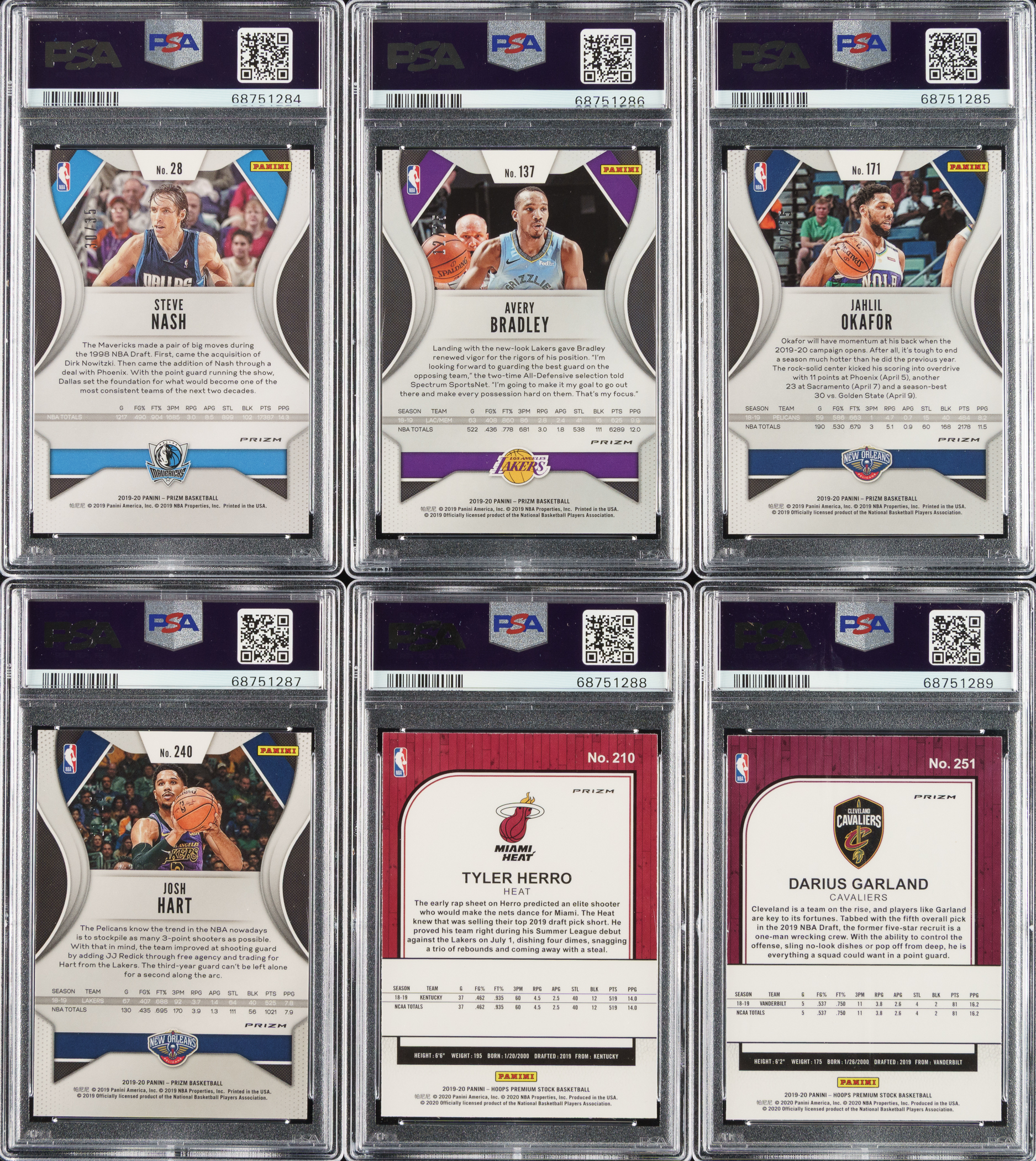 Collection of six 2019-2020 Panini Prizm and Panini Hoops Premium Stock basketball cards, featuring Phoenix Suns Hall of Famer Steve Nash. Each card has been graded and encapsulated by PSA. This collection consists of the following: 1) 2019-2020 Panini Prizm (4 cards): #28 Nash/Purple pulsar (#30/35, MINT 9), 137/Green pulsar (#12/25, GEM MINT 10), 171/Purple pulsar (22/35, GEM MINT 10) and Hart/Green pulsar (21/25, GEM MINT 10). 2) 2019-2020 Panini Hoops Premium Stock (2 cards): #210/Silver mojo (GEM MINT 10) and 251/Silver mojo (MINT 9). Total: 6 cards.