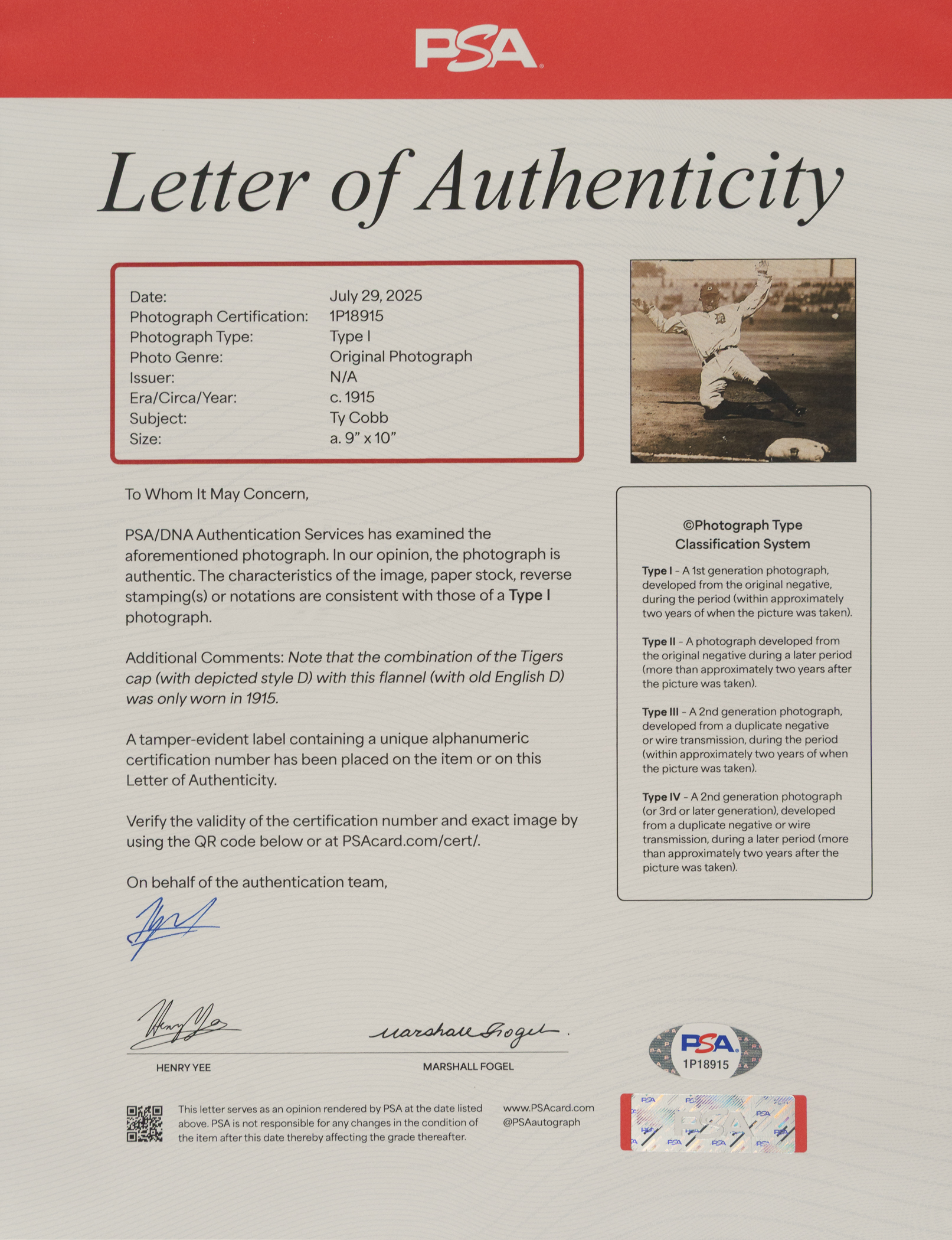 Original photo of Ty Cobb as a member of the Detroit Tigers, circa 1915. Encapsulated and certified as an original Type I photograph by PSA/DNA. The photo captures Cobb sliding into third base. Per PSA/DNA, "the combination of the Tigers cap (with depicted style D) with this flannel (with old English D) was only worn in 1915." The reverse features black paper residue, tape repairs, and a "1914" pencil notation. The photo (9 x 10 inches) is missing a piece along the top edge, has a chipped top-left corner, and scattered creasing. While technically in Poor condition overall, the photo retains strong clarity and visual appeal.