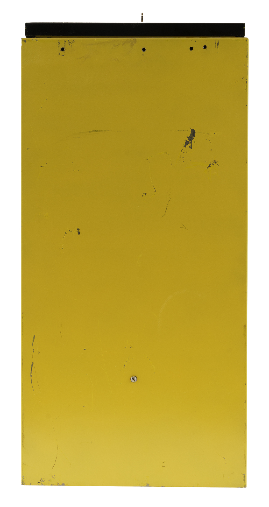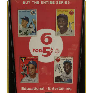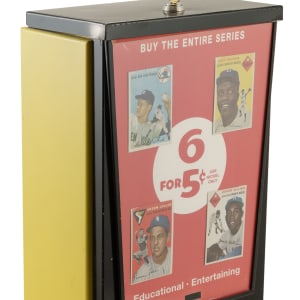 Presented is a circa 1950s baseball-card vending machine designed to dispense six cards for five cents. The countertop machine (11.25 x 6 x 23 inches) displays four 1954 Topps baseball cards (Whitey Ford, Jackie Robinson, Sherm Lollar, and Junior Gilliam) within the glass-enclosed front panel. The key for the front panel is included with the machine. The exterior of the machine displays minor wear (commensurate with its age and years of former use) including minor abrasions and scratches. The size/weight of this item requires that there will be an additional shipping charge for this lot.