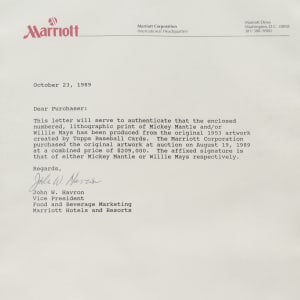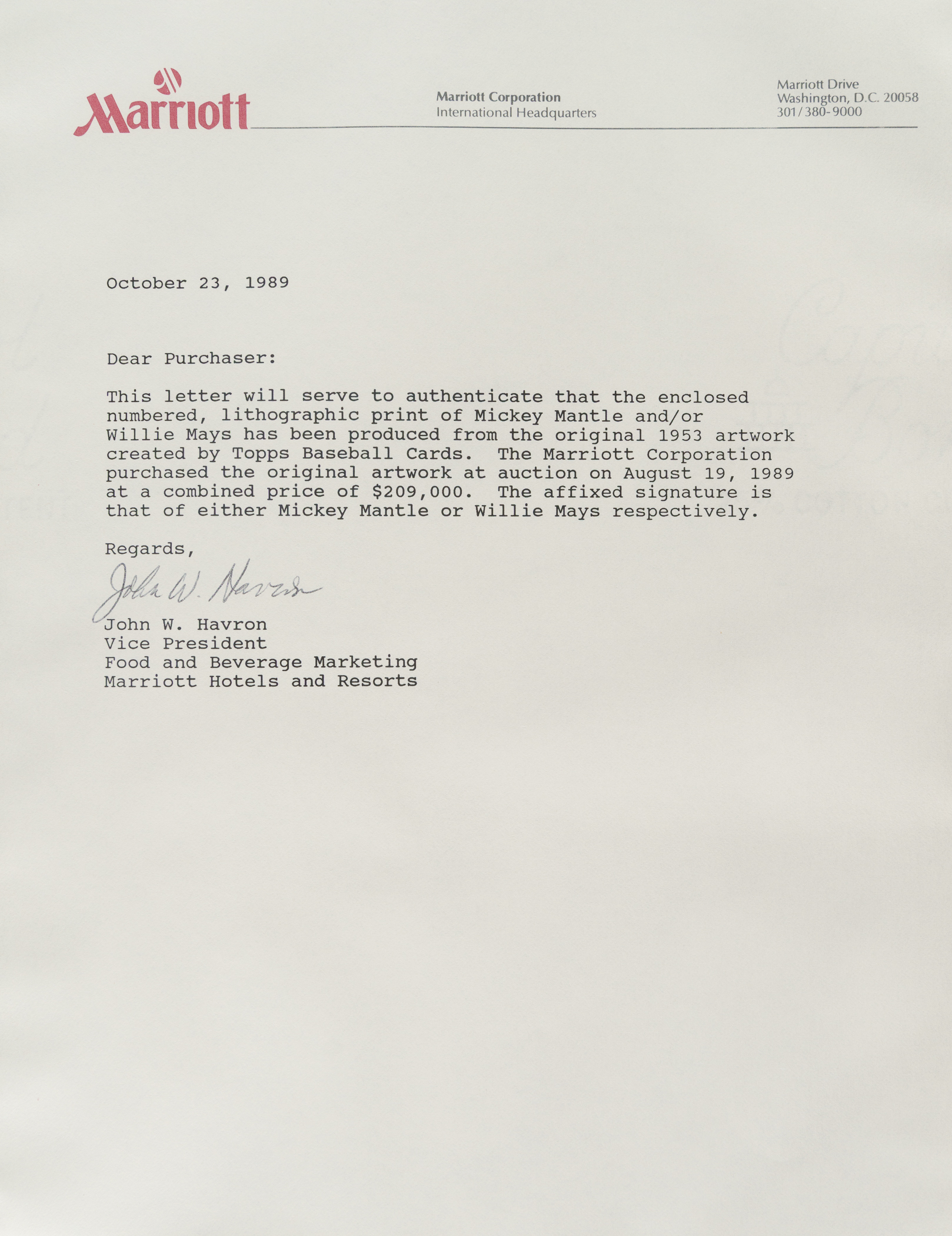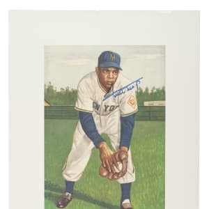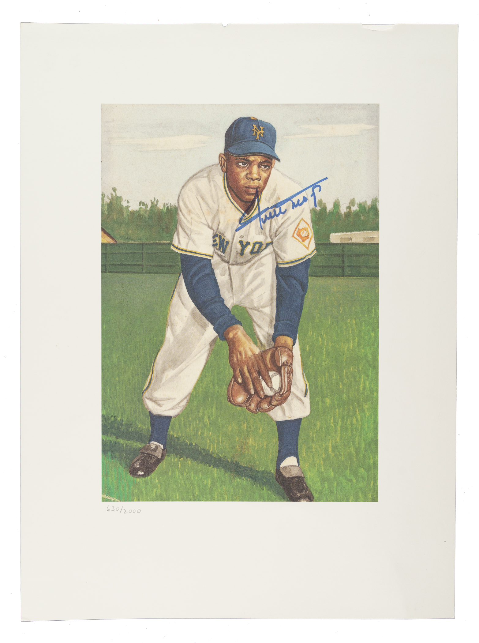 Limited-edition lithographic print of Willie Mays, numbered "630/2000," signed by Mays in blue Sharpie across his image. This print, which replicates Mays' 1953 Topps baseball card, was actually produced from the original 1953 Topps artwork of Mays' card. In 1989, the Marriott Corporation purchased the two original 1953 Topps baseball-card artworks of Mantle and Mays for a combined price of $209,000. The company then produced a set of 2,000 limited-edition signed lithographs made from each artwork. Today, these limited-edition signed prints are scarce. The print (11 x 15 inches) displays a tiny chip and tear along the top edge. Very Good to Excellent condition overall. Auction LOA from James Spence/JSA