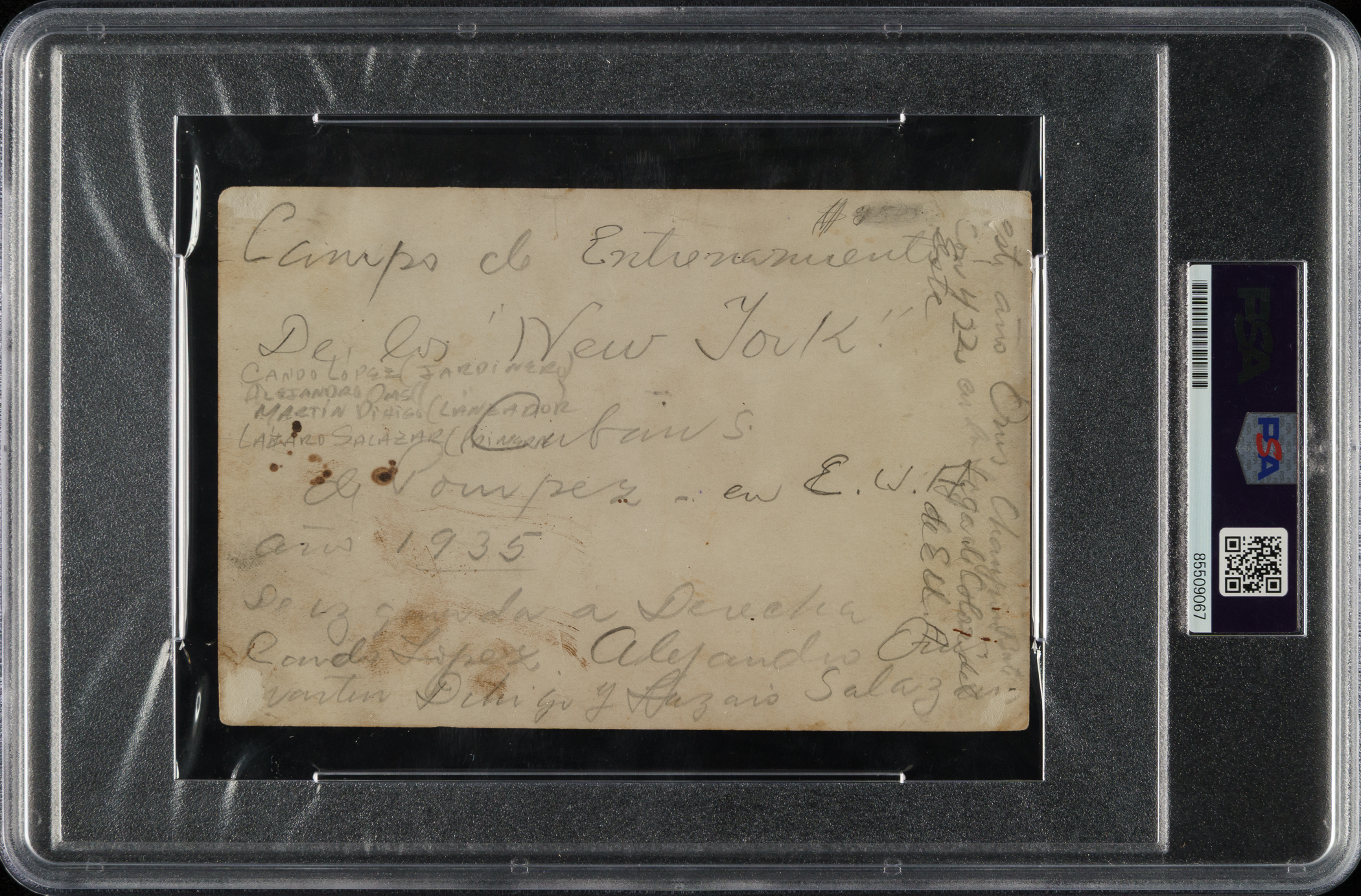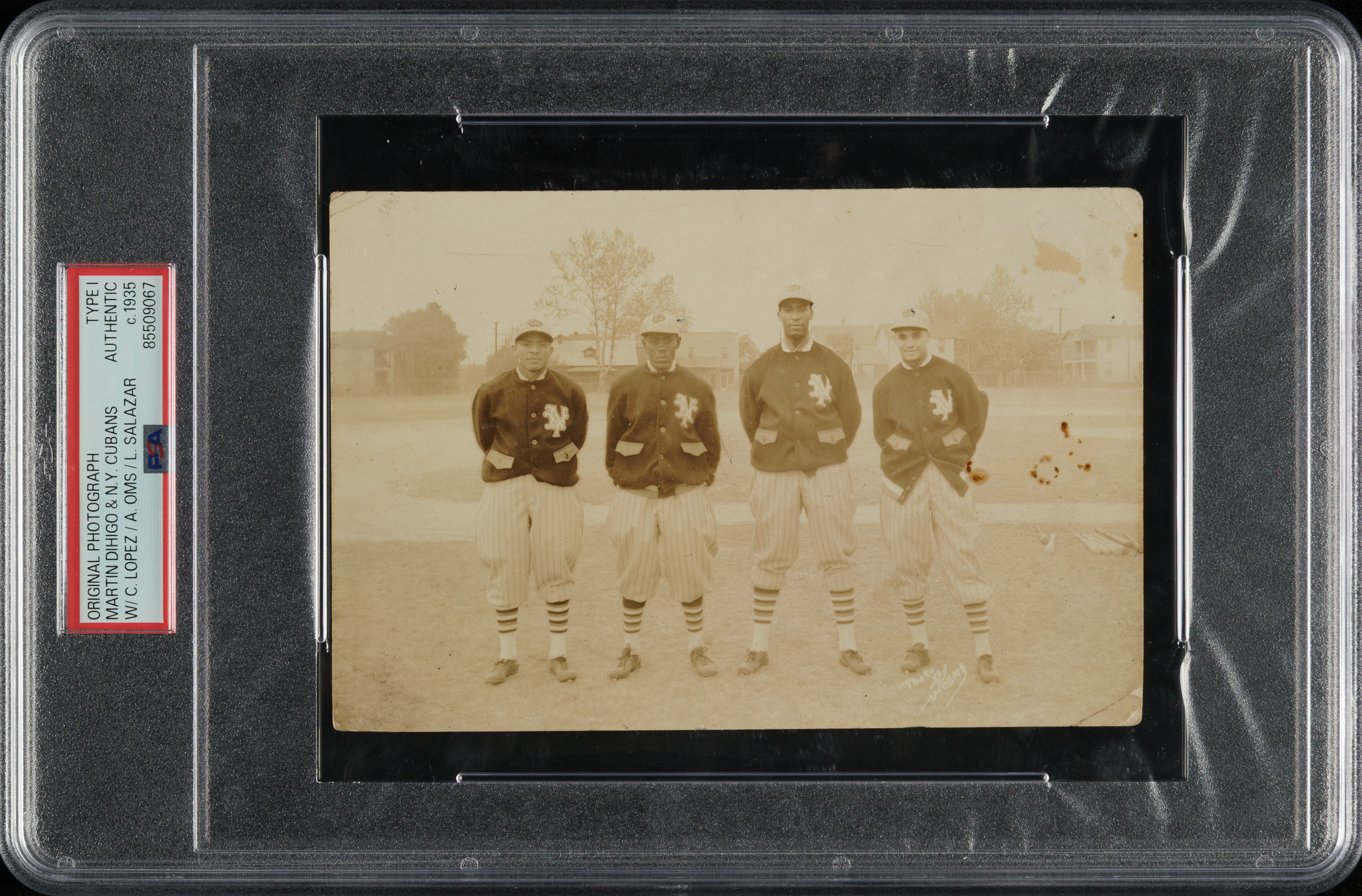 Outstanding original photograph capturing four members of the circa 1935 New York Cubans team, highlighted by Hall of Famer Martin Dihigo. Encapsulated and certified as an original Type I photograph by PSA/DNA. Standing tall second from the right, Dihigo played every position and is considered by many to be the best all-around player to ever take the field. He is one of baseball's greatest legends and has the distinction of being a member of three Baseball Halls of Fame (U.S., Cuba, and Mexico). This is just the second example of this photograph we've offered in the past 21 years. The photo has notations on the reverse identifying all of the men pictured, including manager Martin Dihigo, Cando Lopez, Alejando Oms, and Lazaro Salazar. Measuring 6 x 4 inches, the photograph bears a "Photo By Weems" credit stamp along the base. In addition to the player identification on the reverse, there are notations written in Spanish as well. The photo has moderate-to-heavy creasing. ln Fair condition overall. Technically in modest grade due to a number of condition flaws that do not detract from the integrity of the photo or its remarkable significance.