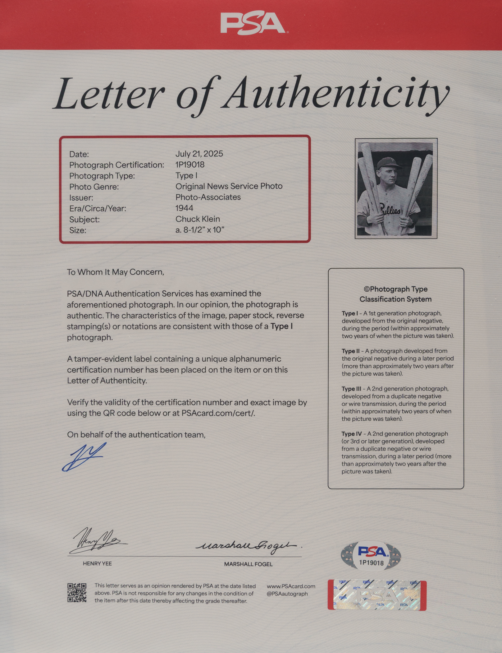 Original news photo of Hall of Fame Chuck Klein in 1944 as a member of the Philadelphia Phillies. Certified as an original Type I photograph by PSA/DNA. The photo captures Klein, who was serving as a player-coach at the time, holding four bats. A "Photo Associates" credit stamp appears on the reverse, along with a printed caption and editorial notations. The photo (8.5 x 10 inches) displays a few small creases and is in Very Good to Excellent condition overall. Full LOA from PSA/DNA.
