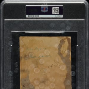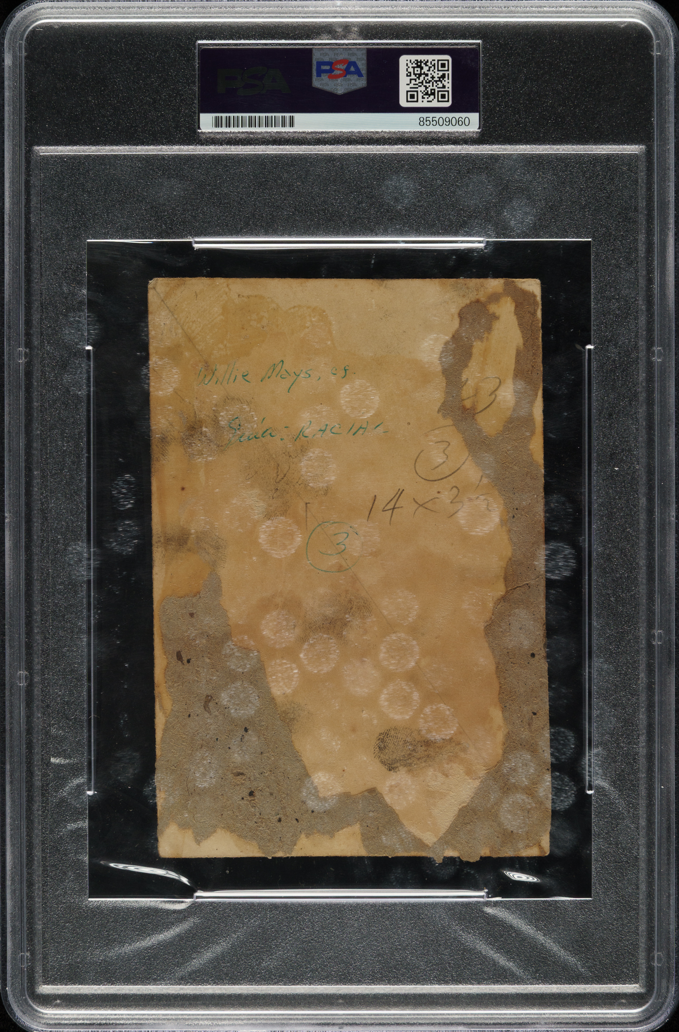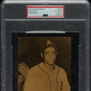 Vintage photo of Willie Mays as a member of the Almendares (Cuban League), circa 1950-1951. Encapsulated and certified by PSA/DNA as an original Type III photograph. Per PSA/DNA, the "photo is a period example that was made from a duplicate negative." A young Mays is captured staring directly at the camera. The reverse displays multiple notations, including Mays' name. Back damage is also present. The photo (3.75 x 5.25 inches) exhibits scattered creasing and is in Fair condition overall.