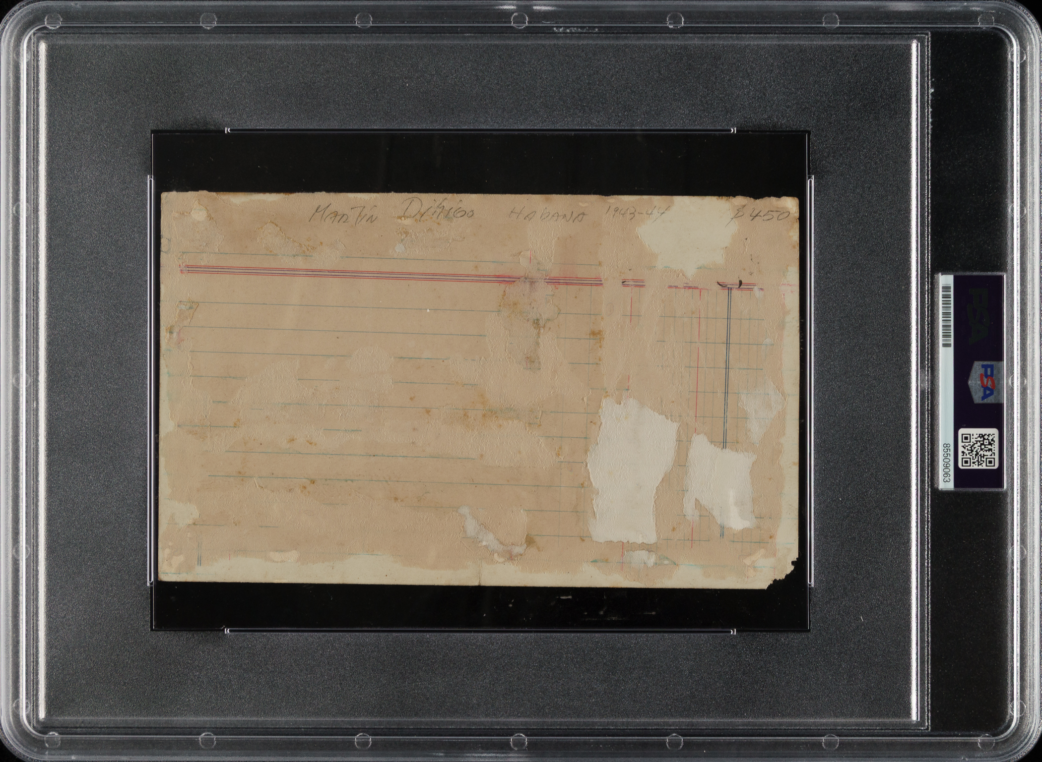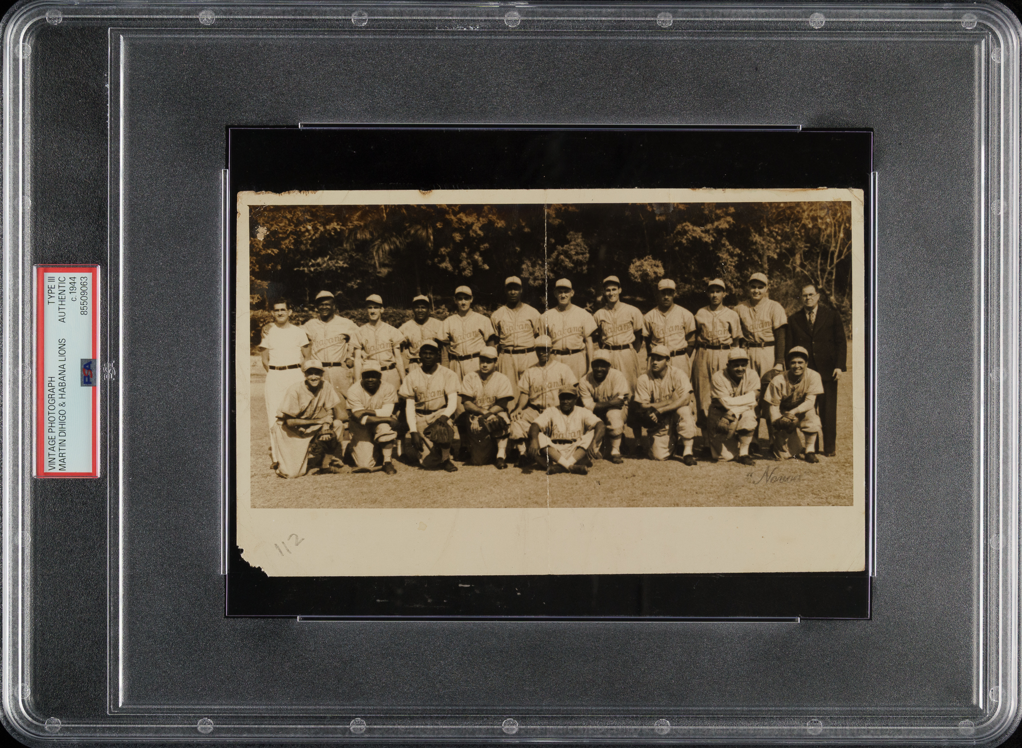 Vintage photo capturing twenty members of the Habana Lions (Cuban League) team circa 1944, highlighted by Hall of Famer Martin Dihigo. Encapsulated and certified as an original Type III photograph by PSA/DNA. Per PSA/DNA, this "photo is a period example that was made from a duplicate negative." Standing tall in the back row center, Dihigo played every position and is considered by many to be the best all-around player to ever take the field. He is one of baseball's greatest legends and has the distinction of being a member of three Baseball Halls of Fame (U.S., Cuba, and Mexico). The reverse displays Dihigo's name written in pencil and evidence of album removal. The photo (8 x 5 inches) has a vertical fold line down the middle, scattered creasing, a missing bottom-left corner, and the number "112" written along the bottom border. Poor condition overall.