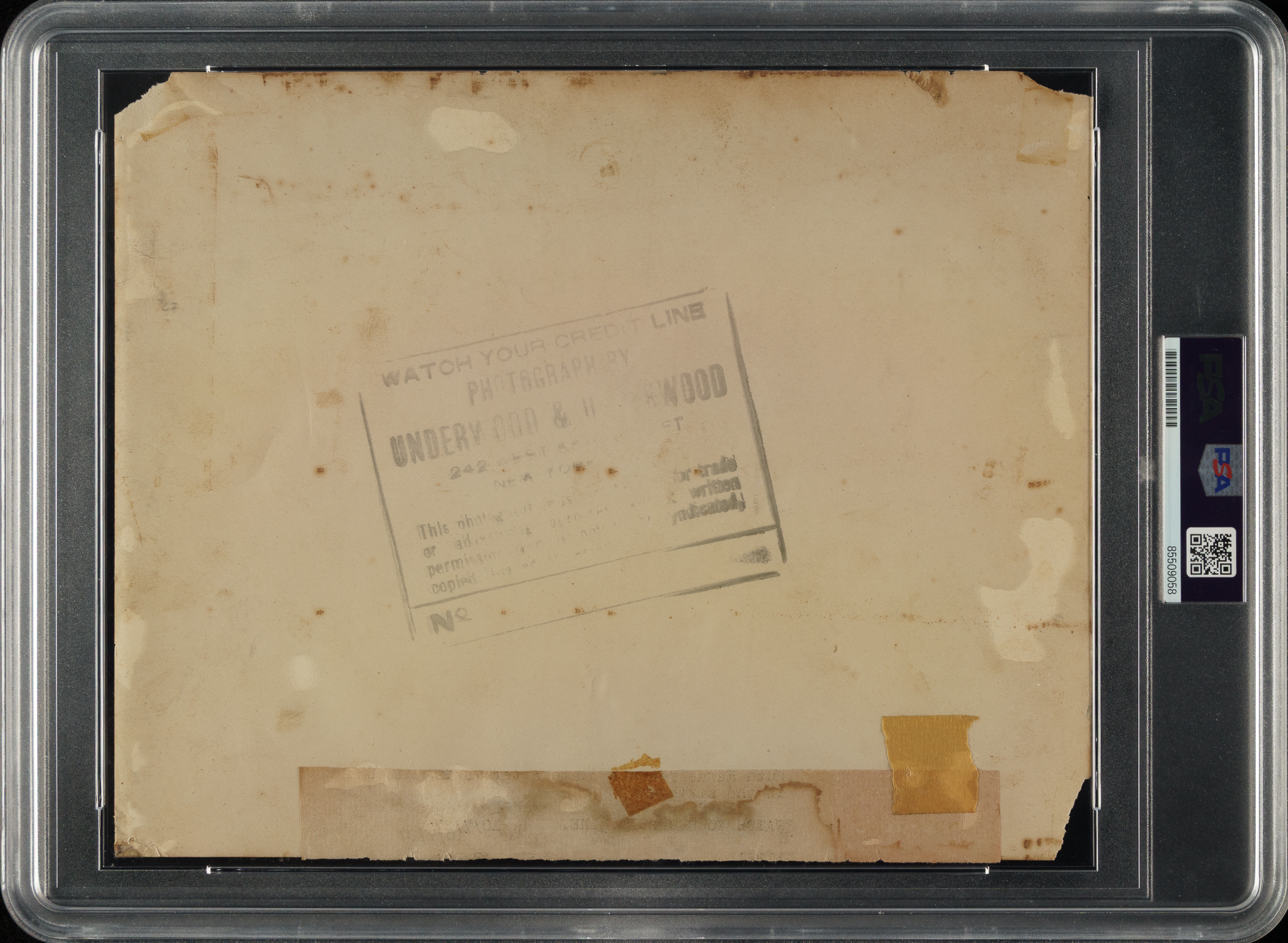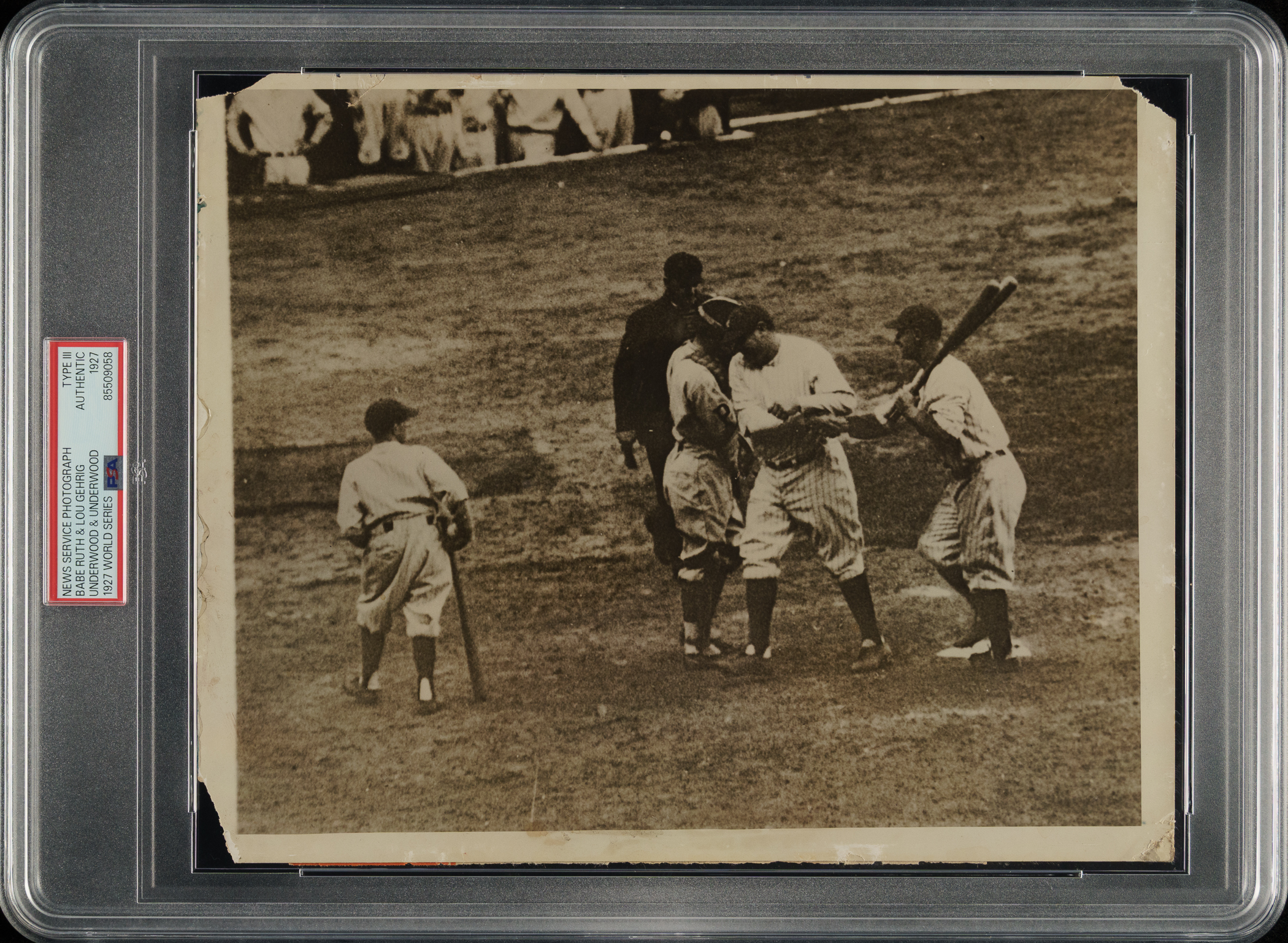 Vintage news photo capturing Babe Ruth being greeted at the plate by Lou Gehrig after hitting a three-run home run in Game 3 of the 1927 World Series against the Pittsburgh Pirates. Encapsulated and certified as an original Type III photograph by PSA/DNA. Per PSA/DNA, this "photo is a period example that was made from a duplicate negative." We sold a Type I example of this photo as Lot 1998 in our 2018 Fall auction. The reverse displays an "Underwood & Underwood" credit stamp, tape residue and staining, and scattered spots of discoloration. The photo (10 x 8 inches) is missing three corners, has multiple edge tears, and has a pair of tack holes along the right border. While technically in Poor condition overall, the photo retains excellent clarity.