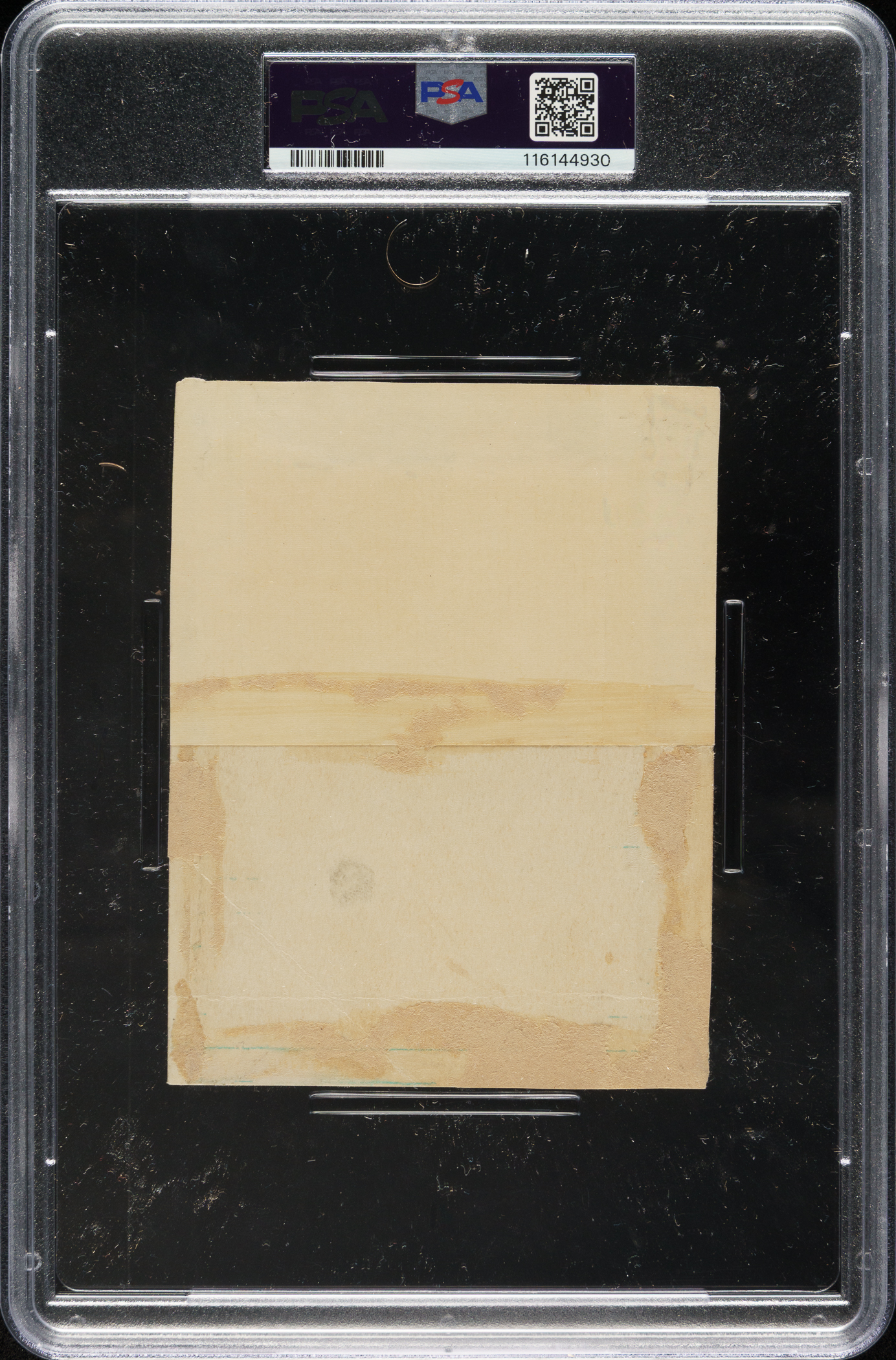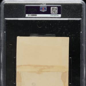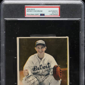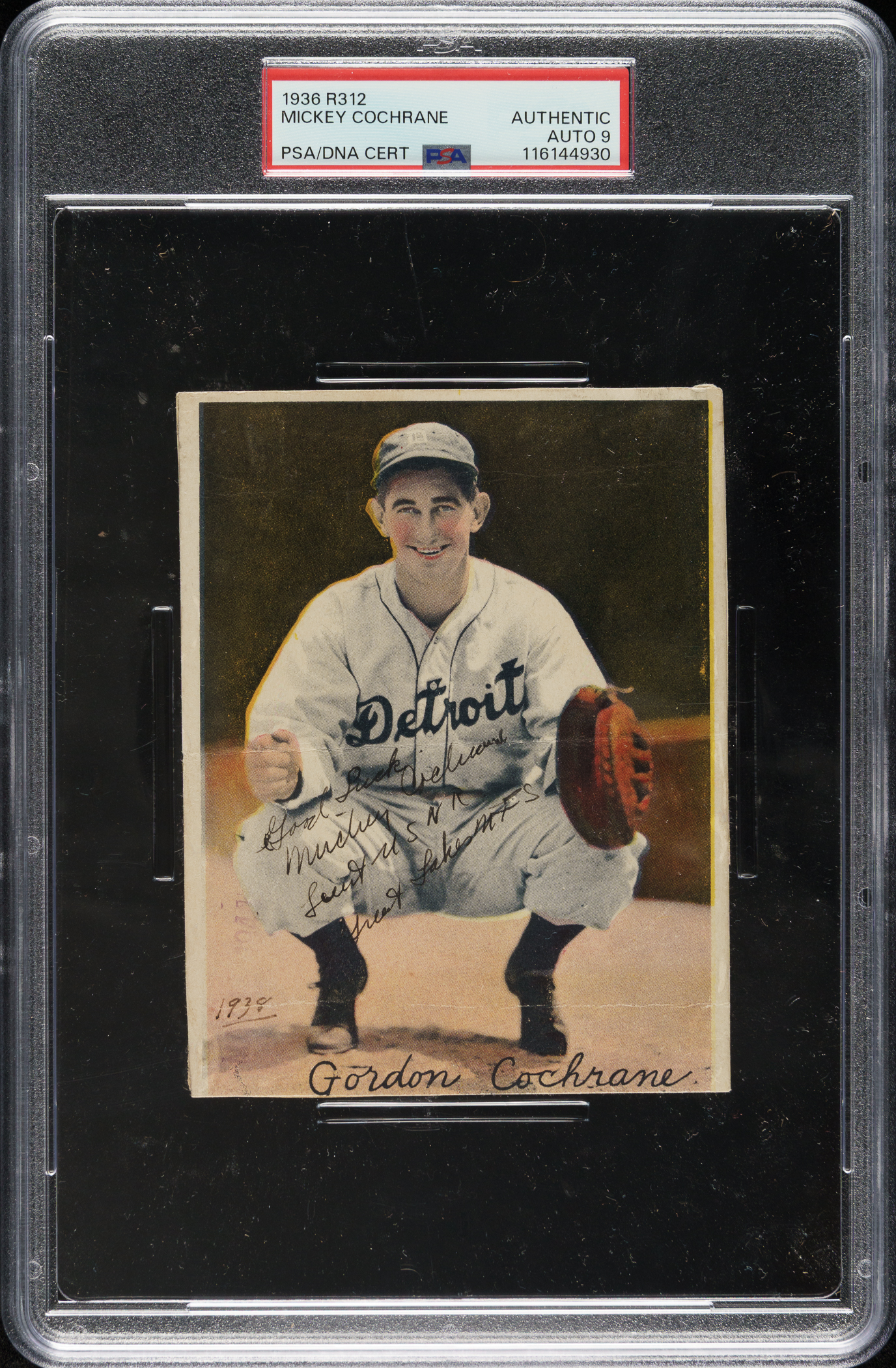 1936 R312 National Chicle Premiums Mickey Cochrane, inscribed by Cochrane on the front. PSA/DNA has encapsulated the piece and graded the signature MINT 9. One of only two examples of this particular signed premium listed in the PSA/DNA Population Report. Cochrane has inscribed the premium "Good Luck/Mickey Cochrane/Lieut USNR/Great Lakes NTS" in black fountain pen. This full-color (4 x 5.375 inches) premium set is composed of twenty-five individual player portraits, fourteen multiplayer cards, and eleven in-action photos. The beautiful, rich pastel colors of R312 premiums make them one of the most striking and distinctive of all 1930s issues. Considering how substantial they are, R312 premiums have received very little attention from collectors, in part due to the fact that they are larger than standard cards, and therefore have only recently begun to be encapsulated by grading services, and the fact that they are blank-backed with no identification of the issuer. The premium, which is hand cut on all four sides, displays the year "1938" written along the base, heavy creasing, and evidence of album removal on the reverse. In Poor condition.