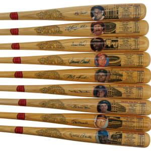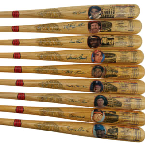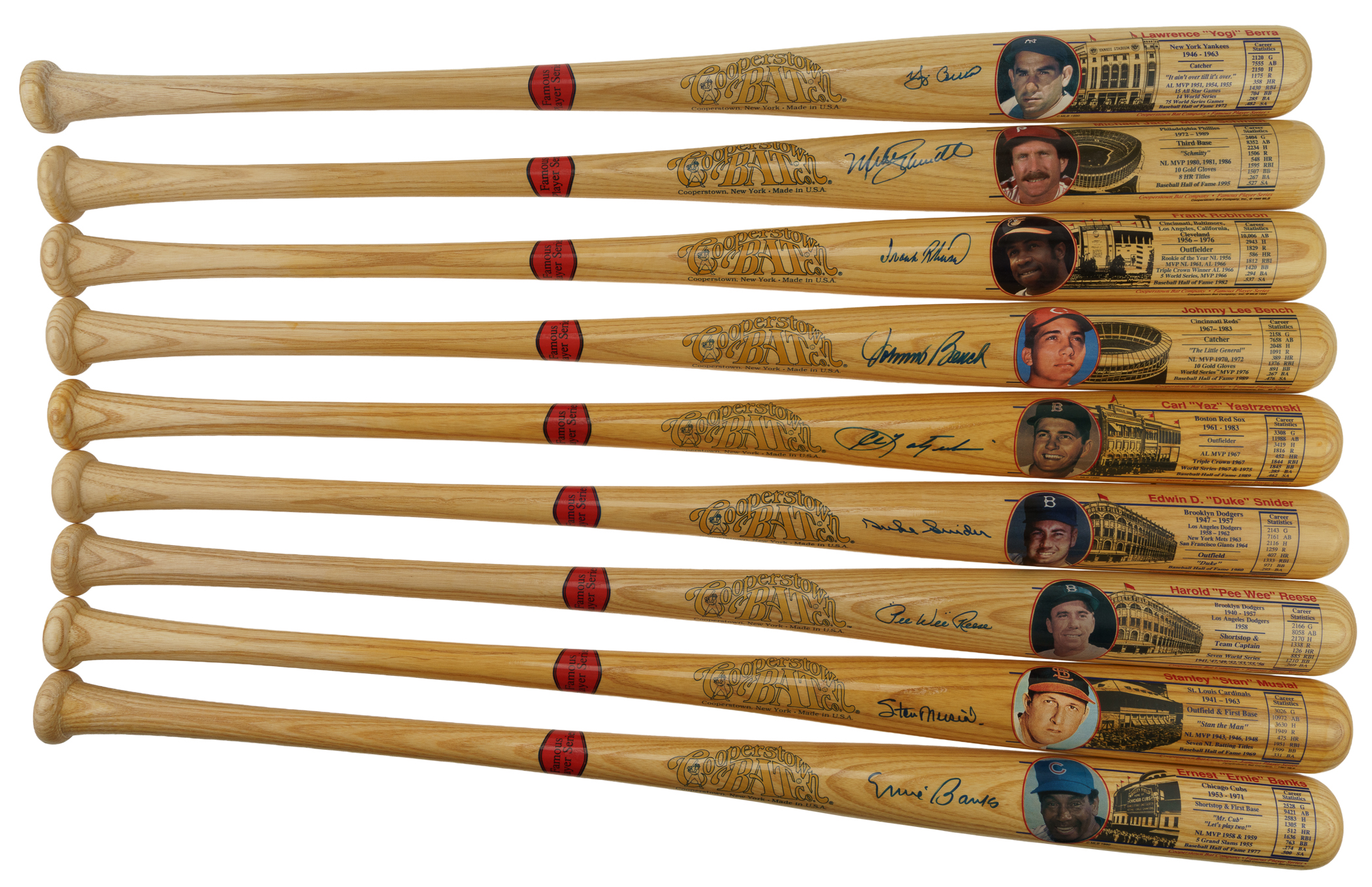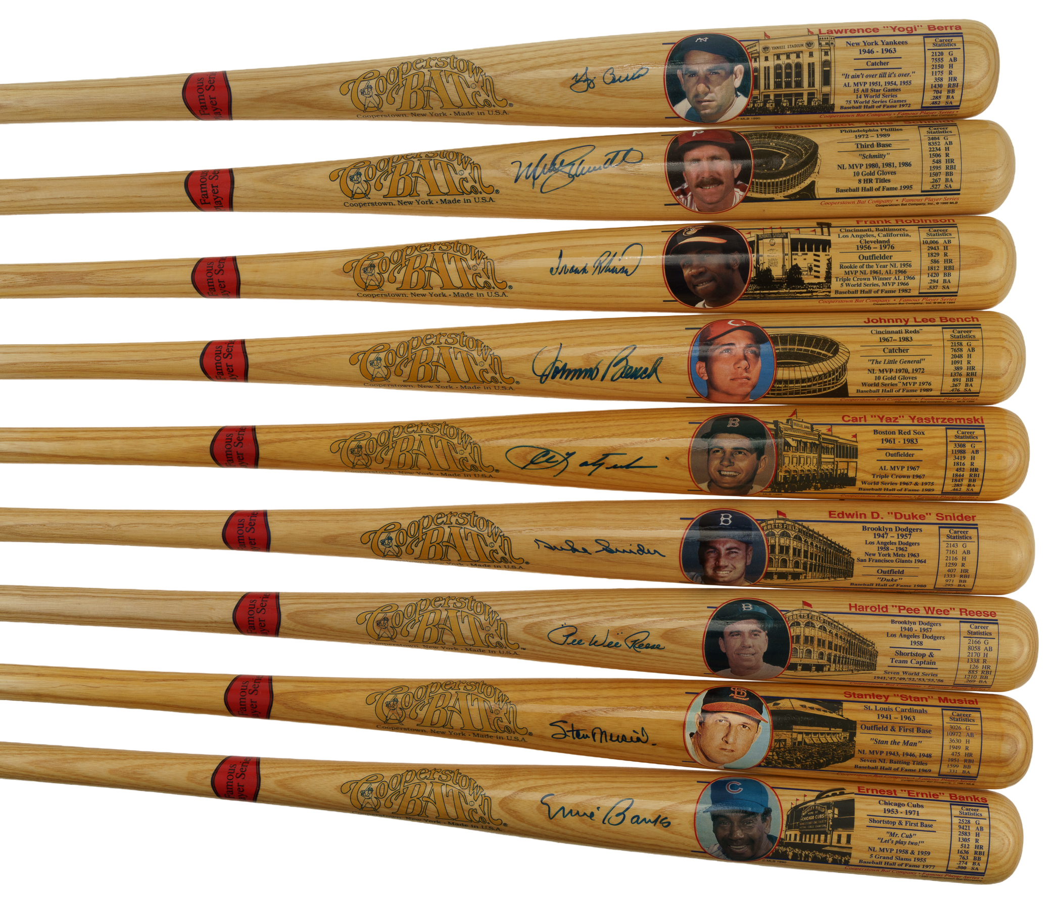 Collection of nine different bats from the Cooperstown Bat Company's "Famous Player Series," each signed on the sweet spot of the barrel by the respective player: Ernie Banks, Johnny Bench, Yogi Berra, Stan Musial, Pee Wee Reese, Frank Robinson, Mike Schmidt, Duke Snider, and Carl Yastrzemski. The attractive bats, which feature both the player's portrait and career statistics on the barrel, are popular display pieces for collectors, with signed examples especially prized. Copyrights on the bats range from 1987 to 1996. All the signatures are boldly scripted in blue Sharpie. The bats (34 inches in length) all are in Near Mint condition. Total: 9 bats. Auction LOA from James Spence/JSA. The size/weight of this item requires that there will be an additional shipping charge for this lot.