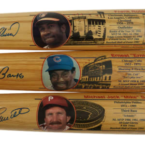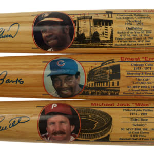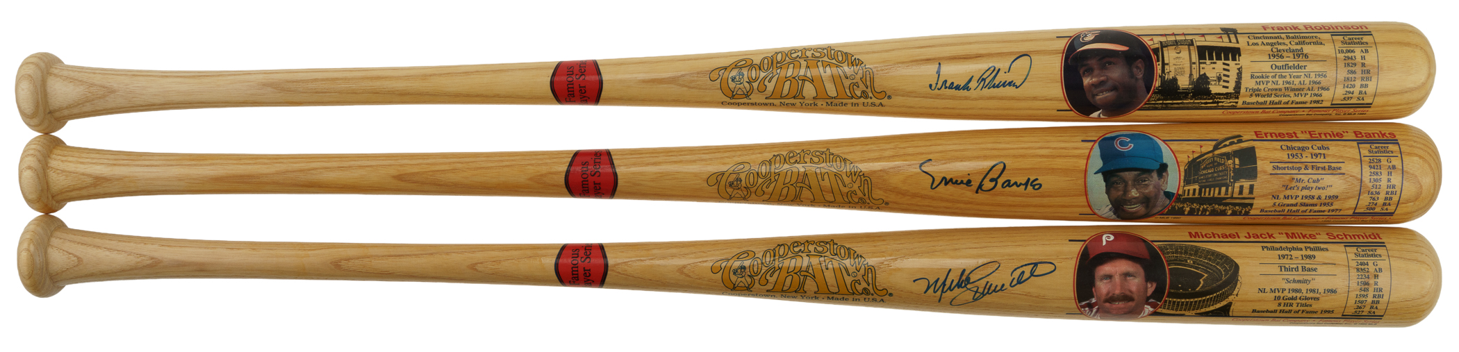 Trio of bats from the Cooperstown Bat Company's "Famous Player Series," each signed on the sweet spot of the barrel by the respective player: Mike Schmidt, Frank Robinson, and Ernie Banks. The attractive bats, which feature both the player's portrait and career statistics on the barrel, are popular display pieces for collectors, with signed examples especially prized. Copyrights on the bats range from 1990 to 1995. All the signatures are boldly scripted in blue Sharpie. The bats (34 inches in length) are all in Near Mint condition. Total: 3 bats. Auction LOA from James Spence/JSA. The size/weight of this item requires that there will be an additional shipping charge for this lot.