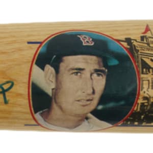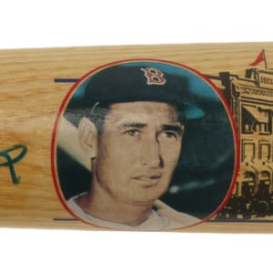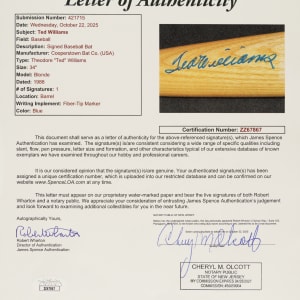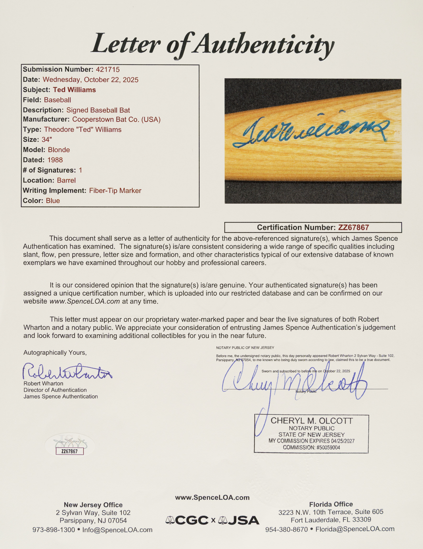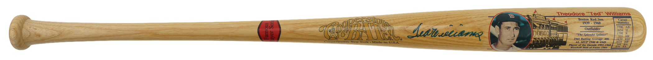 Commemorative bat manufactured by the Cooperstown Bat Company signed by Ted Williams, who has written his signature in blue Sharpie on the barrel. The barrel also features a decal that pays tribute to Williams' legendary career. The bat measures 34 inches long and is in Near Mint condition. Full LOA from James Spence/JSA. The size/weight of this item requires that there will be an additional shipping charge for this lot.
