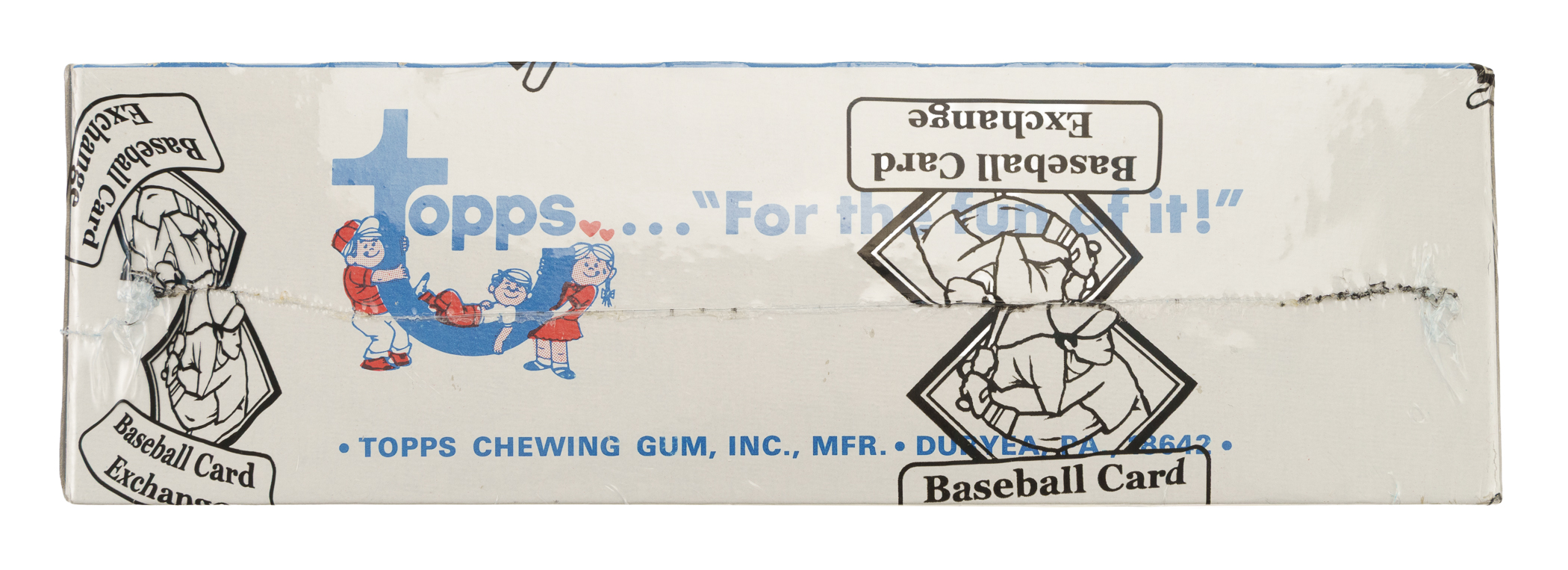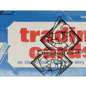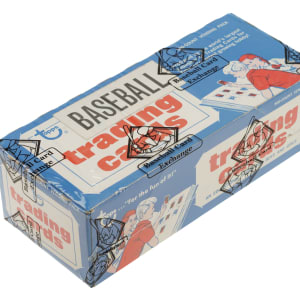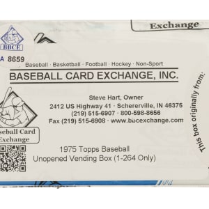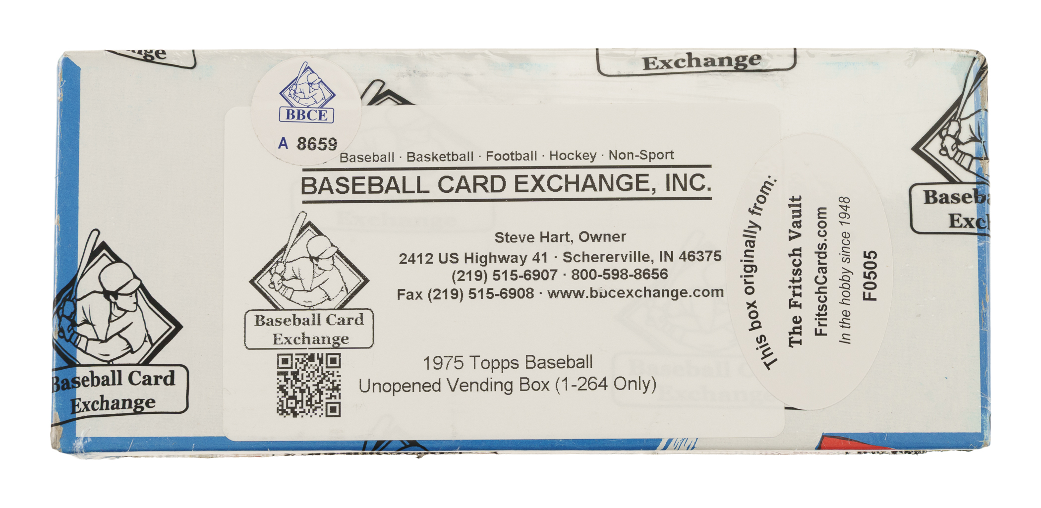 Original unopened vending box of 1975 Topps baseball containing approximately 500 cards from this popular set. This box originates directly from the estate of the legendary Larry Fritsch. It comes shrink-wrapped by Baseball Card Exchange (owned by Steve Hart, the foremost expert on unopened material) and bears the certified designation as having originated from the "Fritsch Vault." It is also noted on the label that this particular box includes cards numbered from "1-264 Only." While no guarantees can be made with respect to the grading of unopened material, there is a very real possibility that within this box are Mint or Gem Mint examples. The box displays beautifully, appearing almost exactly as it would have 50 years ago. This is a very impressive unopened vending box with superb provenance. It would be a worthy addition to even the most advanced collection of 1975 Topps or unopened material.