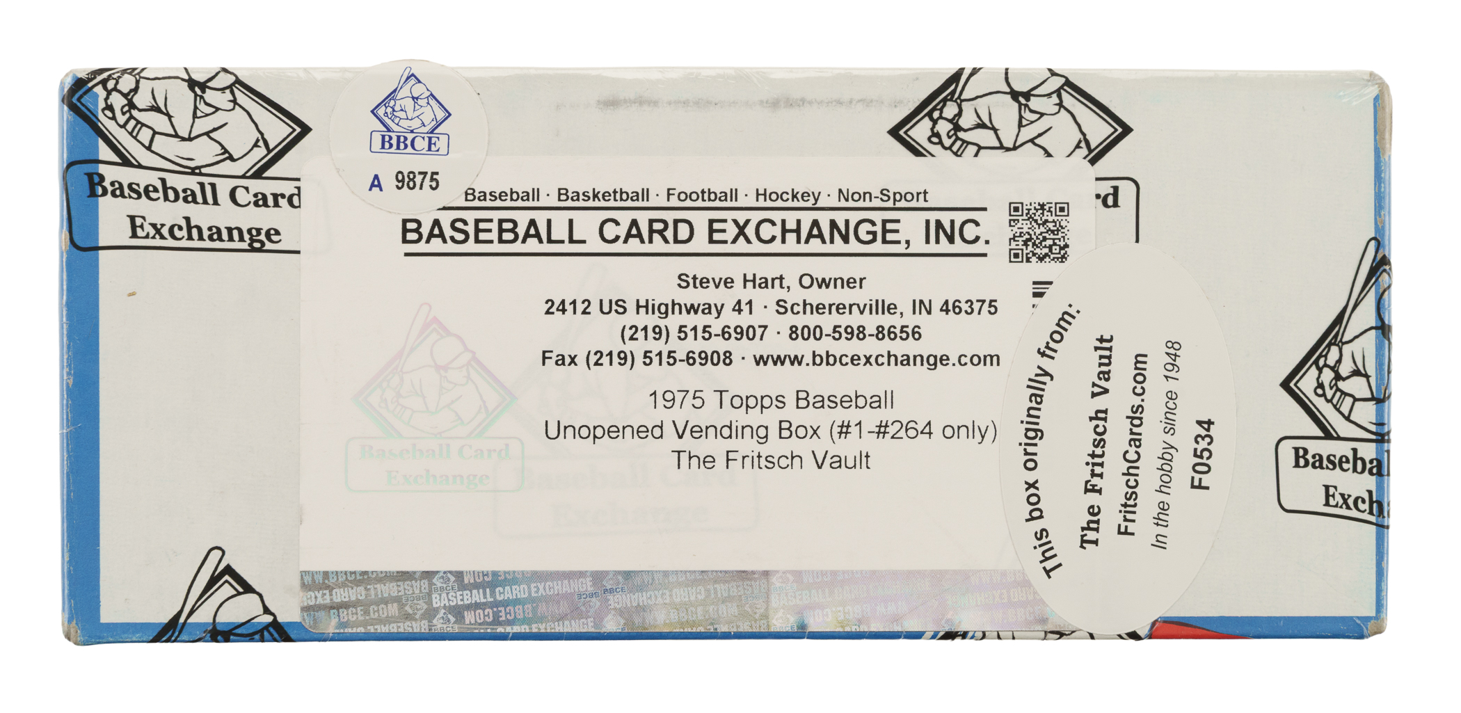 Original unopened vending box of 1975 Topps baseball containing approximately 500 cards from this popular set. This box originates directly from the estate of the legendary Larry Fritsch. It comes shrink-wrapped by Baseball Card Exchange (owned by Steve Hart, the foremost expert on unopened material) and bears the certified designation as having originated from the "Fritsch Vault." It is also noted on the label that this particular box includes cards numbered from "1-264 Only." The box displays beautifully, appearing almost exactly as it would have 50 years ago. This is a very impressive unopened vending box with superb provenance. It would be a worthy addition to even the most advanced collection of 1975 Topps or unopened material.