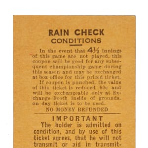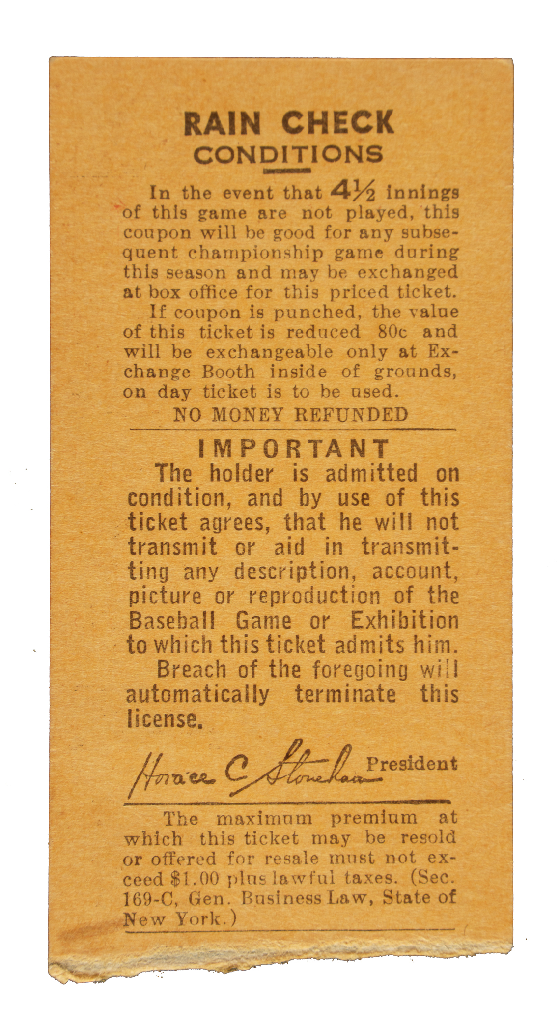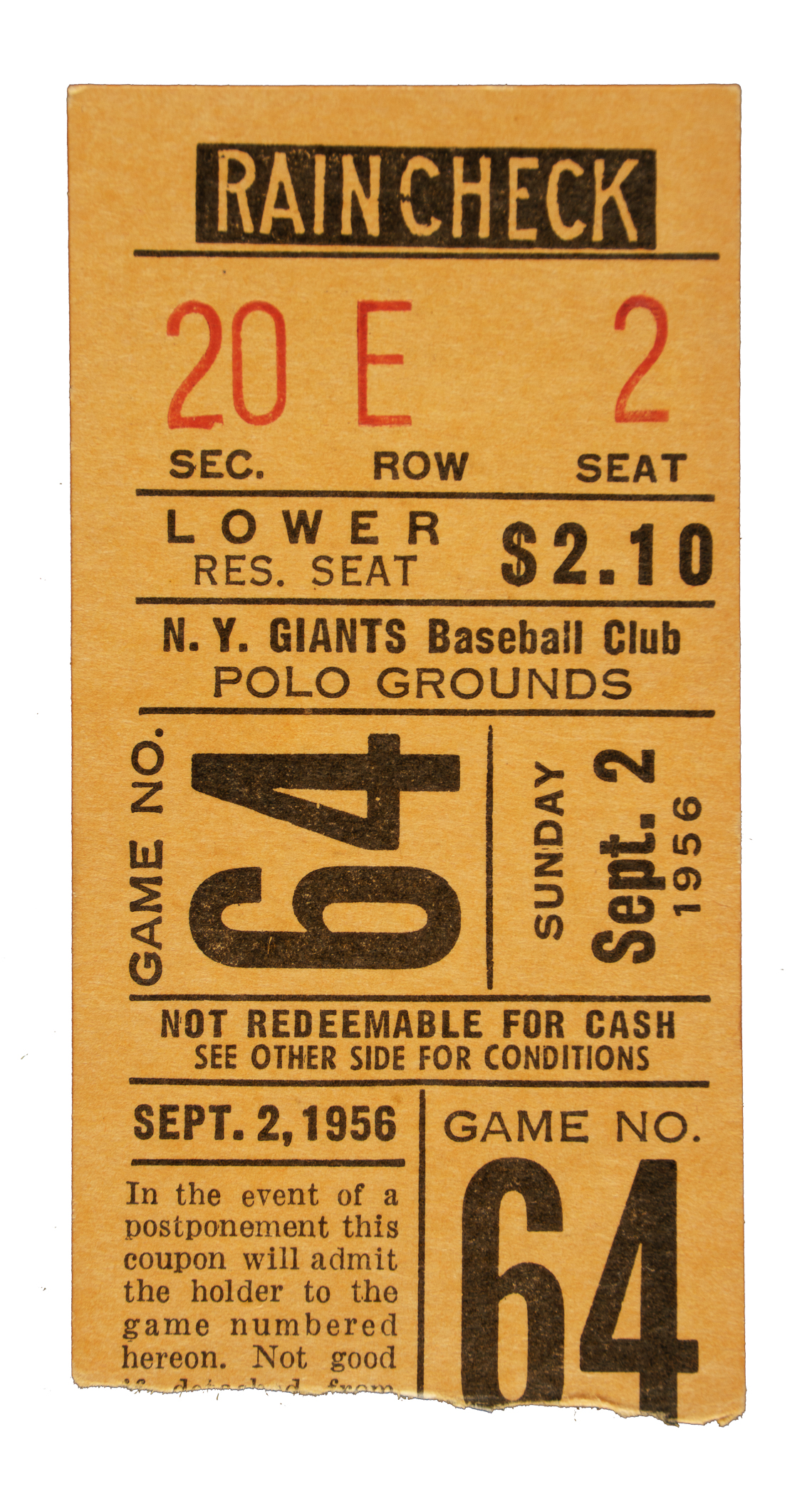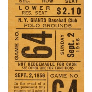 New York Giants regular-season ticket stub issued for a game against the Brooklyn Dodgers on September 2, 1956, in which Jackie Robinson hit his 136th career home run, marking the second to last of his Hall of Fame career. Robinson's home run, a solo shot off Al Worthington, occurred in the seventh inning. Willie Mays also homered (#143) in this game. The Giants defeated the Dodgers 4-1. Robinson went 1 for 3. The ticket stub (1-5/8 x 3-1/4 inches) has a light crease. In Very Good condition overall.