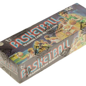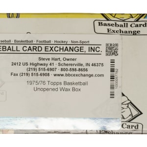 Original, unopened wax box of 1975-1976 Topps basketball. The complete box houses 36 packs with each pack containing 10 cards for a total of 360 cards. The 1975-1976 Topps set includes the rookie cards of Hall of Famers Moses Malone and Jamaal Wilkes, as well as cards of Hall of Famers Kareem Abdul-Jabbar, Pete Maravich, and Wilt Chamberlain among others. While it is impossible to provide guarantees with reference to grading of unopened material, there is the possibility that within this box are high-grade cards. This box comes shrink-wrapped by Baseball Card Exchange (owned by Steve Hart, the foremost expert on unopened material). The store display box shows light-to-moderate shelf wear, including a bit of creasing on the top panel. The years "1975/6" are written along a small white sticker on the lid. Extremely rare complete wax box worthy of even the most advanced collection.
