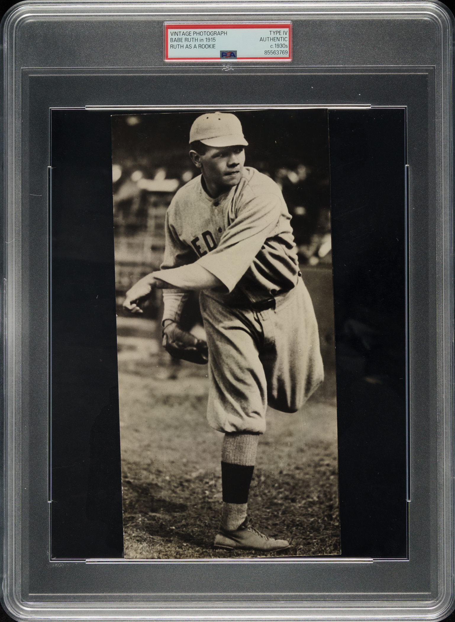 Vintage photo of Babe Ruth as a member of the Boston Red Sox during his rookie season in 1915. Encapsulated and certified by PSA/DNA as an original Type IV photograph. Per PSA/DNA, the "photo is a later-issued 1930s example that was made off a duplicate negative featuring an image originally taken in 1915 in Ruth's rookie season." A youthful Ruth is captured in a throwing pose. Evidence of album removal is visible on the reverse. The photo, which has been trimmed to its current dimensions of 4-5/8 x 9-1/2 inches, is in Excellent condition overall.