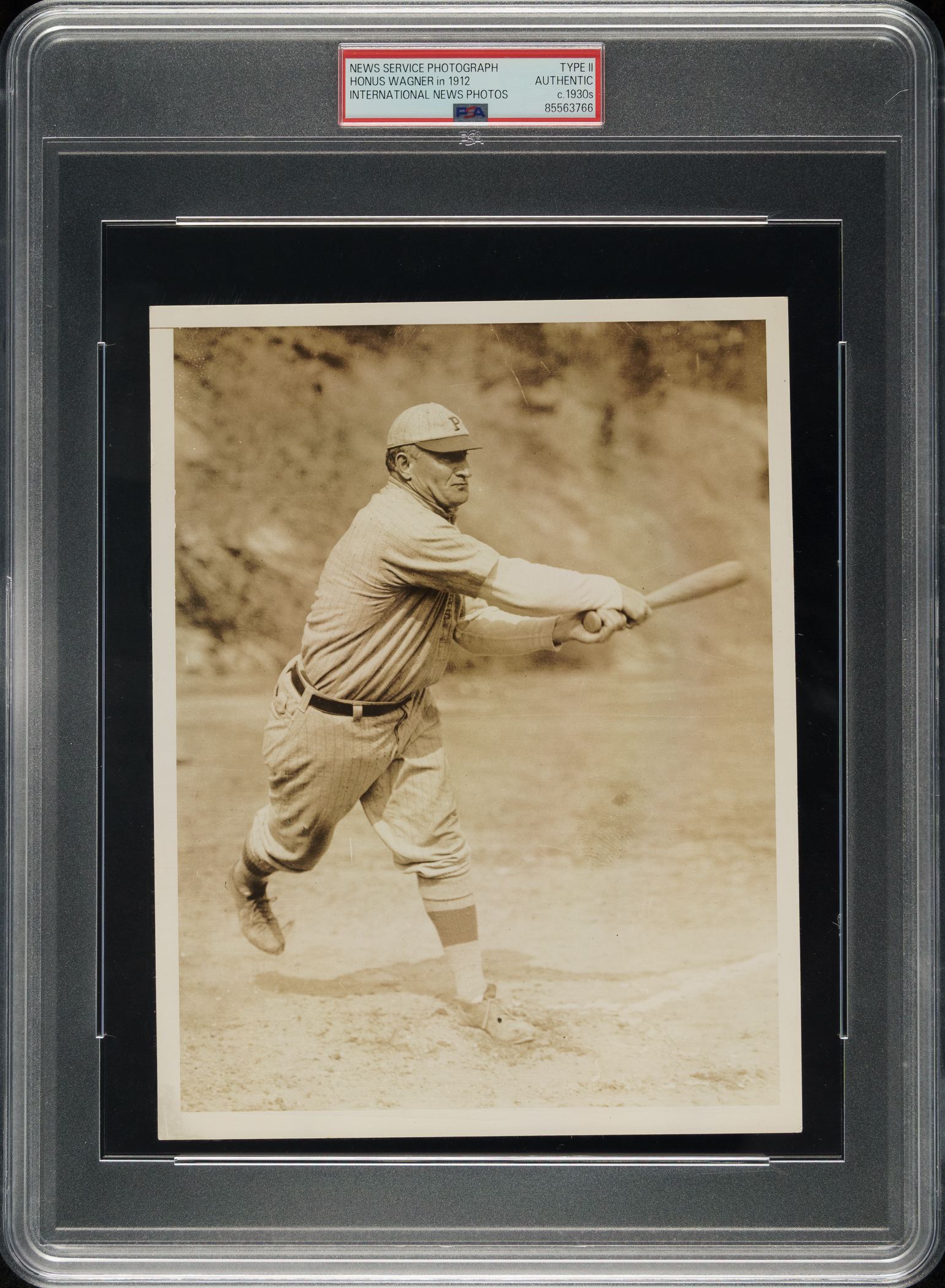 Vintage news photo of Honus Wagner as a member of the Pittsburgh Pirates in 1912. Encapsulated and certified by PSA/DNA as an original Type II photograph. Wagner is captured in a swing-through pose. Per PSA/DNA, the "photo is a later-issued 1930s restrike that was made off the original negative featuring an image originally taken in 1912." The reverse displays an "International News Photos" credit stamp and a pair of editorial notations, including Wagner's name. The photo (6.5 x 8.5 inches) exhibits transmission lines but is otherwise is in Excellent condition overall.