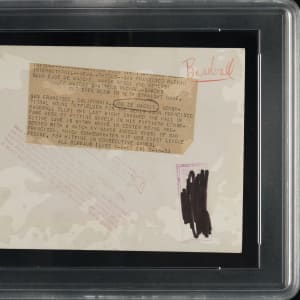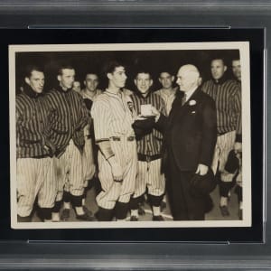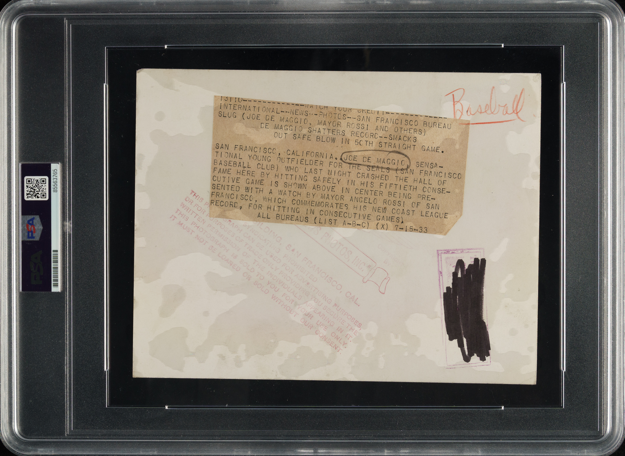 Original news photo of Joe DiMaggio as a member of the San Francisco Seals (Pacific Coast League) in 1933. Encapsulated and certified as an original type I photograph by PSA/DNA. DiMaggio is shown receiving a commemorative watch from the mayor of San Francisco the day after extending his hit streak to 50 games, establishing a new PCL record. His remarkable streak didn't end there, as DiMaggio pushed it to 61 games before it finally came to a close. The reverse features the original paper news caption and an "International News Photos" credit stamp. The photo (8.5 x 6.5 inches) exhibits scattered creasing and a corner bend (bottom left). Very Good condition overall.
