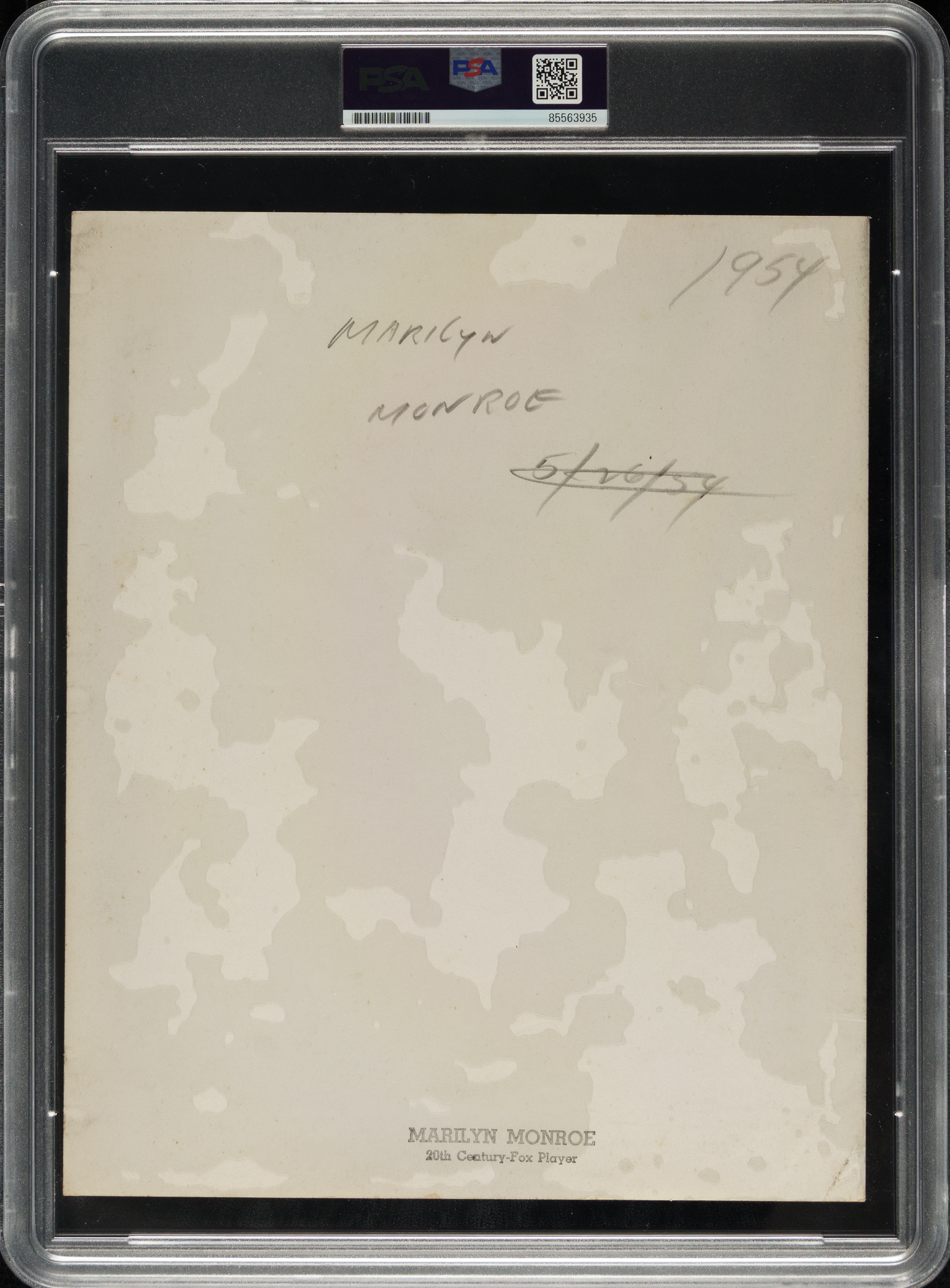 Original publicity photo of Marilyn Monroe, circa 1952. Encapsulated and certified as an original Type I photograph by PSA/DNA. Photo taken by renowned photographer Frank Powolny of 20th Century Fox for the 1952 film Monkey Business. Monroe's name and the year "1954" are written on the reverse. The photo (8 x 10 inches) displays light creasing and is in Very Good to Excellent condition overall.