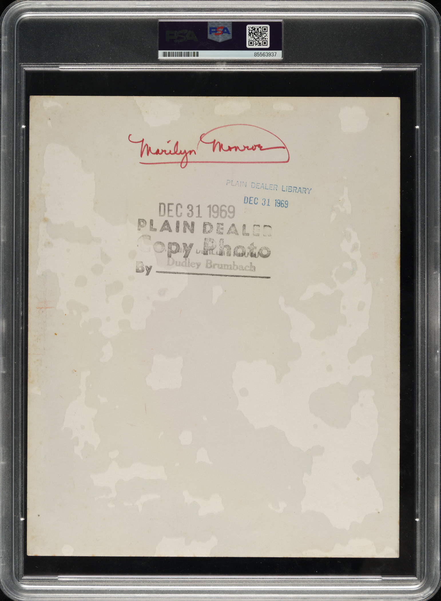 Vintage news photo of Marilyn Monroe from 1969. Encapsulated and certified as a Type IV photo by PSA/DNA. This image of Monroe, taken by photographer Phillipe Hallsman, was the cover image for the April 7, 1952, issue of Life Magazine. A pair of date stamps ("Dec 31 1969") along with Monroe's name appear on the reverse. The photo (8 x 10 inches) displays three pinholes around the perimeter and is in Very Good condition overall.