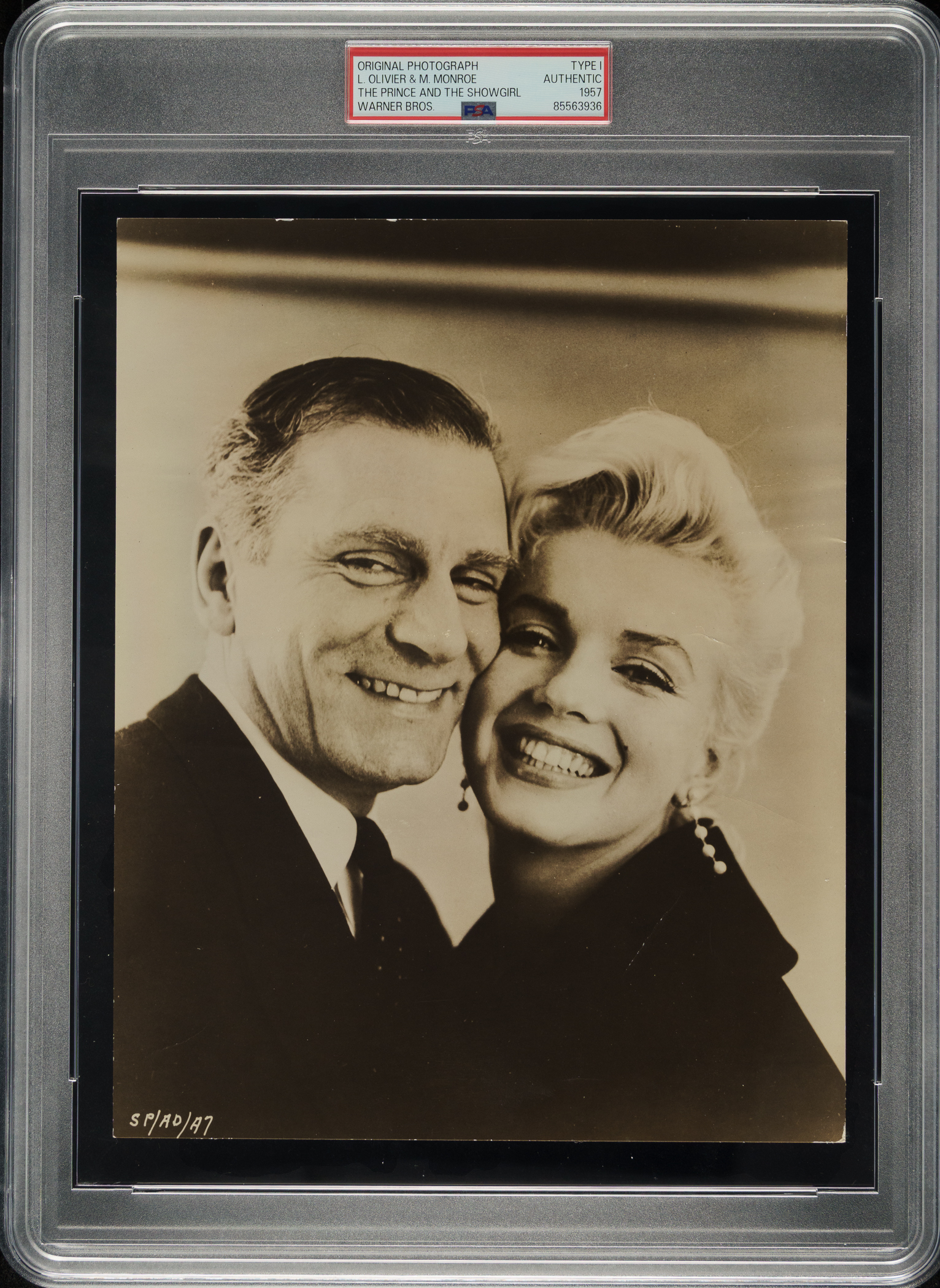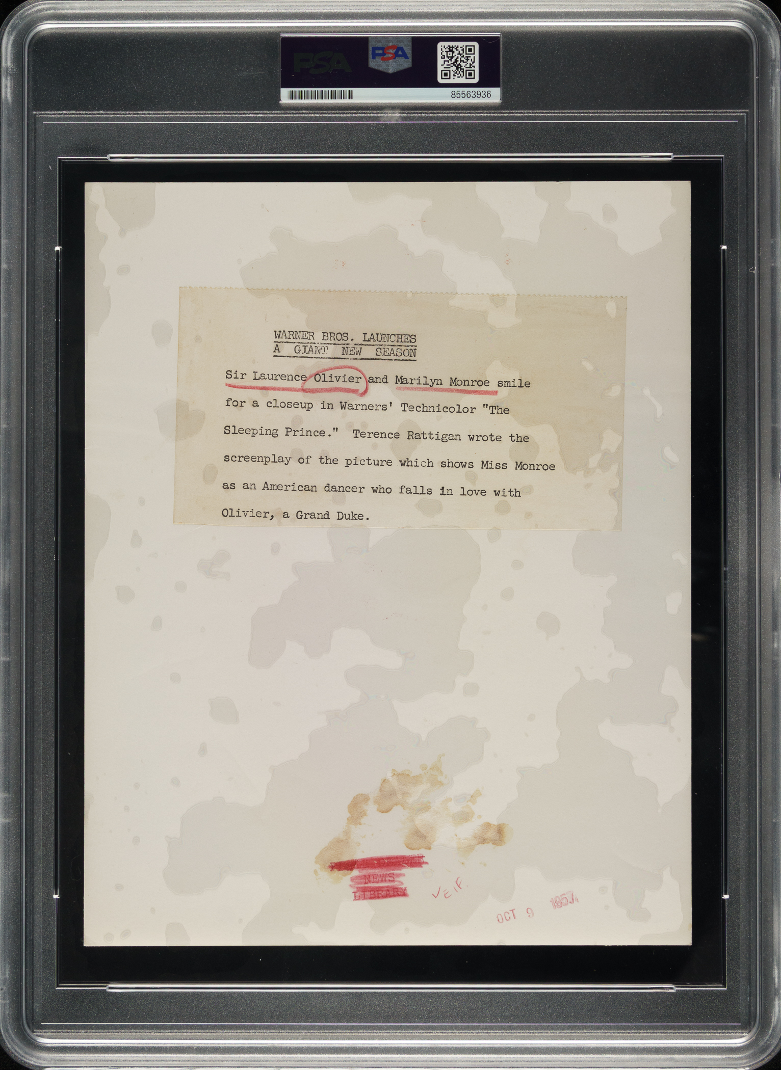 Original publicity photo of Marilyn Monroe and Laurence Oliver in 1957. Encapsulated and certified as an original Type I photograph by PSA/DNA. Photo taken for the 1957 film The Prince and the Show Girl. A paper news caption and an "Oct 9 1957" date stamp appear on the reverse. The photo, which has been trimmed to its current dimensions of 7-1/2 x 9-3/8 inches, displays a few creases and paper residue on the reverse. Very Good condition overall.