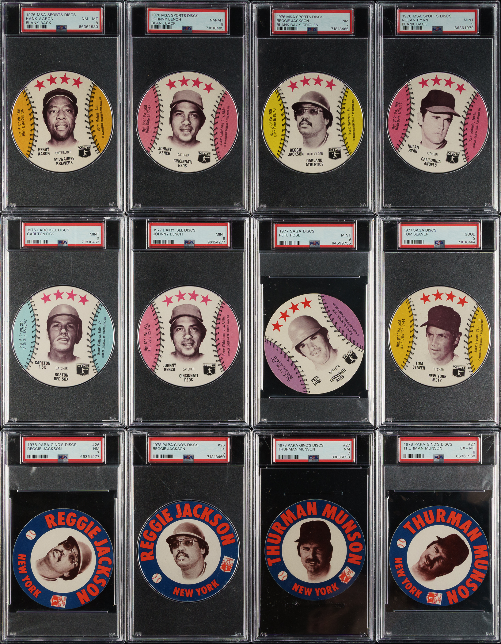 Collection of sixteen 1976 to 1978 Carousel, Saga, Dairy Isle discs, each graded and encapsulated by PSA. This collection consists of the following: 1) 1976 Carousel Discs (2 discs): Fisk (MINT 9) and B. Robinson (NM-MT 8). 2) 1976 MSA Sport Discs (6 discs): Two Aaron (MINT 9 and NM-MT 8), Bench (NM-MT 8), Jackson (NM 7), and two Ryan (both MINT 9). 3) 1977 Dairy Isle Discs (2 discs): Bench (MINT 9) and Seaver (GEM MINT 10). 4) 1977 Saga Discs (2 discs): Rose (MINT 9) and Seaver (GOOD 2). 5) 1978 Papa Gino's Discs (4 discs): Two #26 Jackson (NM 7 and EX 5) and two 27 (NM 7 and EX-MT 6). Total: 16 discs. The size/weight of this item requires that there will be an additional shipping charge for this lot.