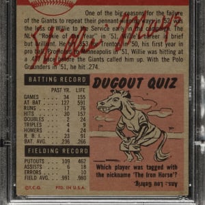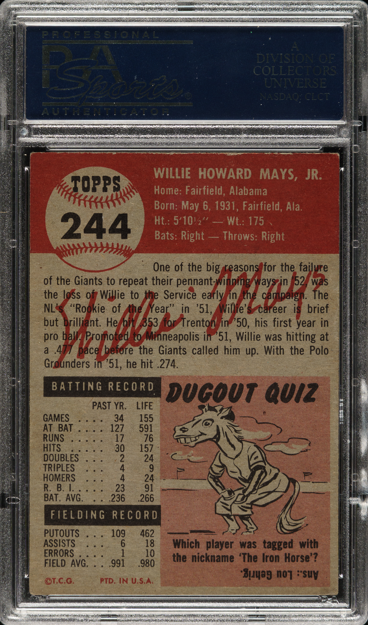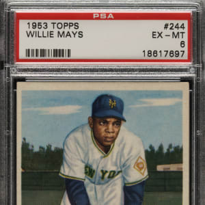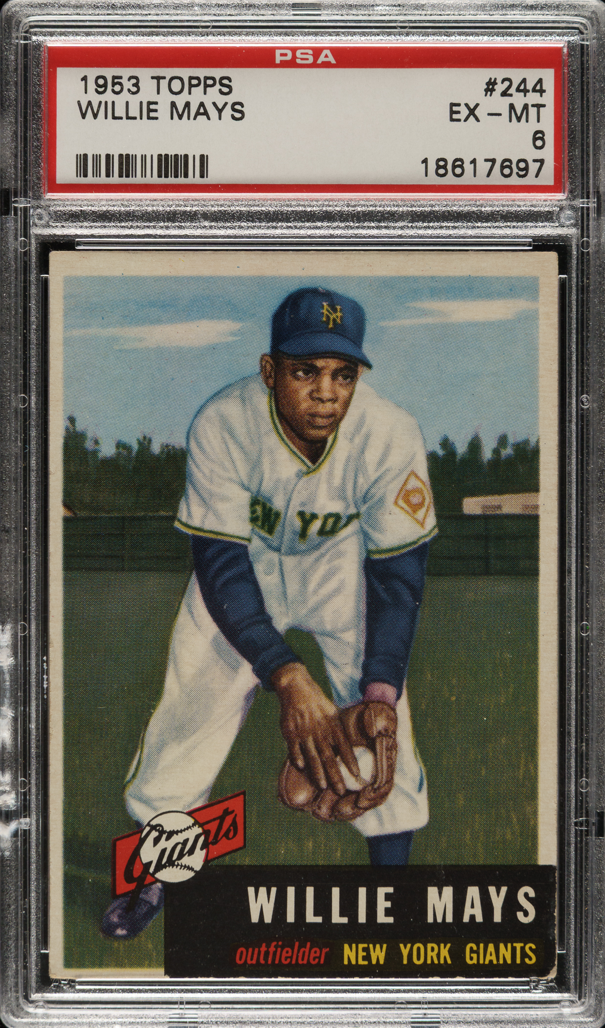 Graded EX-MT 6 by PSA. Mid-grade example of New York Giants Hall of Famer Willie Mays from the 1953 Topps set, one of the key cards of the 1950s, one of the most prized of all early Mays cards, and the key rare card in this classic set. The offered card has bold colors, a strong image, and light corner wear (weaker bottom right). Clean reverse. This is a solid mid-grade example of one of collecting's most famous cards and one that would be a worthy cornerstone in any high-quality 1950s Mays card collection.