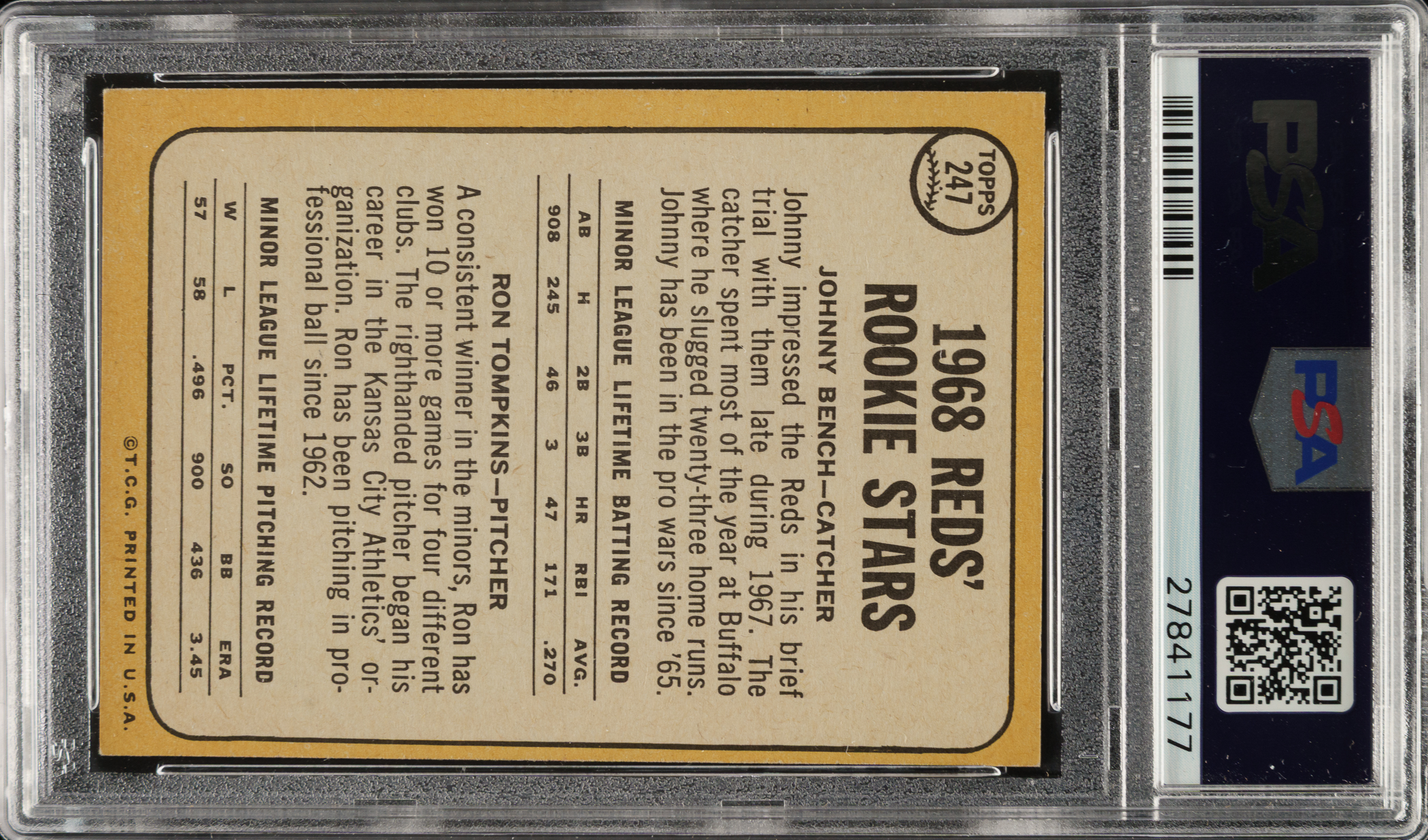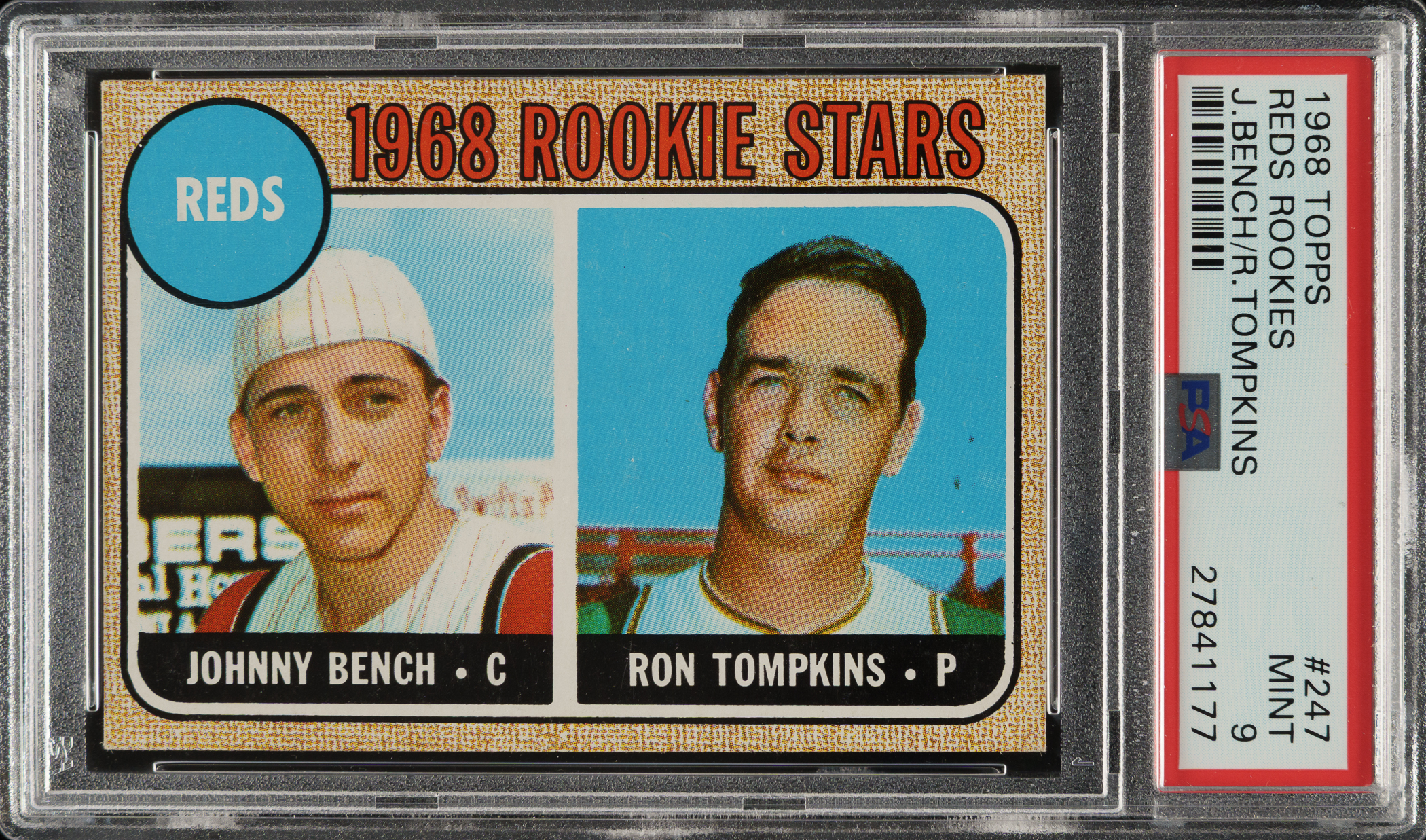 Graded MINT 9 by PSA. Outstanding high-grade rookie example of Cincinnati Reds Hall of Fame catcher Johnny Bench, one of the keys to the 1968 Topps set. This issue is prone to many different problems, including centering issues and print quality. This example has vibrant colors, superb print quality, and strong corners. Clean reverse. This card would be at home in any world-class Hall of Fame or rookie-card collection.
