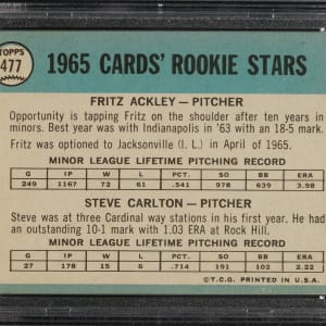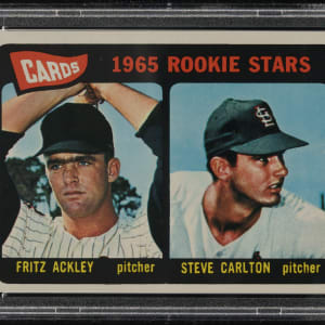 Graded MINT 9 by PSA. Exceptional high-grade example of Hall of Famer Steve Carlton's rookie card, one of the keys to the 1965 Topps set. The offered card has brilliant colors, a crisp image, sharp corners, and excellent centering. This stunning example would make an incredible addition to any world-class 1965 Topps set or Hall of Fame rookie-card collection.
