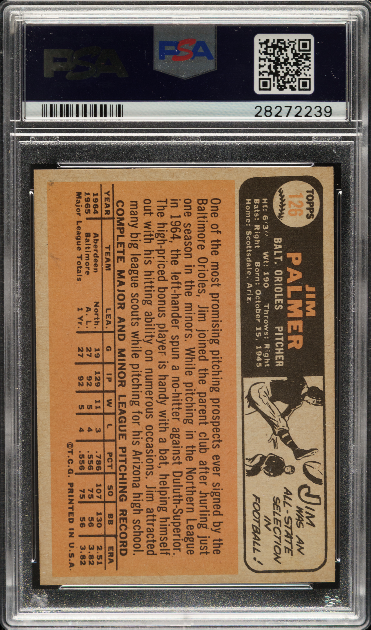 Graded MINT 9 by PSA. High-grade example of Hall of Famer Jim Palmer's rookie card, one of the key cards to the 1966 Topps set. No examples are graded higher out of 5,635 evaluated to date. Pack-fresh gem with impressive centering, sharp corners, flawless image, and a clean reverse. This stunning example would make an incredible addition to any high-grade 1966 Topps, Baltimore Orioles, or Hall of Fame rookie-card collection.