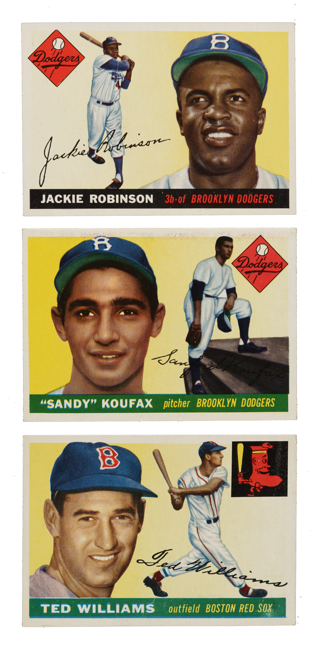 Presented is a very attractive near-complete set (198 out of 206) of the classic 1955 Topps issue, highlighted by Ted Williams, Jackie Robinson, Duke Snider and the rookie cards of Sandy Koufax and Harmon Killebrew. Missing the following eight cards for completion: #47 Aaron, 79, 154, 164 Clemente, 183, 194 Mays, 198 Berra, and 208. Forty-four cards have been professionally graded and encapsulated by PSA. PSA Grading Composite: NM 7 (8 cards): #17, 55, 70, 73, 108, 130, 157, and 168. EX-MT+ 6.5 (1 card): #12. EX-MT 6 (30 cards): #4 Kaline, 11, 22, 31 Spahn, 34, 35, 37, 38, 40, 41, 42, 52, 71, 75, 85, 95, 107, 124 Killebrew RC, 125 Boyer RC, 127, 152 Agganis RC, 156, 161, 174, 179, 181, 187 Hodges, 189 Rizzuto, 202, and 210 Snider. EX 5 (5 cards): #74, 117, 155 Mathews, 185, and 201. Condition of the 154-card unencapsulated balance is 20% Ex-Mt (including a few Nr/Mt), 69% Vg-Ex to Ex, and 11% Gd to Vg (including five altered and one with a slight trim). Unencapsulated Keys: #1 Rhodes (Vg-Ex), 2 Williams (pressed crease, otherwise Vg), 24 Newhouser (Vg-Ex+), 28 Banks (erasure mark on top border, otherwise Vg), 50 Robinson (Vg-Ex+), 100 Irvin (Ex due mostly to centering), 120 Kluszewski (Vg-Ex), and 123 Koufax RC (erasure marks on top border, otherwise Vg-Ex+). This is a strong, mostly mid-grade near-complete set of 1955 Topps, one of the most classic 1950s Topps series. The SMR value for just the 44 PSA-graded cards (factoring in the one half grade at the lower whole-grade level) is $3,390. Total: 198 cards. The size/weight of this item requires that there will be an additional shipping charge for this lot.