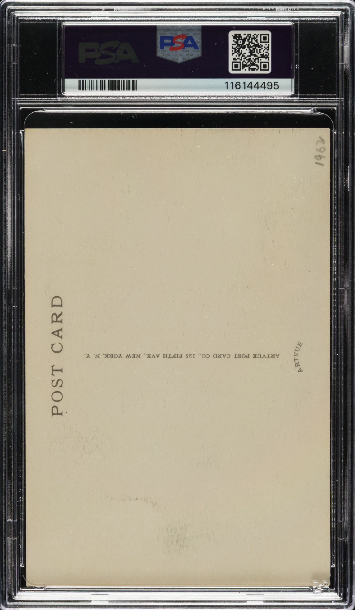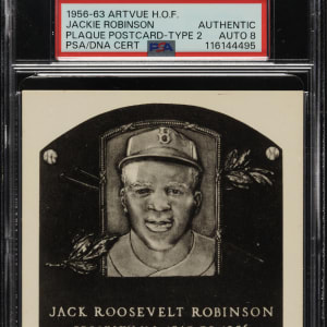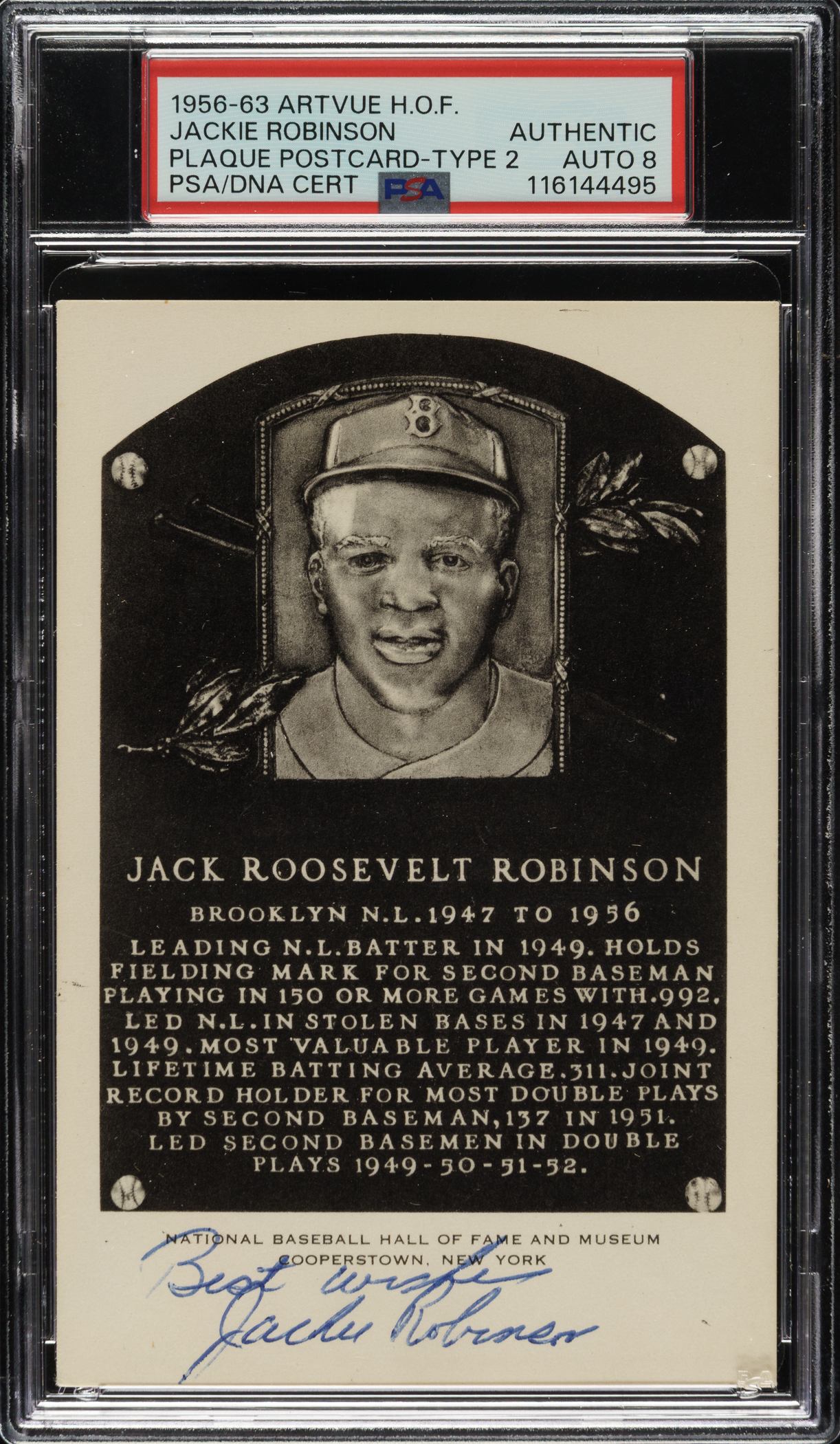 Black-and-white Hall of Fame postcard (Artvue Type 2) signed by Jackie Robinson. PSA/DNA has encapsulated the card and certified the signature as "Authentic." Robinson has inscribed the card in blue ink along the base, "Best Wishes/Jackie Robinson." The card (3.5 x 5.5 inches), which has the year "1962" written in pencil along the reverse and a small crease along the lower portion of the plaque, presents in Very Good to Excellent condition.