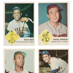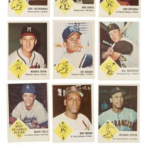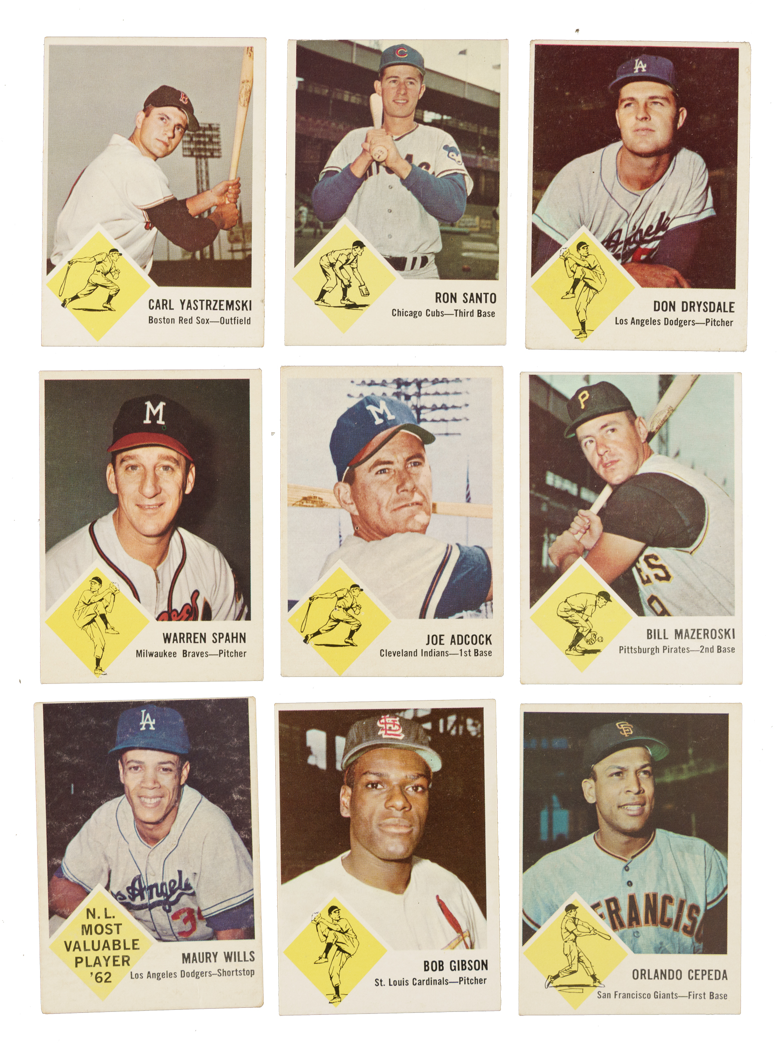 Near-complete set (66/67) of 1963 Fleer, missing just the Checklist card for completion. The 1963 Fleer set is considered by many to be among the most attractive as well as significant issues of the early 1960s. These cards have long been a special favorite of collectors, and with good reason: They are far rarer than Topps issues from the era; they are unusual; they have a great significance to the history of the "bubble-gum card wars;" and the set is relatively small and includes so many great stars from the golden era of the early 1960s. The fact that this set is very challenging to collect in high grade and has a rare checklist card (not included with this set) that is extremely difficult to find in high grade gives this set a mystique and all-the-greater appeal to serious collectors. Condition is 19% Ex or slightly better, 68% Vg to Vg-Ex, and 13% lesser (including one that measures small [#1 Barber] and one with a slight trim). Keys: #4 B. Robinson (2/98 L/R, otherwise Ex+), 5 Mays (Vg+), 8 Yastrzemski (Vg-Ex+), 32 Santo (0/100 T/B, otherwise Vg-Ex), 41 Drysdale (Vg), 42 Koufax (Vg-Ex), 43 Wills RC (small ink marks on reverse, otherwise Vg), 45 Spahn (Vg-Ex), 46 Adcock (Pr), 56 Clemente (Vg-Ex), 59 Mazeroski (Vg+), 61 Gibson (Ex), and 64 Cepeda (15/85 L/R, otherwise Ex). This is an attractive and consistent near-complete set (minus one) of this extremely popular and scarce early 1960s issue. Total: 66 cards.