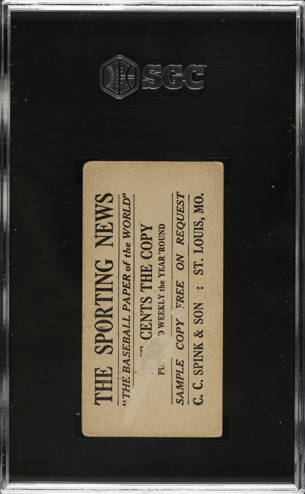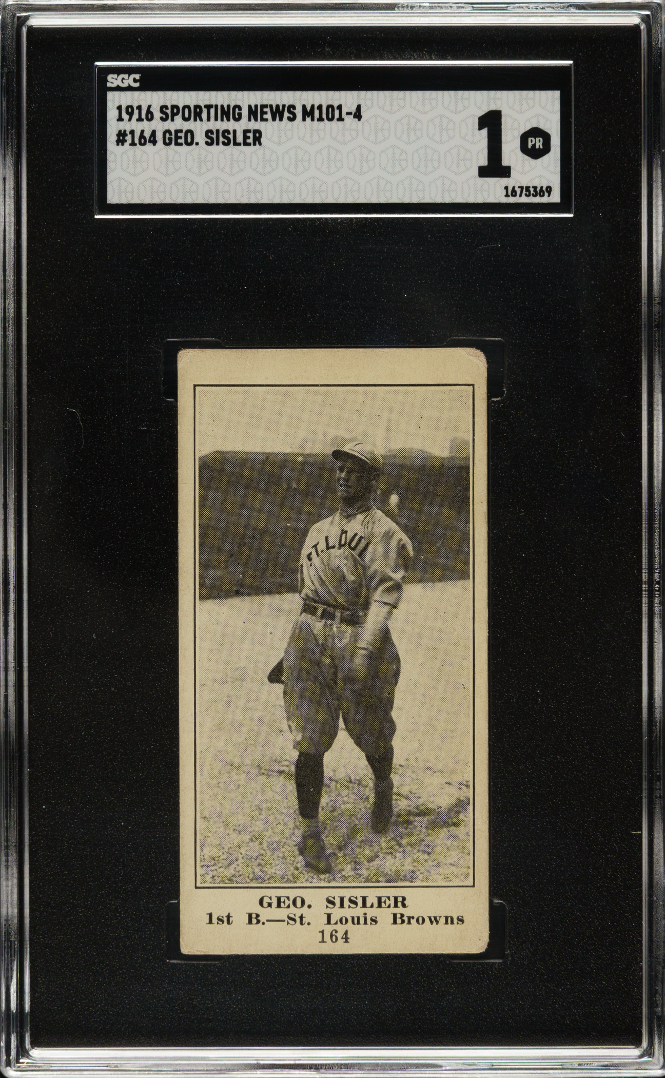 Presented is an attractive example of St. Louis Browns Hall of Famer George Sisler's rookie card from the M101-4 Sporting News series. The 1916 M101-4 set is one of the most highly regarded and comprehensive baseball-card sets of the era. The set is commonly referred to as issued by The Sporting News, but as most collectors know the set was actually issued by several different companies. Cards were printed with advertising for regional issuers as well as with blank backs. The offered card has a Sporting News advertising back. The M101-4 Sporting News set is recognized as one of the most significant of all prewar baseball-card issues. Bright and crisp, both front and back, with outstanding image contrast, honest corner wear, and excellent centering. Graded POOR 1 by SGC due to paper loss on the reverse. A worthy addition to even the most advanced George Sisler, Hall of Fame, or rookie-card collection!