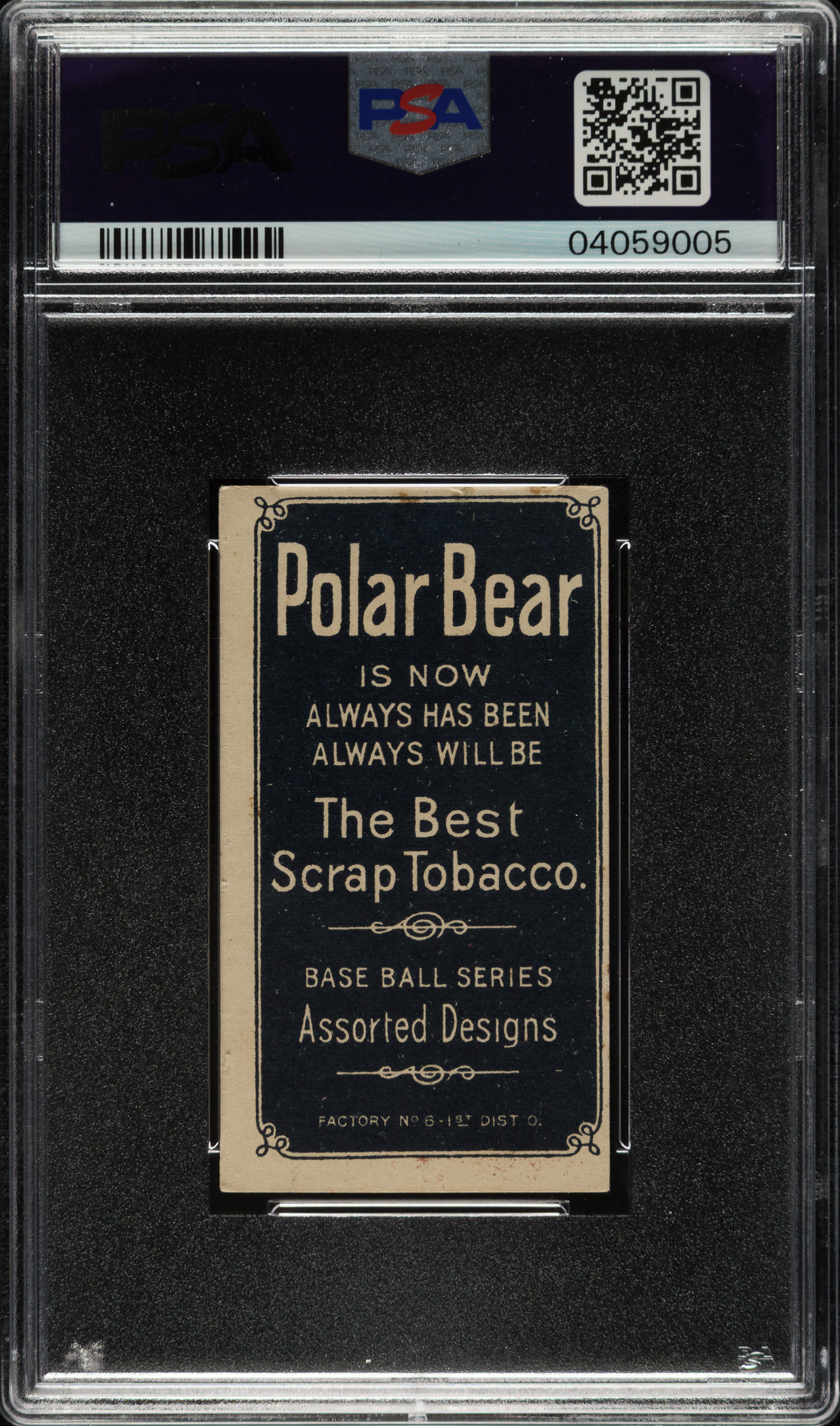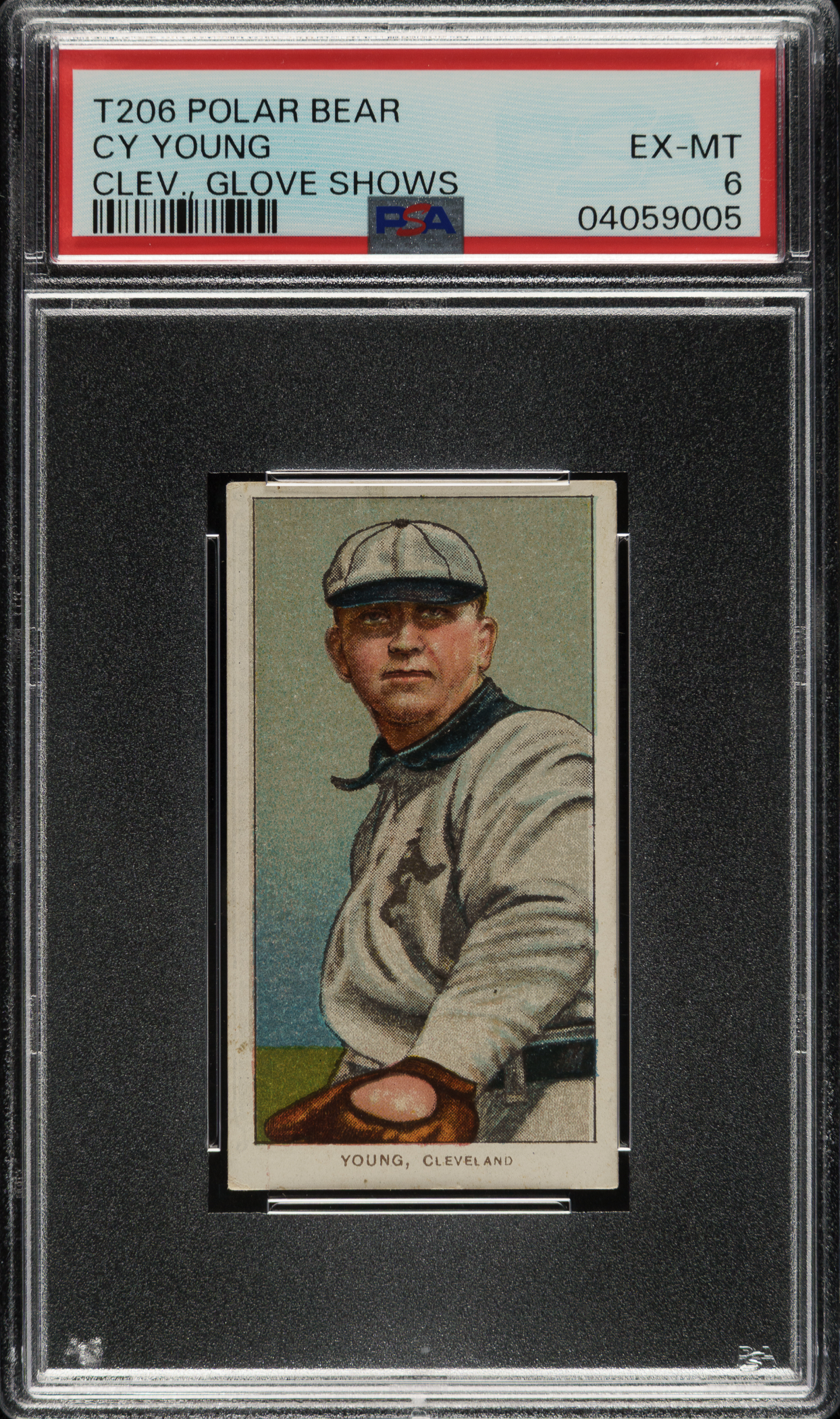 Graded EX-MT 6 by PSA. One of only two examples of this front/back combination graded at this level by PSA with none higher. Beautiful example of one of the three classic poses of Hall of Fame pitcher Cy Young from the T206 White Borders series. In addition to its high grade, the offered example boasts desirable Polar Bear advertising reverse. The high grade of this Polar Bear card is of special note. T206 cards issued with Polar Bear tobacco were not well protected from the accompanying product, which is why T206 cards with Polar Bear advertising reverses almost always have various condition problems, including tobacco staining. The card has brilliant colors, outstanding registration, and strong corners with light touches of wear. Boldly printed Polar Bear advertisement on the reverse, displaying a few tiny tobacco stains. This is an incredible high-grade rarity featuring Hall of Famer Cy Young from the classic T206 set, which would be an extremely significant highlight in even the most advanced T206, rare-back, or Cy Young collection.