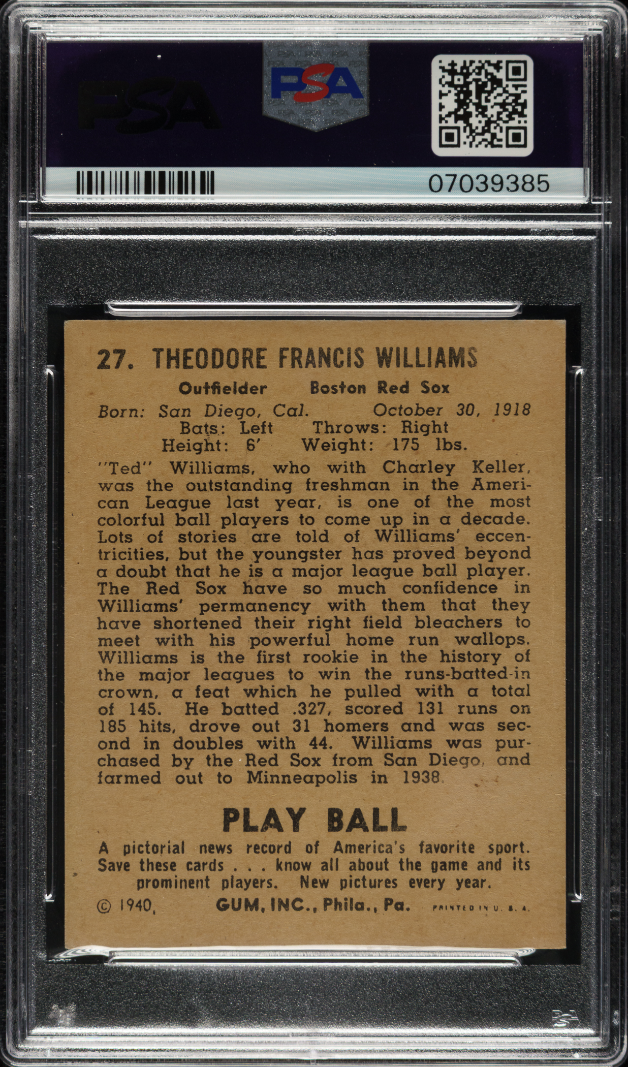 Graded NM 7 by PSA. Beautiful high-grade example of 1940 Play Ball #27 Ted Williams. The card displays a bold image, strong corners, and outstanding centering. Williams' biography on the back of this card was nothing less than effusive about his prospects for future greatness. The text details his amazing rookie feats the previous season, which included batting .327, collecting 31 home runs, scoring 131 runs with 185 hits and being the first rookie ever to lead the Majors in RBI, with 145. This is a very attractive high-grade example of one of Ted Williams’ classic cards, dating from his second year in the Major Leagues.