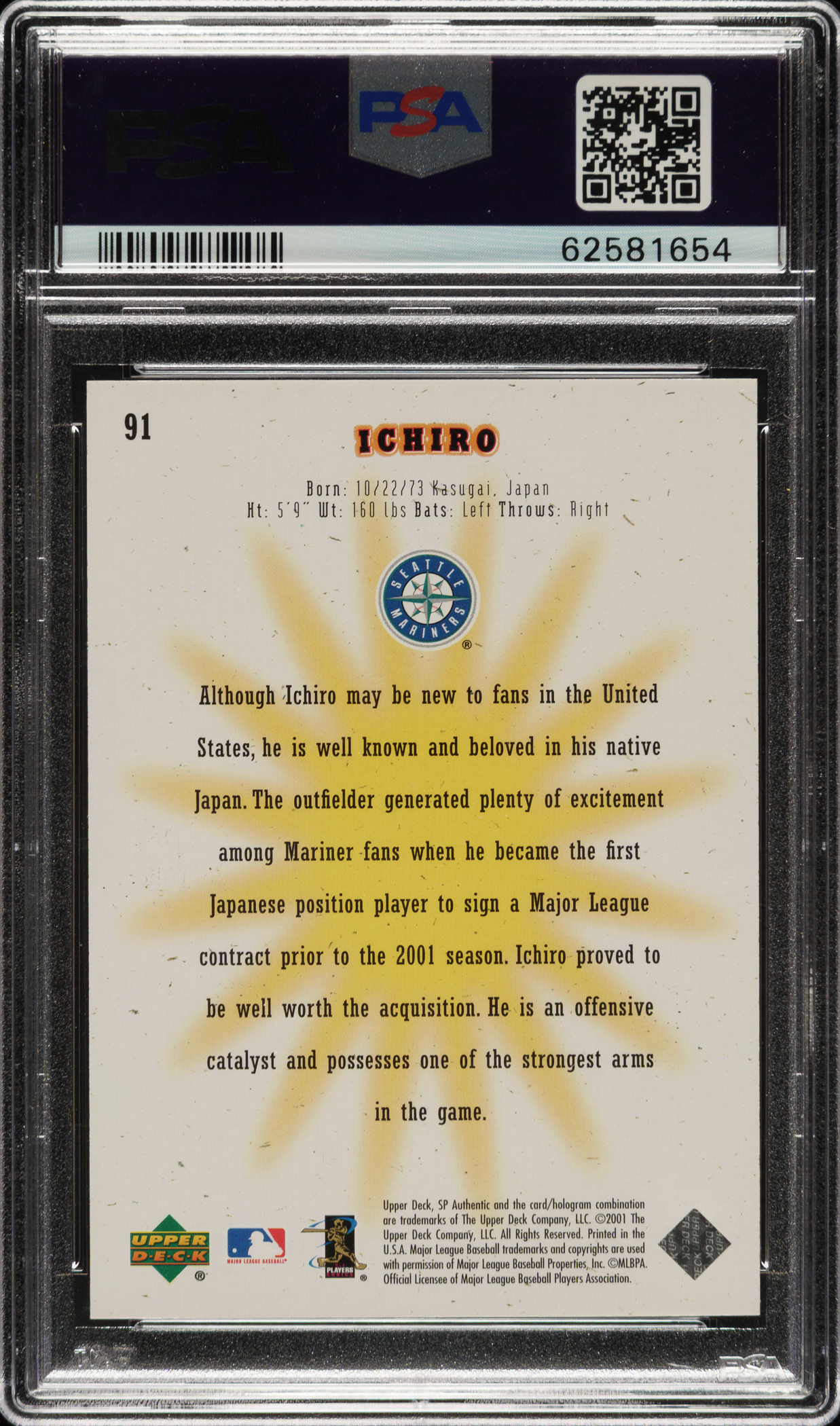 Graded GEM MINT 10 by PSA. Exceptional example of Seattle Mariners Hall of Famer Ichiro Suzuki's rookie card from the 2001 SP Authentic Future Watch series. This card boasts vibrant colors, a clean surface, and sharp corners. Numbered 1123/1250 on the front. A stunning example of this rookie card in tremendous high grade!