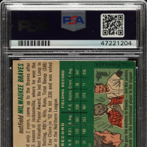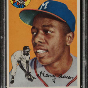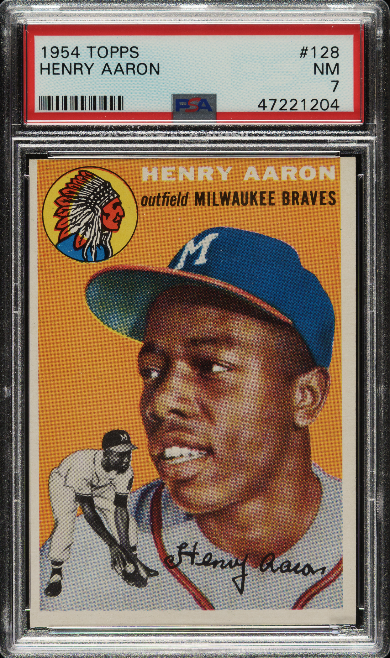 Graded NM 7 by PSA. High-grade example of Milwaukee Braves Hall of Famer Hank Aaron's rookie card. One of card collecting's classics, this card is the key to the 1954 Topps set and one of the most popular of all postwar baseball cards. This card exhibits vibrant colors, outstanding registration, and strong corners with light touches of wear. A light print line is visible near the center of the reverse (noted for accuracy). A very attractive high-grade example.