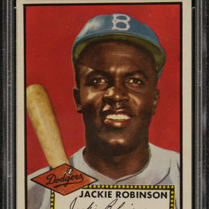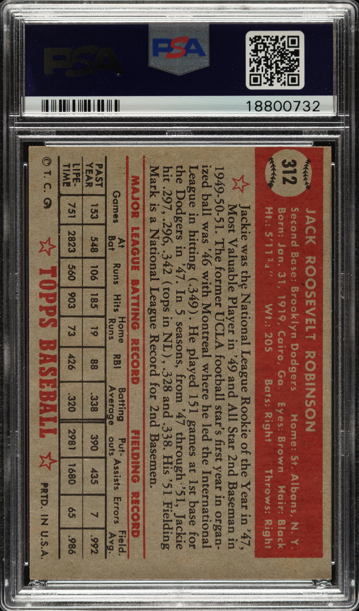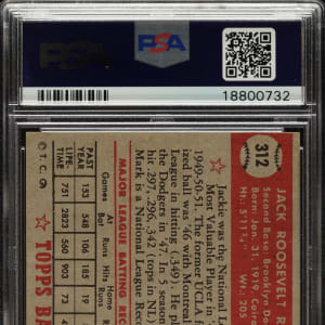 Graded EX-MT 6 by PSA. Extremely attractive card of Brooklyn Dodgers Hall of Famer Jackie Robinson from the legendary 1952 Topps issue. In addition to being one of the key cards to this classic set and one of the most famous of all postwar cards, Robinson's 1952 Topps card is part of the rare high-number series (although his card was double-printed and is therefore slightly more available than others from the same series). The offered card has a brilliant red background, outstanding registration, and strong corners with light touches of wear. Clean reverse. Frequently overshadowed by the #311 Mantle from the same set (which is also a high-number series card and also double-printed), #312 Robinson is one of the few cards that defines the 1952 Topps set. Robinson is also one of the few Hall of Famers found in the high-number series. This is a fantastic example.