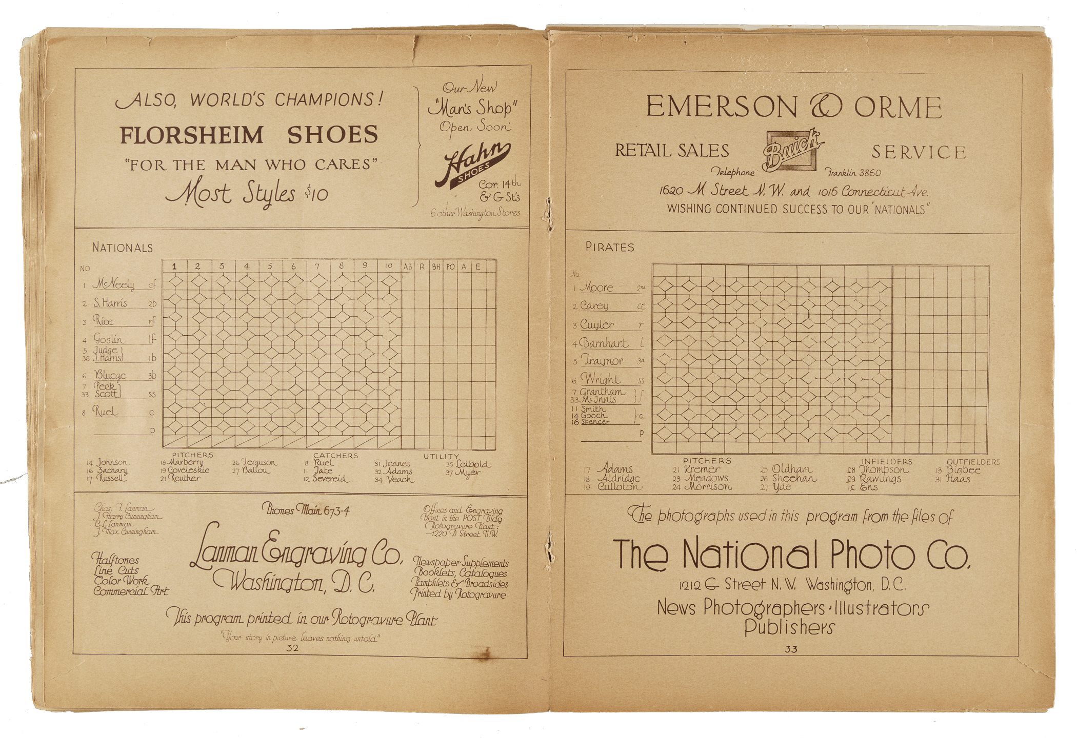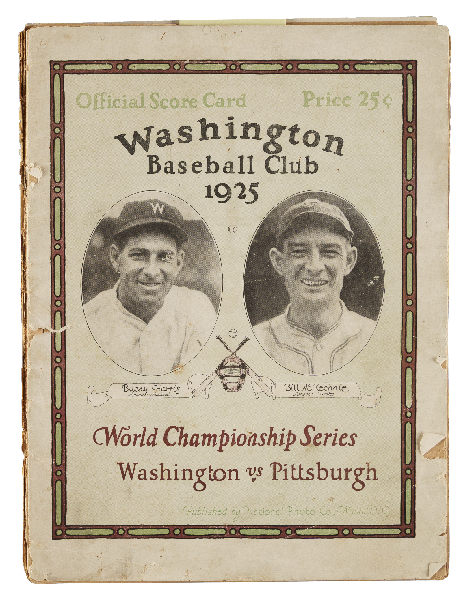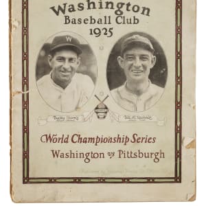 Washington Senators program issued for the 1925 World Series against the Pittsburgh Pirates. The program, produced by National Photo Company of Washington, D.C., was a particularly ambitious effort and is comprised of 64 sepia-toned pages packed with literally hundreds of photos. Large portrait images of managers Bucky Harris and Bill McKechnie are featured on the cover. 1925 Washington Senators World Series programs are one of the most condition-sensitive of all early World Series programs. Unfortunately, they are rarely found in high-grade due to the very thin, easily damaged quality of their interior pages. The offered program (8 x 10.5 inches) displays heavy wear, creasing, and several edge tears. Both covers and all the interior pages are either fully or mostly detached from the spine. Poor condition overall.