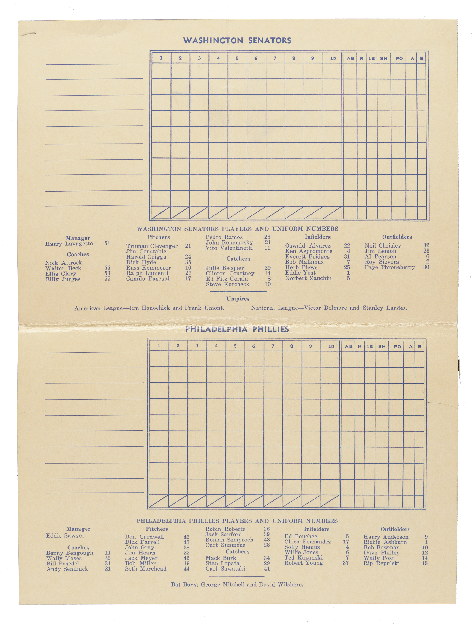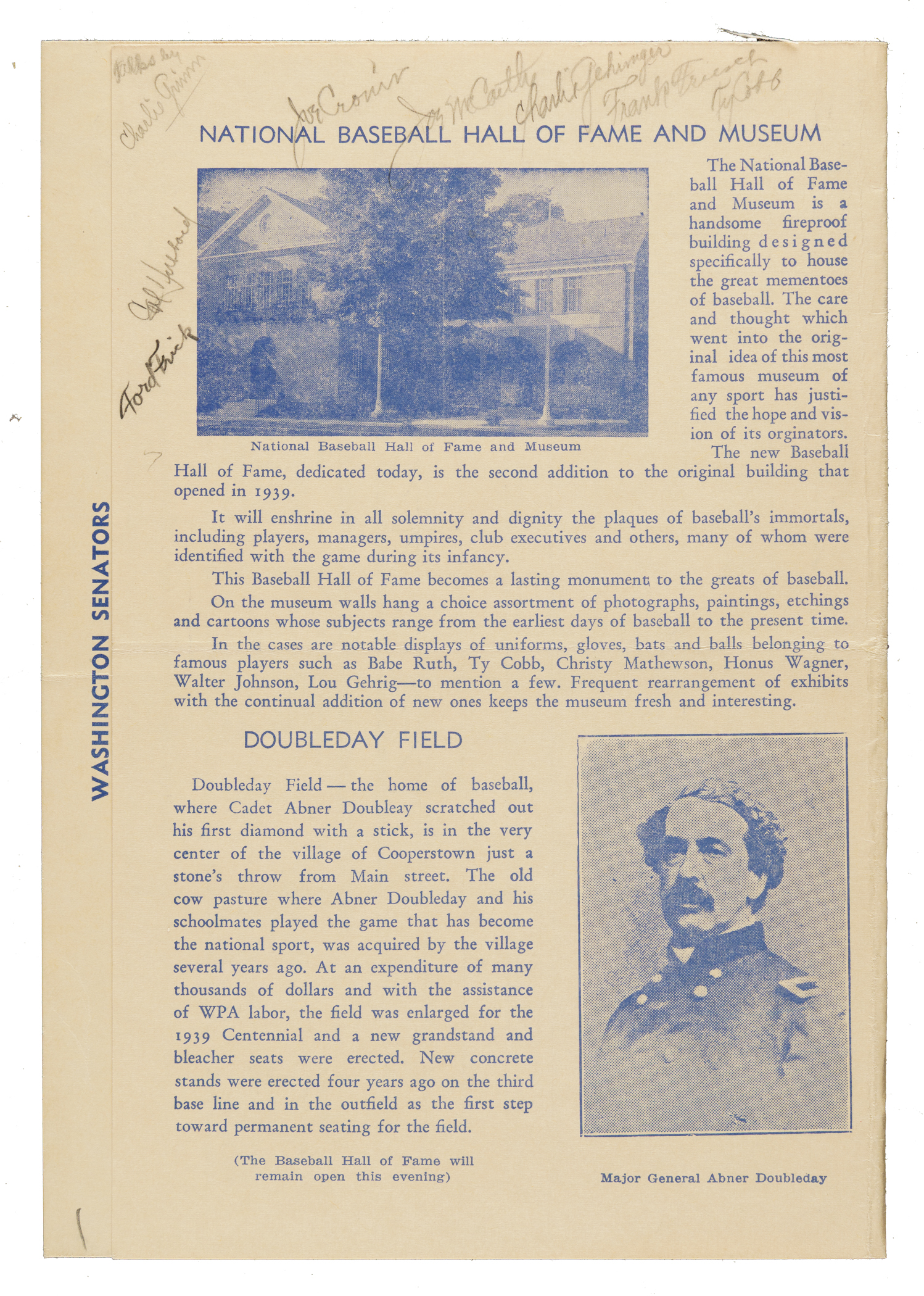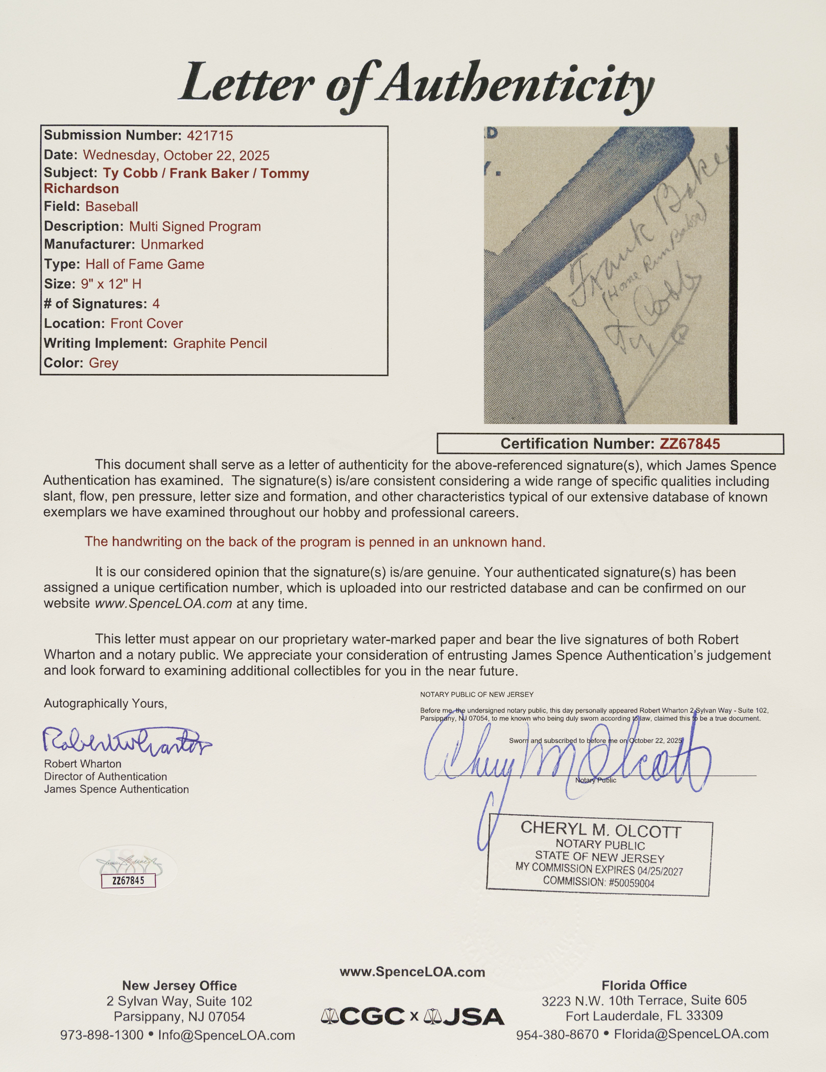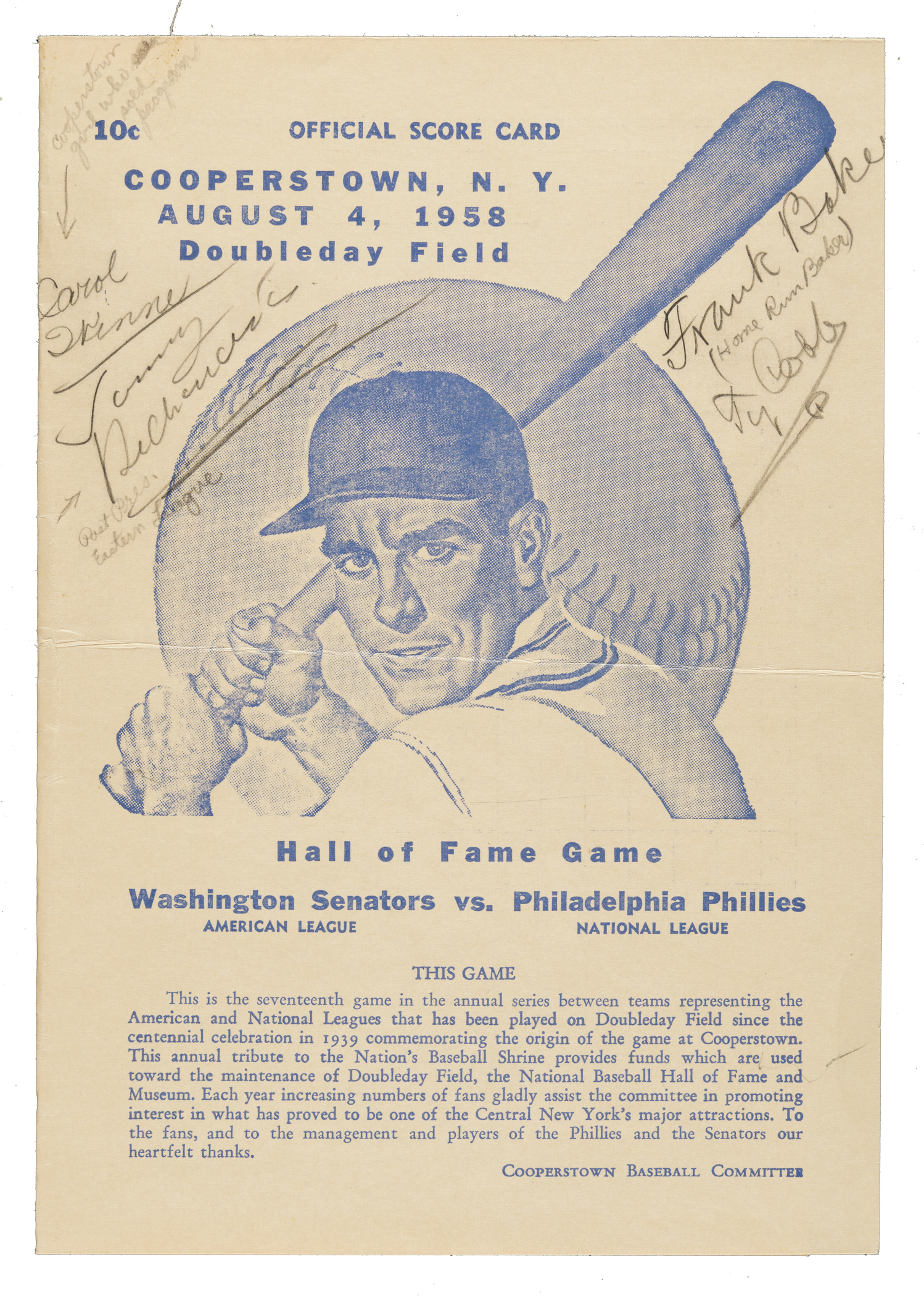 Official scorecard issued for the Hall of Fame game between the Washington Senators and Philadelphia Phillies on August 4, 1958, at Doubleday Field in Cooperstown, New York, signed by four individuals, including Frank Baker and Ty Cobb. The fold-over card (12 x 9 inches, unfolded) displays a horizontal fold down the middle. Good to Very Good condition overall. Per James Spence/JSA, "The handwriting on the back of the program is penned in an unknown hand." Full LOA from James Spence/JSA.