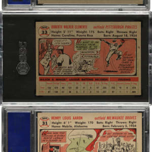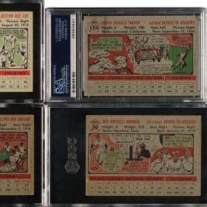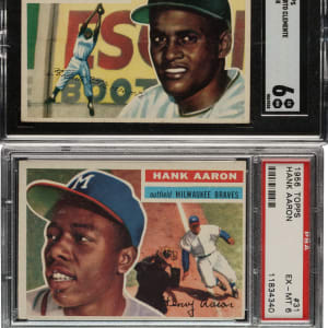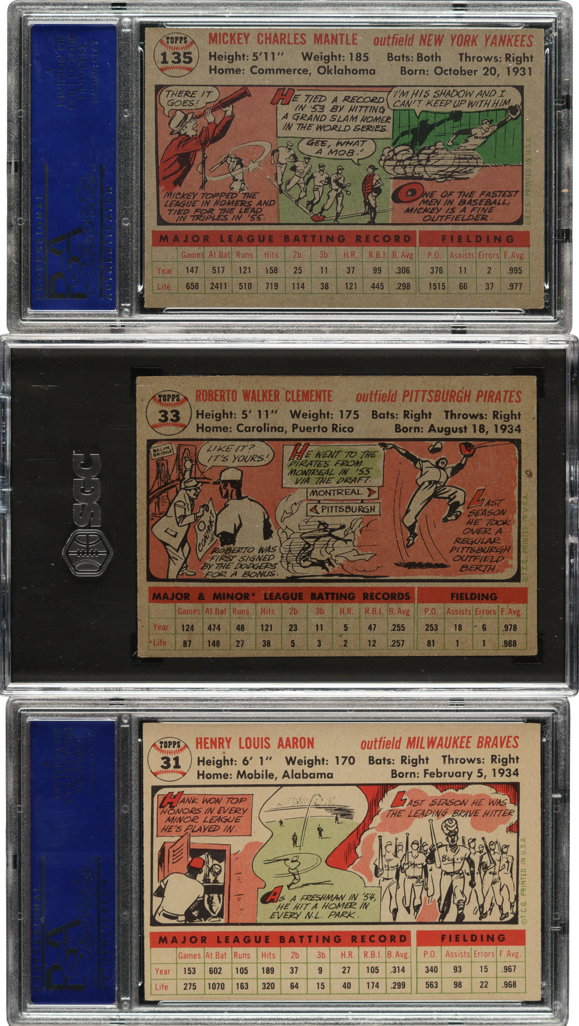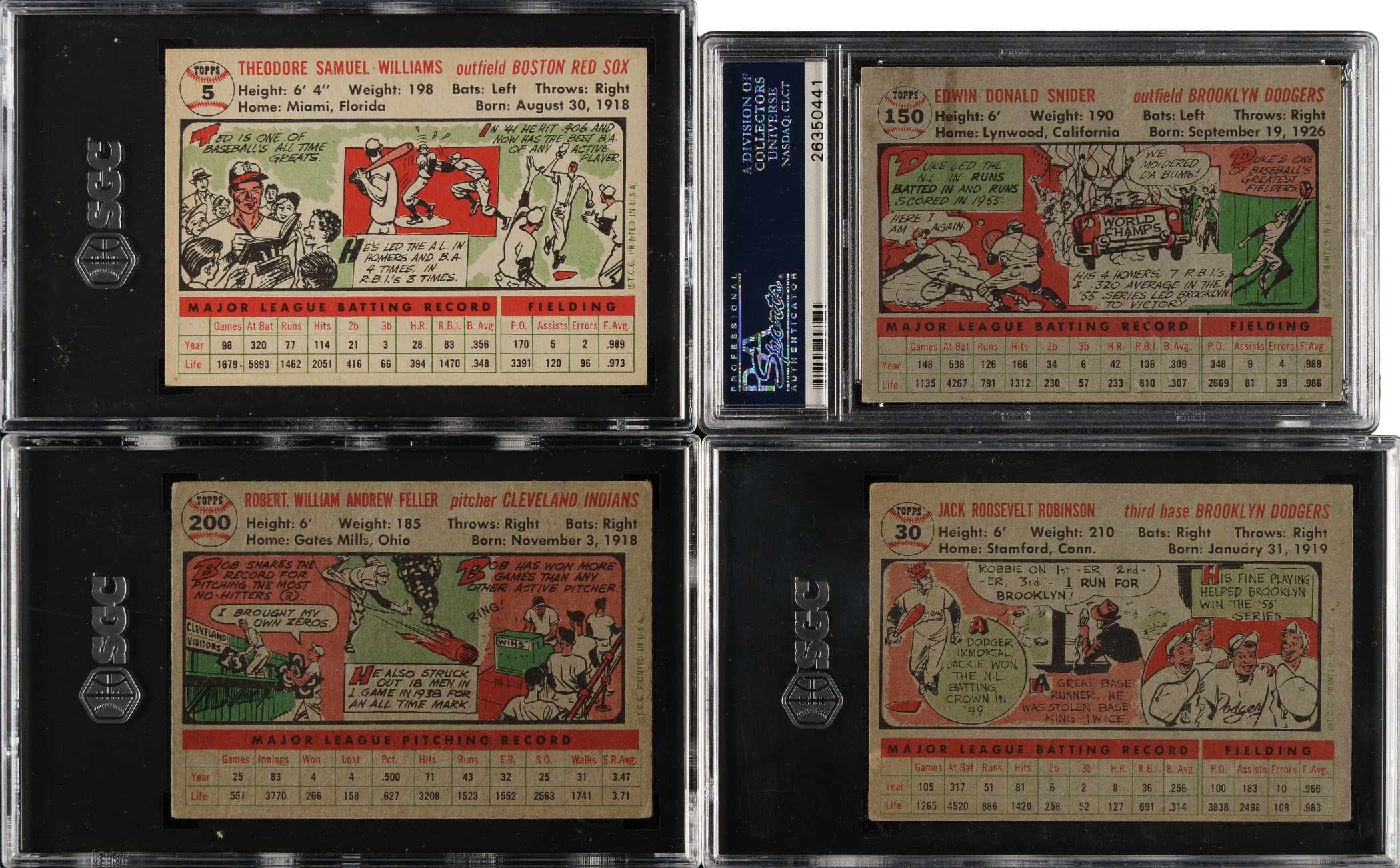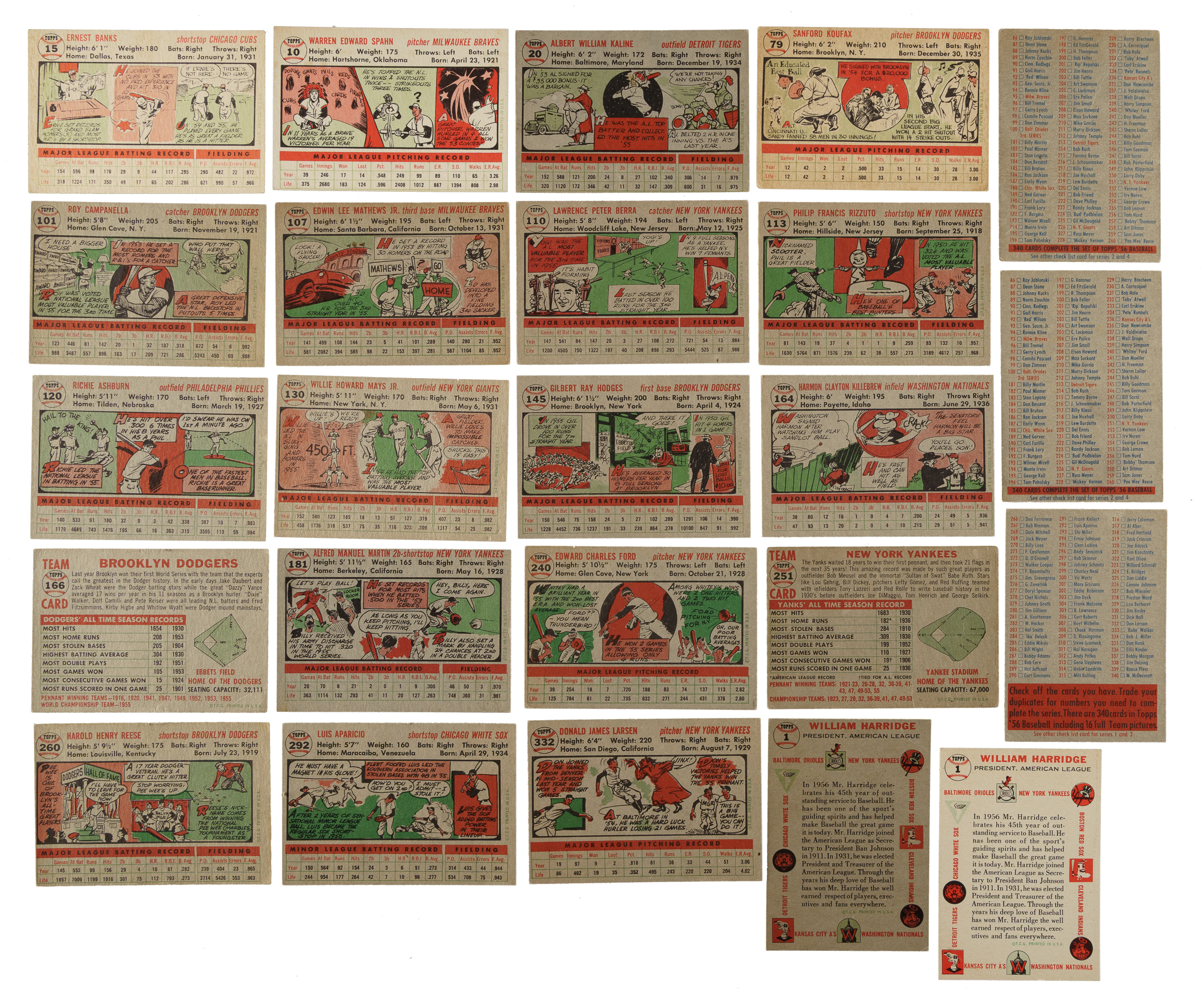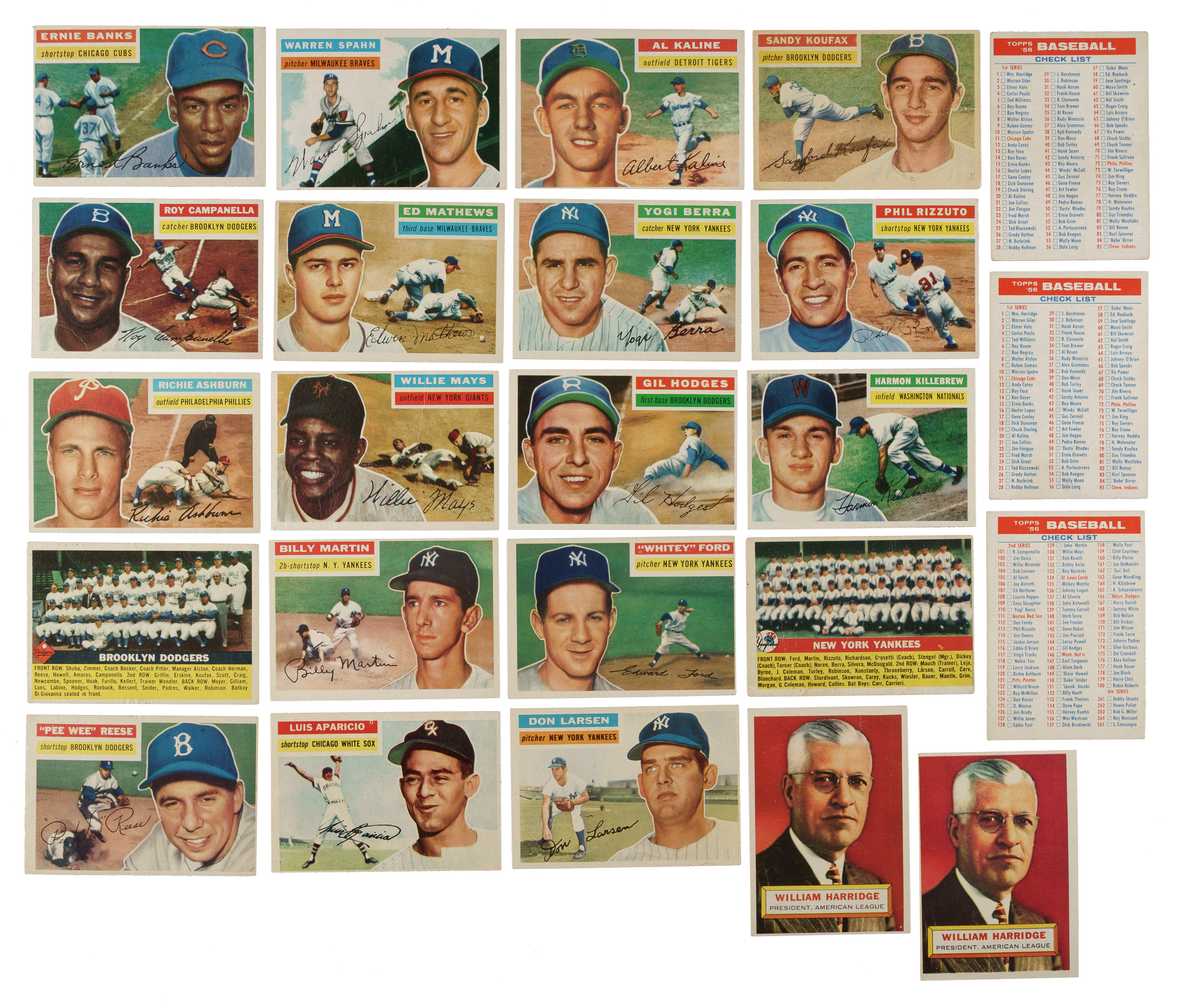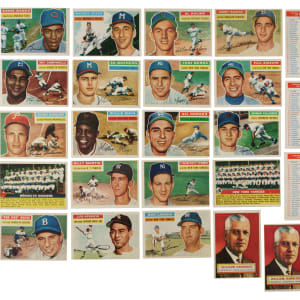 Outstanding mid-grade complete set of 1956 Topps featuring all the Hall of Famers and stars of the era, including Mickey Mantle, Hank Aaron, and Willie Mays. Included are both checklists plus a duplicate of Checklist 1/3 and one back variation (#1 Harridge). Condition is 35% Ex to Ex-Mt (approximately two-thirds Ex), 60% Vg to Vg-Ex, and 5% lesser. Seven cards have been professionally graded and encapsulated by SGC (4) and PSA (3). This set includes 91 significant gray back variations (#1-100). Keys: Two #1 Harridge (Vg, gray back and Gd, white back), 5 Williams (EX/NM 6, white back), 10 Spahn (Vg-Ex+, white back), 15 Banks (5/95 L/R, otherwise Vg-Ex+, white back), 20 Kaline (95/5 T/B, otherwise Vg-Ex, gray back), 30 Robinson (VG 3, gray back), 31 Aaron (PSA EX-MT 6, white back), 33 Clemente (EX/NM 6, gray back), 79 Koufax (Fr, white back), 101 Campanella (Vg, gray back), 107 Mathews (Vg, gray back), 110 Berra (Vg-Ex, gray back), 113 Rizzuto (Vg-Ex+, gray back), 120 Ashburn (Vg-Ex, gray back), 130 Mays (Pr-Fr, gray back), 135 Mantle (PSA EX-MT 6, gray back), 145 Hodges (Ex, gray back), 150 Snider (PSA EX-MT 6, gray back), 164 Killebrew (Ex, gray back), 166 Dodgers (Fr, gray back), 181 Martin (Vg-Ex), 200 Feller (VG+ 3.5), 240 Ford (90/10 L/R, otherwise Vg+), 251 Yankees (Fr), 260 Reese (Vg), 292 Aparicio RC (85/15 T/B, otherwise Ex), 332 Larsen (Vg-Ex), two Checklist 1/3 (Vg-Ex and Vg), and Checklist 2/4 (Vg-Ex). This is a very attractive and consistent complete set of this classic 1950s Topps issue. Total: 344 cards (set of 340 plus three checklists and one back variation).