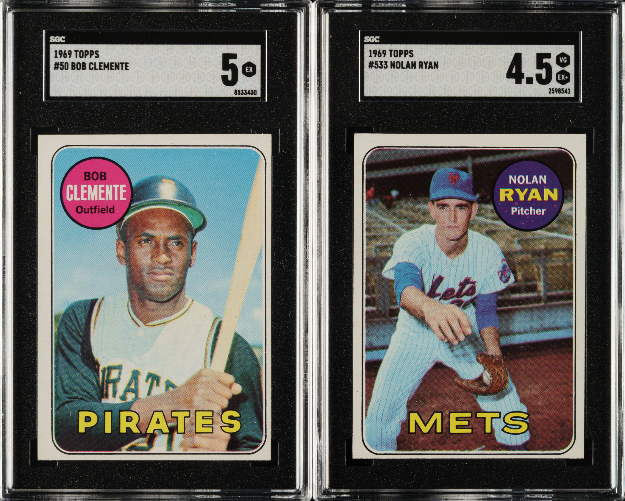 Presented is a very substantial shoebox collection of 1,817 assorted cards from three 1960s Topps baseball sets. This collection is highlighted by 119 Hall of Famers, including Mickey Mantle, Willie Mays, Hank Aaron, Nolan Ryan, and the rookie cards of Jim Palmer and Reggie Jackson. We have selected six cards for grading and encapsulation by SGC. This collection consists of the following: 1) 1966 (590 cards, including 276 different): Condition is 37% Ex to Ex-Mt (including 3% Nr/Mt), 40% Vg to Vg-Ex, and 23% lesser. Keys: #30 Rose (Fr), two 50 Mantle (Fr and Pr), two 70 Yastrzemski (both Ex), 80 Allen, three 90 Aparicio, 99 Buc Belters, two 100 Koufax (SGC EX/NM 6 and Ex), 110 Banks (Gd+ due to light stain, two 120 Killebrew (Vg-Ex+ and Gd+), four 126 Palmer RC (SGC EX 5, Vg+, Vg, and Gd), three 132 Cepeda, three 160 Ford (Ex, Vg+, and Pr-Fr), 215 NL Batting Ldrs (Ex), two 217 NL HR Ldrs, two 219 NL RBI Ldrs, two 320 Gibson (Ex-Mt and Ex+), two 390 B. Robinson (both Nr/Mt), 410 Kaline (Ex+), 420 Marichal, 430 Drysdale (Ex+), and 445 Kaat. 2) 1967 (730 cards, including 260 different): Condition is 85% Vg to Vg-Ex (approximately two-thirds Vg and including 2% better) and 15% lesser. Keys: #30 Kaline (Gd), 55 Drysdale (Vg-Ex), two 100 F. Robinson (both Vg-Ex), six 103 Checklist - Mantle (Nr/Mt, Vg-Ex+, and four Pr due to marks), 131 Yankees Team, two 150 Mantle (SGC GOOD 2 and Fr), three 166 Mathews (Ex+, Vg+, and Fr), 200 Mays (Vg), three 210 Gibson (Vg-Ex, Vg, and Pr-Fr), six 215 Banks (Ex-Mt, Ex, Vg-Ex and three Vg), four 250 Aaron (Vg-Ex, two Vg, and Fr), 300 Kaat, and two 355 Yastrzemski (Ex and Vg+). 3) 1969 (497 cards, including 252 different): Condition is 27% Ex-Mt or better, 57% Vg-Ex to Ex, and 16% Gd to Vg (including a few lesser). Keys: #20 Banks (Ex+), two 50 Clemente (SGC EX 5 and Vg-Ex), 75 Aparicio, three 85 Brock (Ex-Mt, Ex, and 95/5 L/R, otherwise Ex), 95 Bench (Vg), two 100 Aaron (both Fr), two 120 Rose (Vg-Ex and Gd due to stain), three 130 Yastrzemski (Ex-Mt, Vg-Ex, and miscut left edge, otherwise Vg-Ex), three 175 Bunning, 190 Mays (Gd), two 200 Gibson (slightly miscut left edge, otherwise Vg-Ex and 100/0 L/R, otherwise Ex+), four 216 Sutton, 235 Hunter, 237 Cox RC (Vg-Ex), two 250 F. Robinson (Ex and Vg-Ex+), 255 Carlton (Ex), two 260 Jackson RC (SGC VG/EX 4 and 5/95 L/R, otherwise Vg), two 290 Kaat, 295 Perez, 370 Marichal, 375 Killebrew (Fr), 410 Kaline (miscut right edge, otherwise Vg), three 419 Carew AS, 424 Rose AS, two 425 Yastrzemski AS, four 440 McCovey (Ex, two Vg-Ex, and Vg), two 485 Perry, 500 Mantle (Pr), 510 Carew (90/10 T/B, otherwise Ex), two 533 Ryan (SGC VG/EX+ 4.5 and Fr), 539 Ted Shows How, 545 Stargell (Ex+), two 550 B. Robinson (Ex+ and Vg-Ex+), 573 Palmer (Vg-Ex), three 630 Bonds RC, two 640 Jenkins, and two 653 Rodriguez RC. This is a very impressive collection of cards from these classic 1960s Topps sets with numerous highlights and scores of stars and Hall of Famers. Total: 1,817 cards. The size/weight of this item requires that there will be an additional shipping charge for this lot.