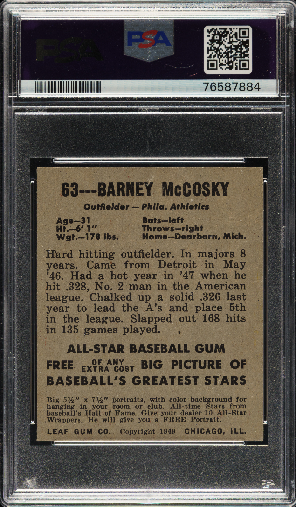 Lot # 1053: 1948-1949 Leaf #63 Barney McCosky Short Print PSA VG-EX 4