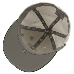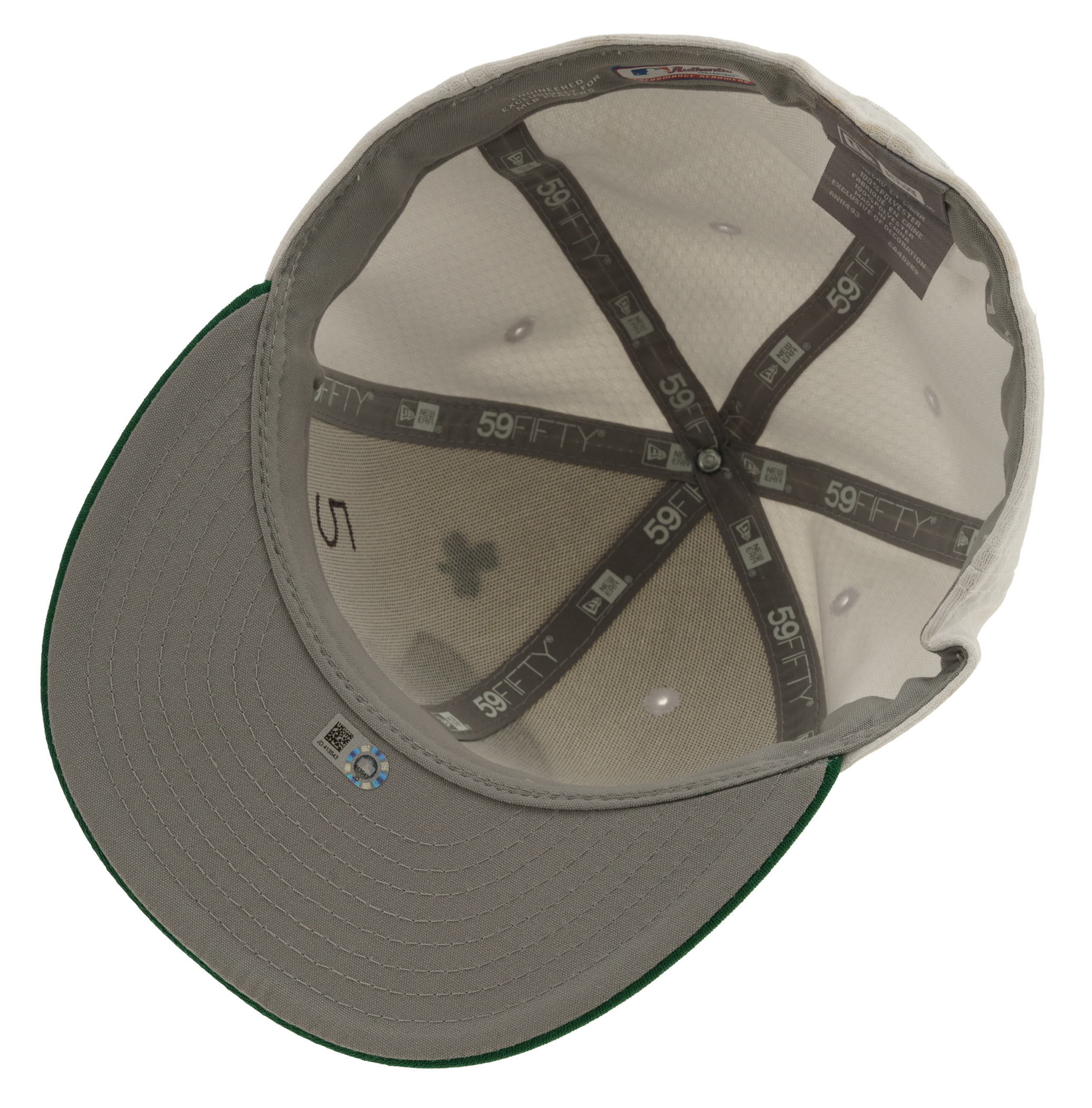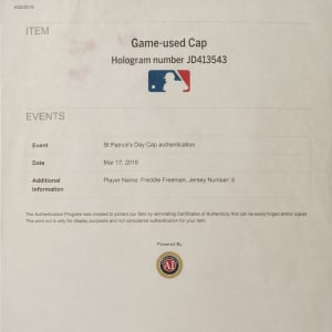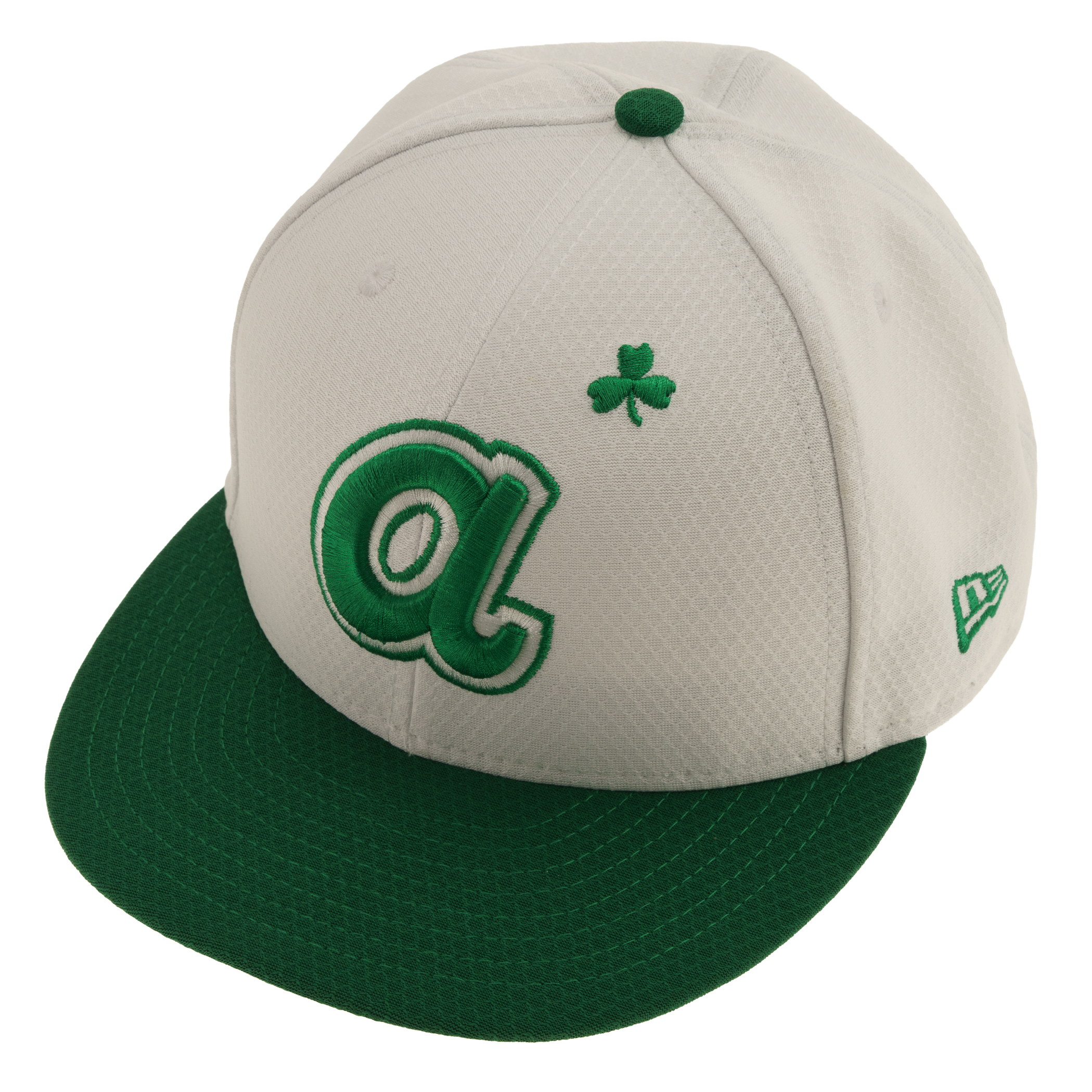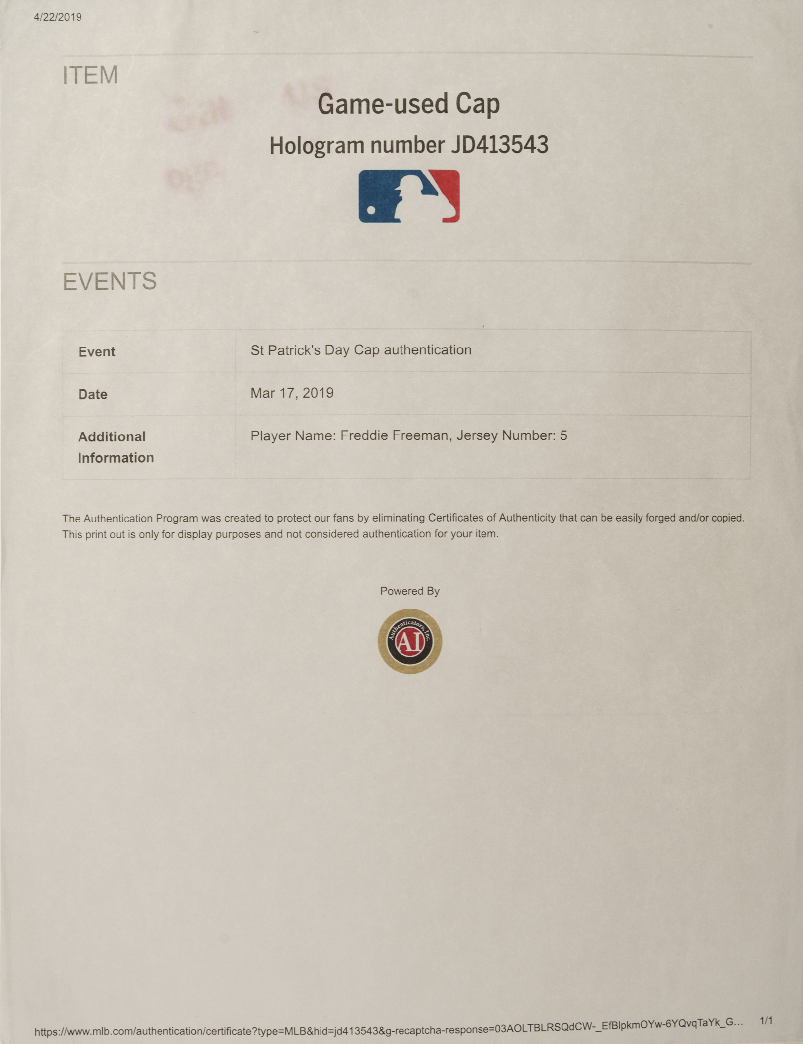 Atlanta Braves cap worn by future Hall of Famer Freddie Freeman during a spring training game on St. Patrick's Day in 2019. The white and green cap has the Braes logo on the front. The Major League logo is embroidered on the rear of the cap. The manufacturer's tag ("New Era") and size tag ("7 1/2") appear on the interior headband. Freeman's number "5" is scripted in black marker along the interior. The cap has little to no wear. An MLB certification sticker is affixed to the underside of the cap.