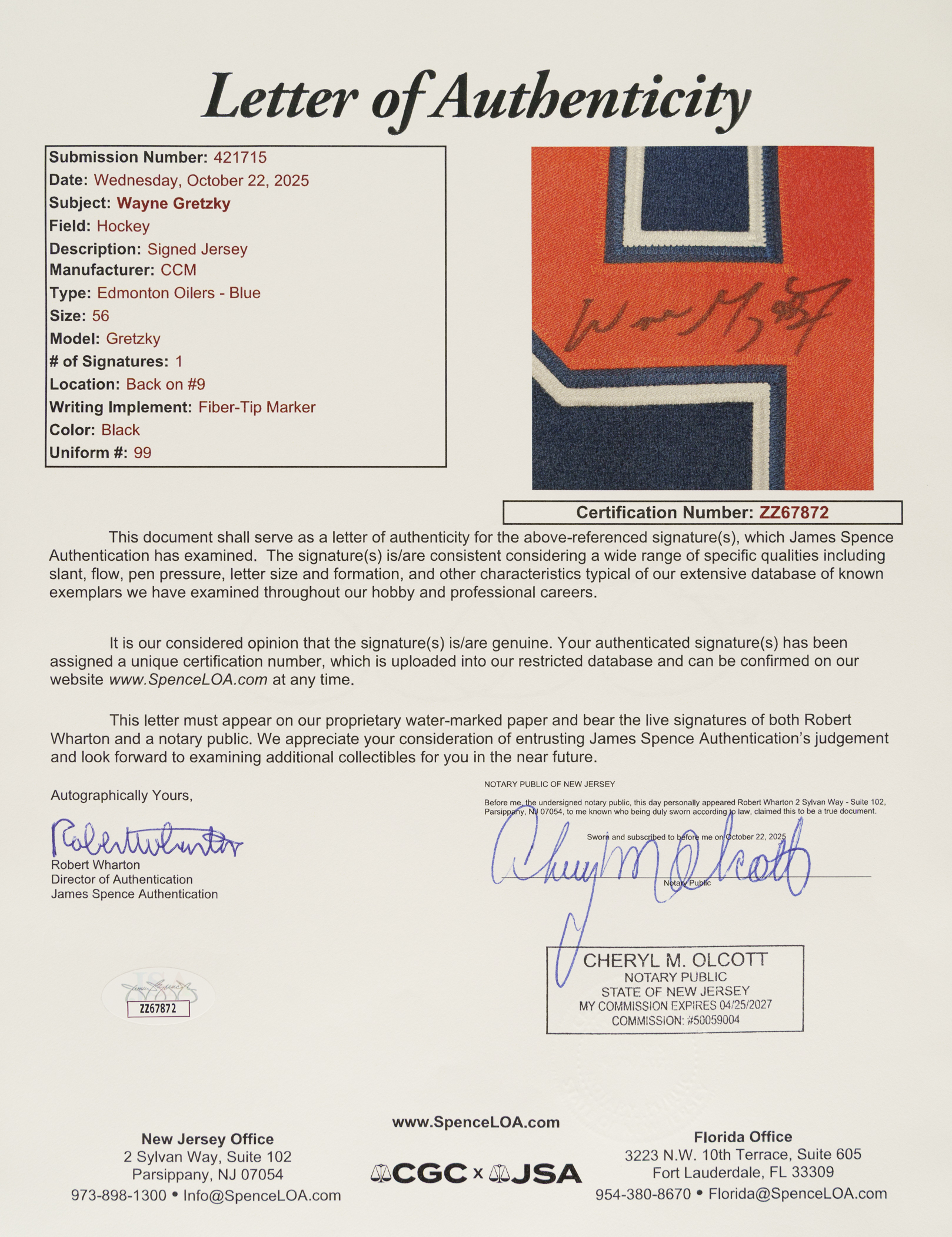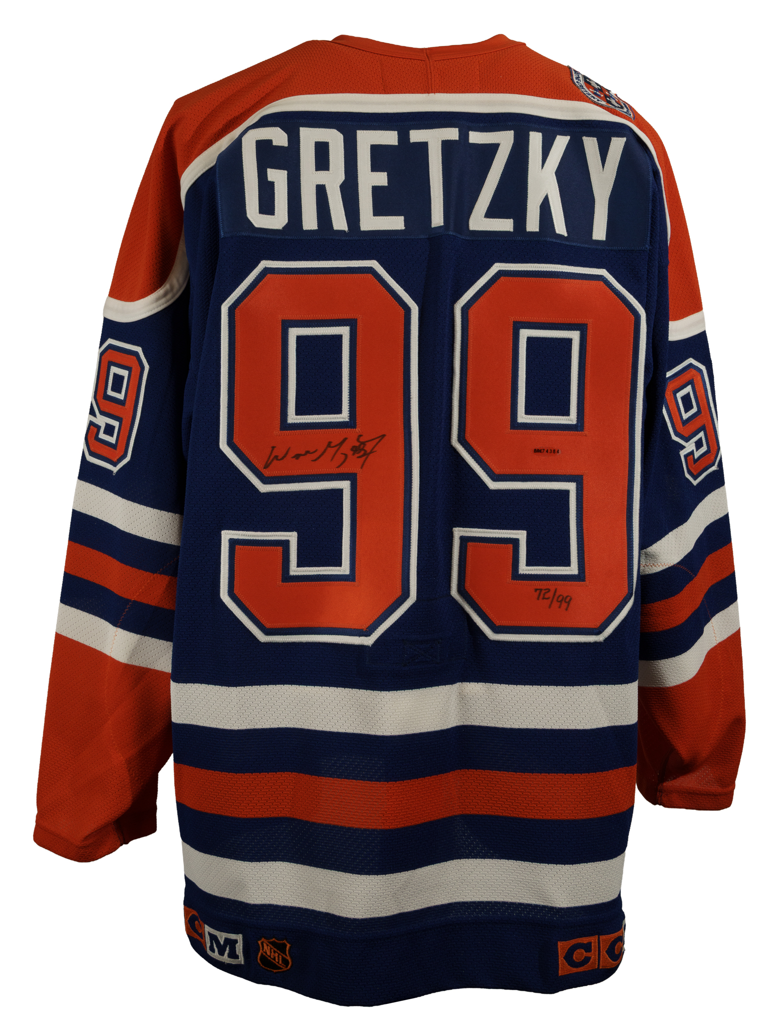 Wayne Gretzky Edmonton Oilers limited-edition commemorative jersey signed by Gretzky along the reverse in black marker. Numbered 72/99 on the reverse. The CCM jersey has its original manufacturing tags and is in Near Mint condition overall. Upper Deck COA and full LOA from James Spence/JSA.