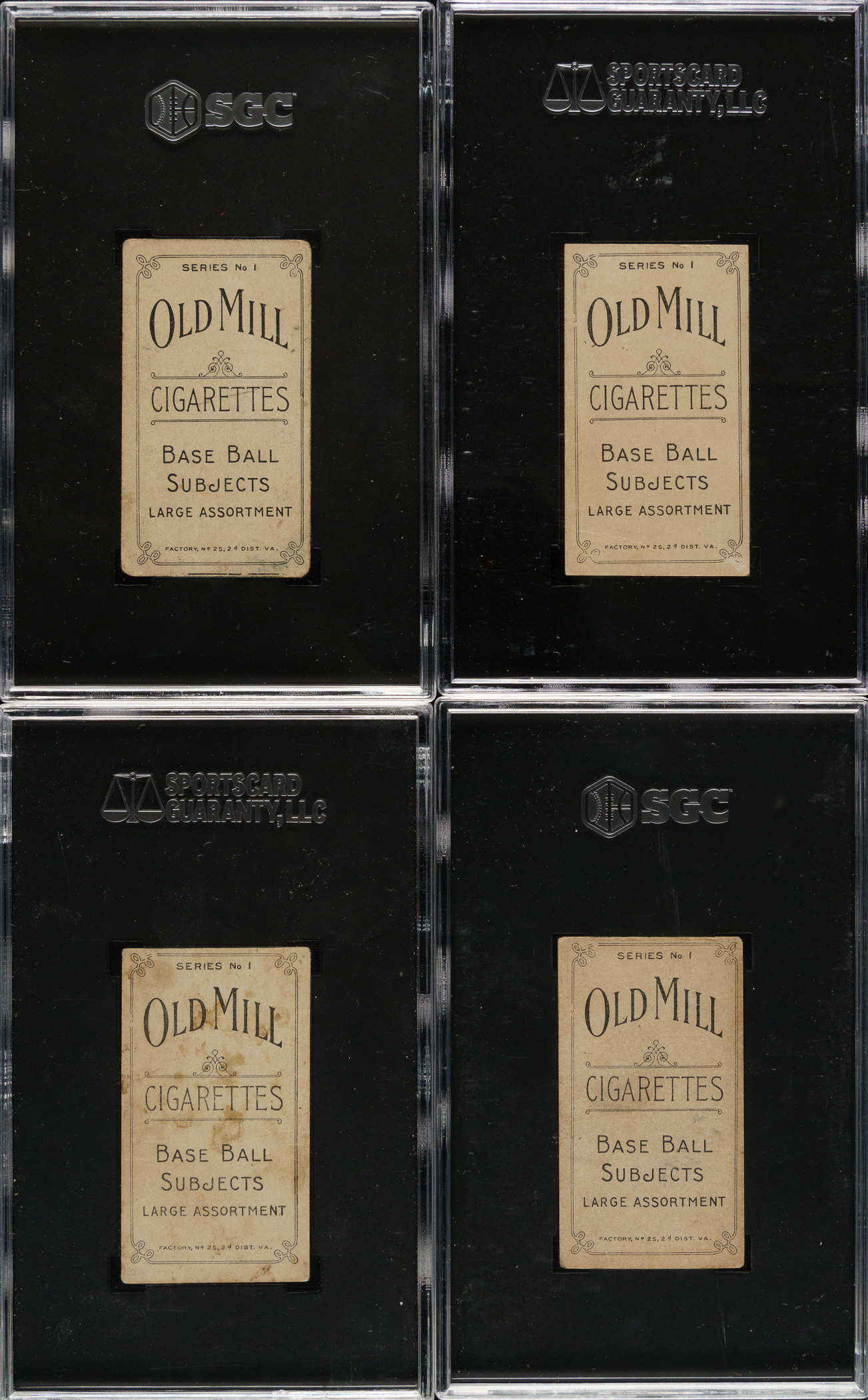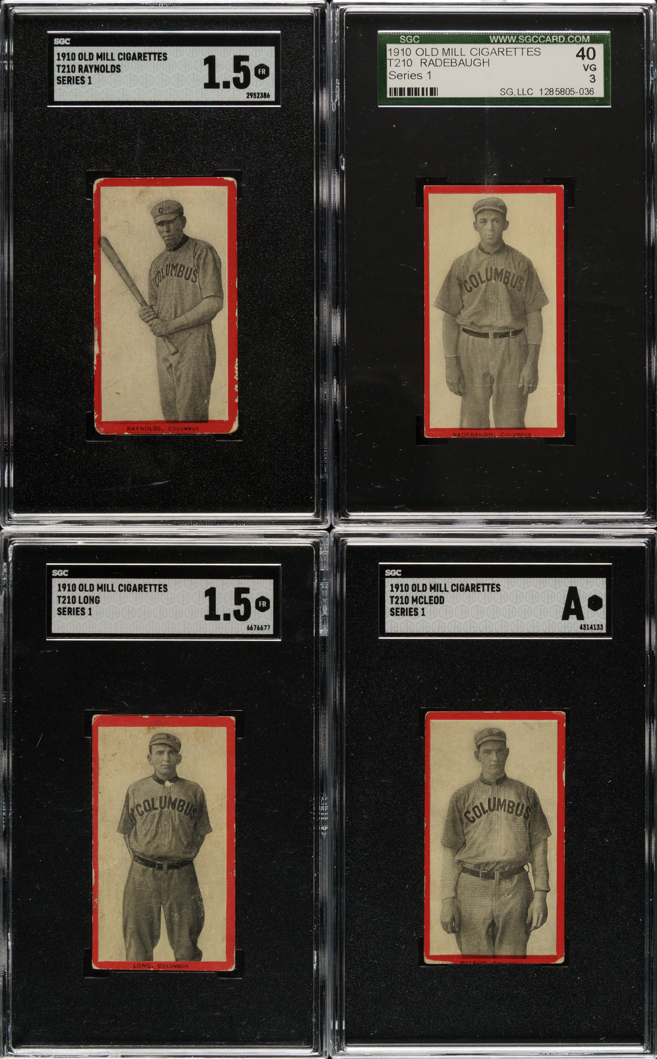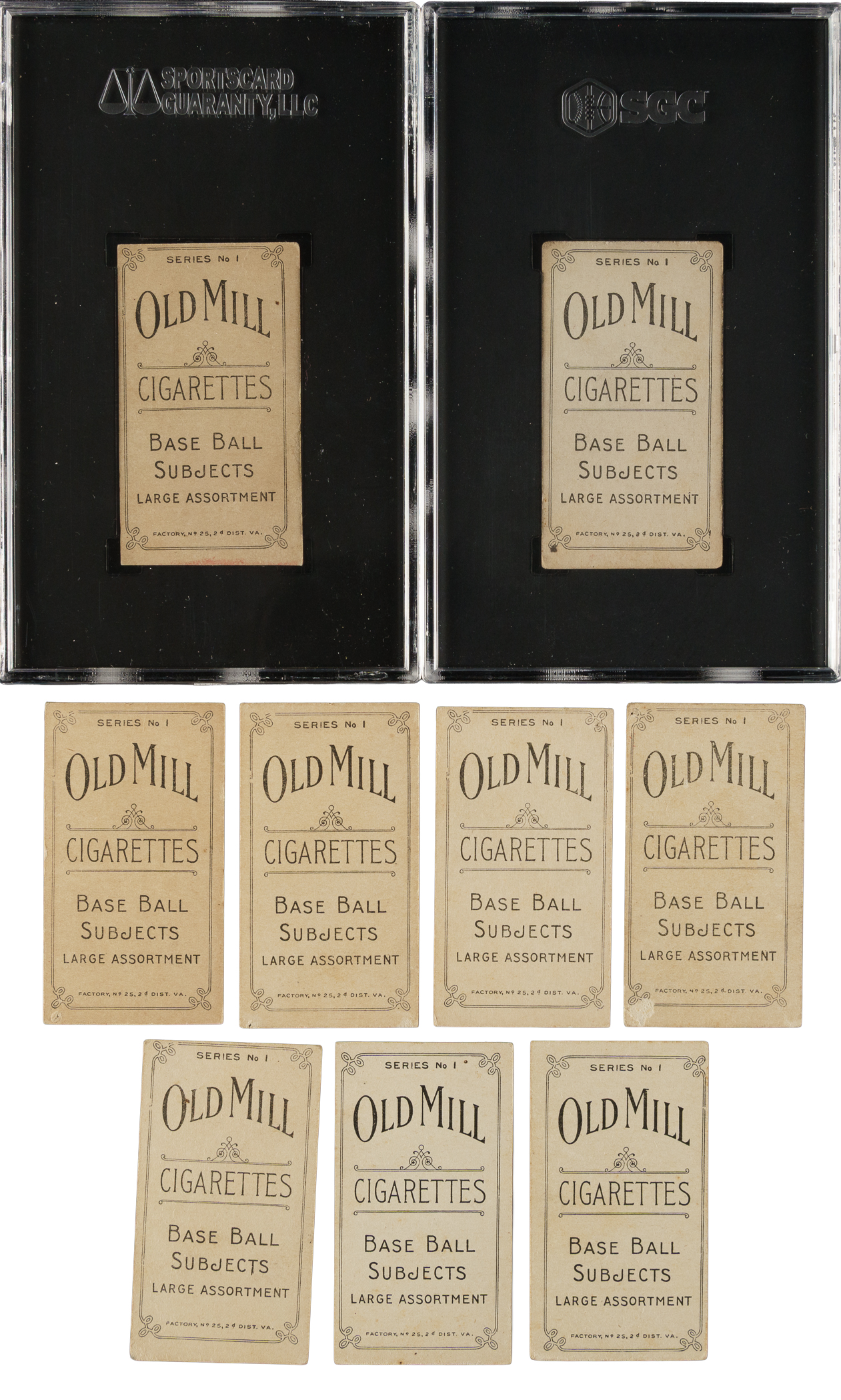 Collection of thirteen different 1910 T210 Old Mill Tobacco "Series 1" cards. The T210 Old Mill Tobacco set is composed of eight different series, each representing a different minor league. Series 1 features players of the South Atlantic League. Six cards have been professionally graded and encapsulated by SGC. This collection consists of the following: Becker (Pr), Bensen (Vg), Fox (Pr-Fr due to pinhole at bottom-right corner), Hartley (Authentic), Hille (Vg), Krebs (Authentic), Lewis (Pr-Fr due to pinhole at bottom-right corner), Long (FAIR 1.5), McLeod (Authentic), Radebaugh (VG 40), Raynolds (FAIR 1.5), Sisson (Pr), and Toren (Vg-Ex). T210 Old Mill Tobacco cards are among a small selection of elite sets that have long captured the imagination of many of the most legendary collectors. The reason many collectors prize these cards so highly is twofold: 1) These sets could not (and cannot) simply be purchased in set form. They are rare. They have to be collected. They are a challenge. 2) Ultimately, cards are about the players who are featured. Many of the players in T210 are featured in few or no other sets. These characteristics make the red-bordered T210 Old Mill set especially significant to the game of baseball and the world of baseball cards and especially appealing to the most sophisticated collectors. T210 Old Mill cards also have a very distinctive design with unique and very striking player poses. This is a very attractive medium- to lower-grade sampling of cards from this set. Total: 13 cards.