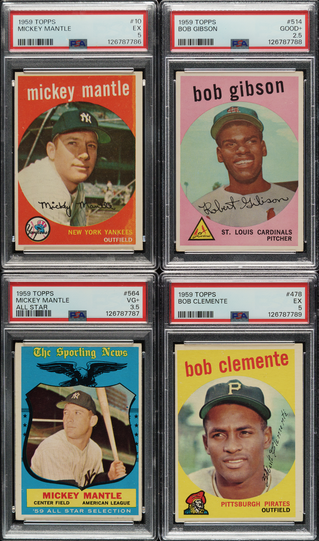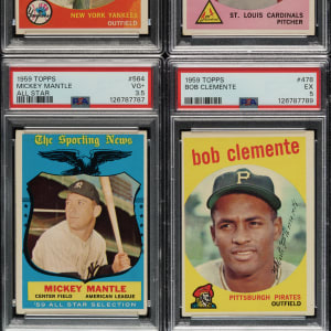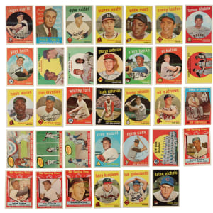 Very attractive and consistent complete set of 1959 Topps Baseball. The 1959 Topps set is highlighted by all the stars and Hall of Famers of the era, including the rookie card of St. Louis Cardinal HOFer Bob Gibson. Condition is 9% Ex-Mt to Nr/Mt (mostly Ex-Mt), 69% Vg-Ex to Ex, and 22% Gd to Vg (including 15 lesser, which are all pencil-marked team checklists). We have selected four cards for grading and encapsulation by PSA. Keys: #1 Frick (Vg), 10 Mantle (EX 5), 20 Snider (Vg+), 40a Spahn/1931 (Ex), 50 Mays (Vg-Ex), 150 Musial (Ex), 163 Koufax (Vg+), 180 Berra (Vg-Ex), 202 Maris (Ex due mostly to centering), 212 Fence Busters (Ex), 317 NL Hitting Kings (Ex-Mt), 321a Giallombardo/no optioned statement (Ex), 322a Hanebrink/no trade statement (Ex), 338 Anderson RC (Ex), 350 Banks (Vg-Ex), 360 Kaline (Vg-Ex+), 362a Nichols/no optioned statement (20/80 T/B, otherwise Ex-Mt), 380 Aaron (Vg-Ex), 387 Drysdale (Vg), 430 Ford (Ex), 435 F. Robinson (Vg-Ex), 439 B. Robinson (Ex), 450 Mathews (Vg-Ex), 461 Mantle Homer (Ex+), 464 Mays' Catch (Ex+), 467 Aaron Clubs Homer (5/95 T/B, otherwise Vg), 478 Clemente (EX 5), 509 Cash RC (Vg-Ex), 510 Yankees Team (partially erased pencil marks on reverse, otherwise Vg+), 514 Gibson RC (GOOD+ 2.5), 515 Killebrew (Ex), 543 Corsair Outfield Trio w/ Clemente (next card showing, otherwise Vg-Ex), 550 Campanella (Vg-Ex), 559 Banks AS (Vg), 561 Aaron AS (Vg-Ex+), 563 Mays AS (Vg-Ex), 564 Mantle AS (VG+ 3.5), and 571 Spahn AS (Vg). Attractive mid-grade complete sets of classic issues from the 1950s such as this always generate tremendous collector interest. This is the type of vintage set that to many collectors represents the very best value. Total: 572 cards.